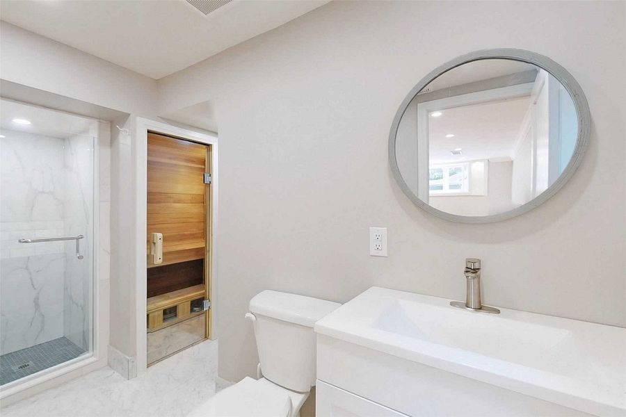 • Modern bathrooms featuring Calacatta tile and a sauna for relaxation.