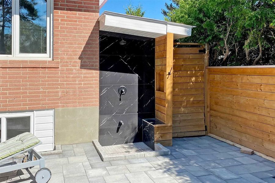 • Private backyard with a gazebo, swimming pool, and dressing room.