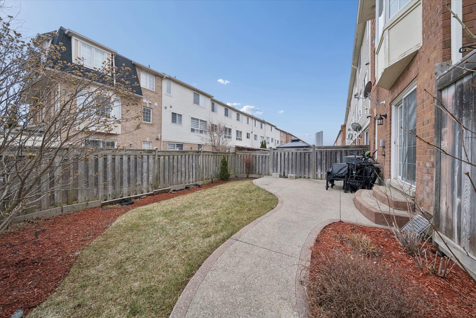 • Fully fenced yard with perennial gardens and a concrete walkway.