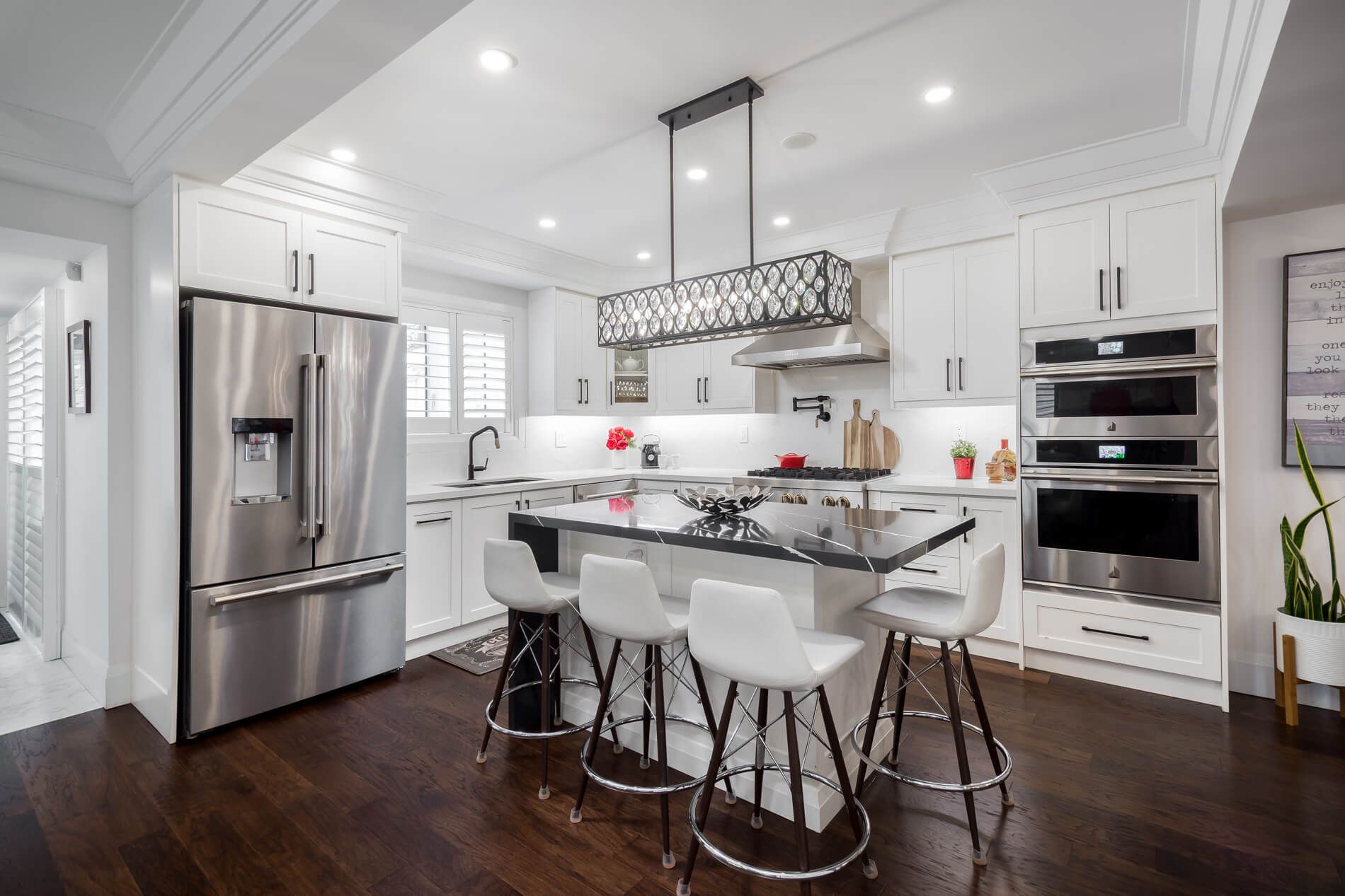 • Modern kitchen with top appliances, large island, and quartz counters.