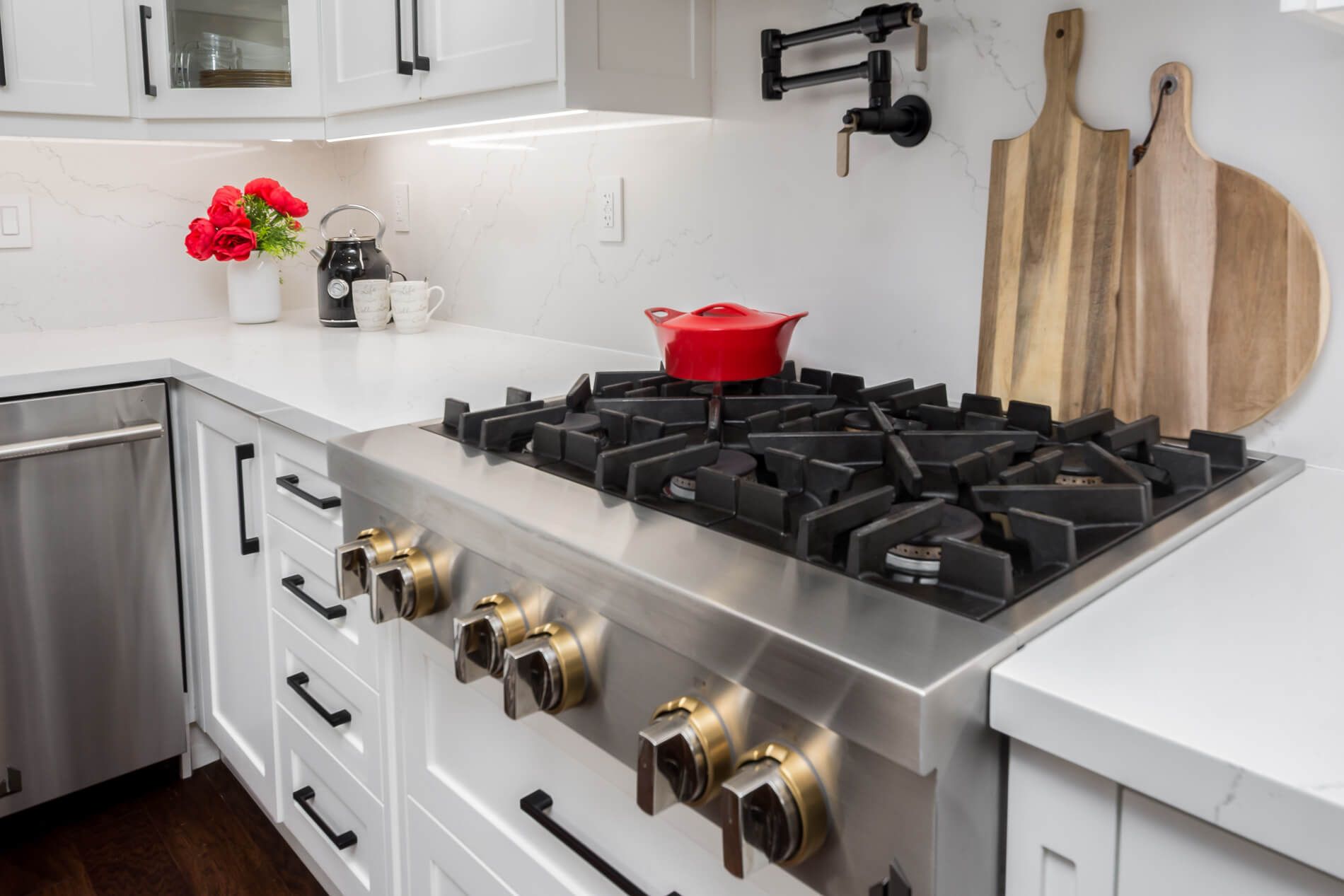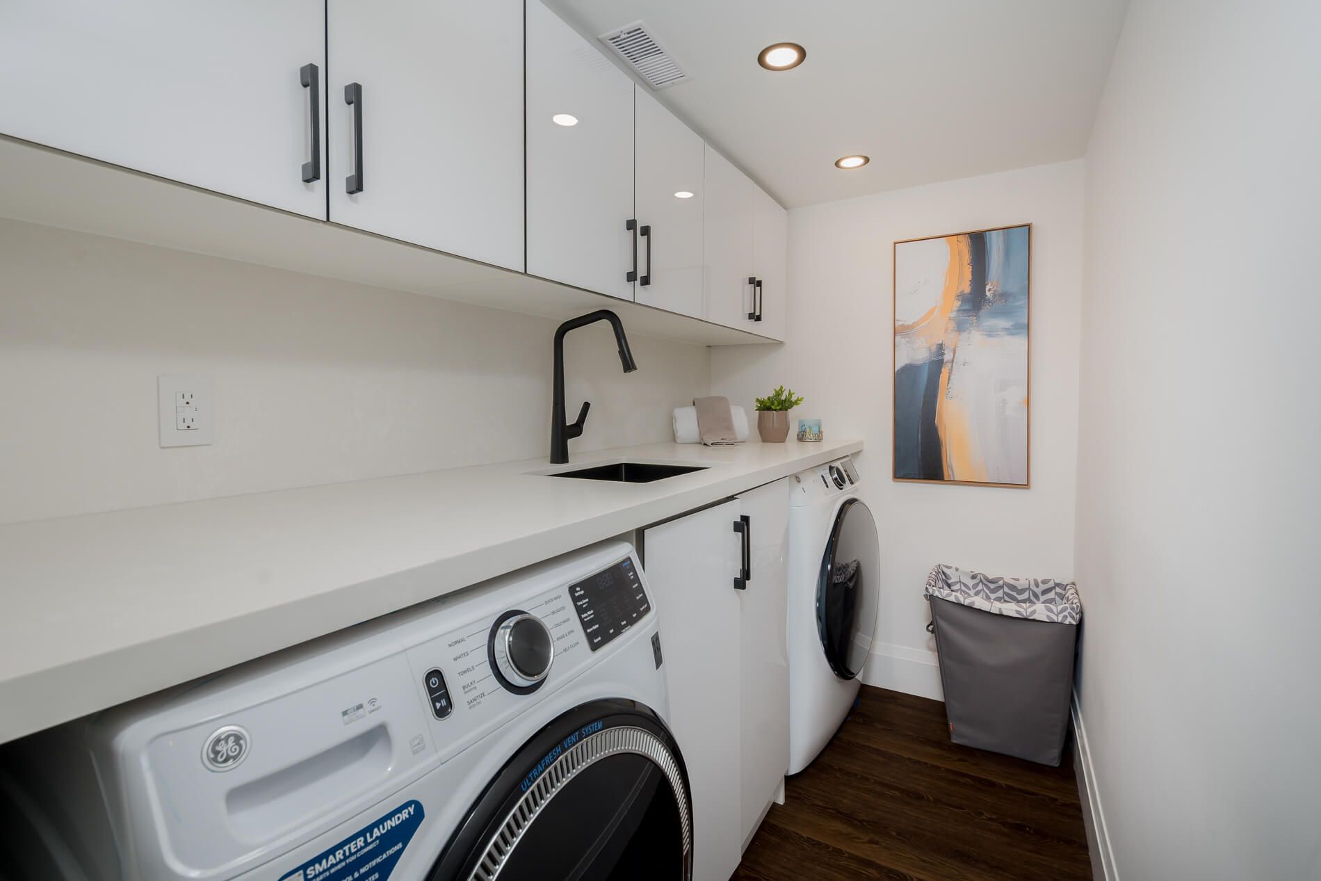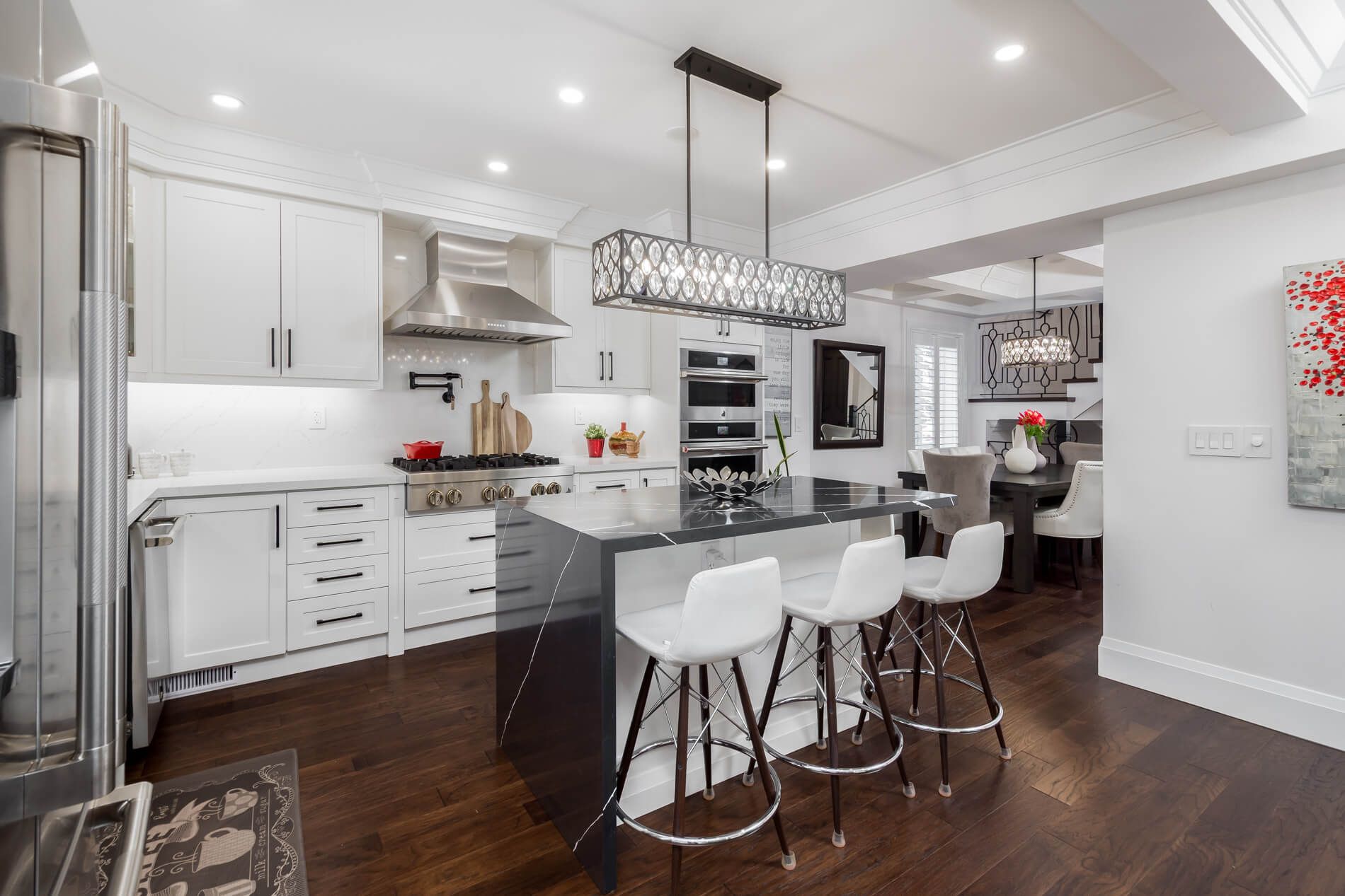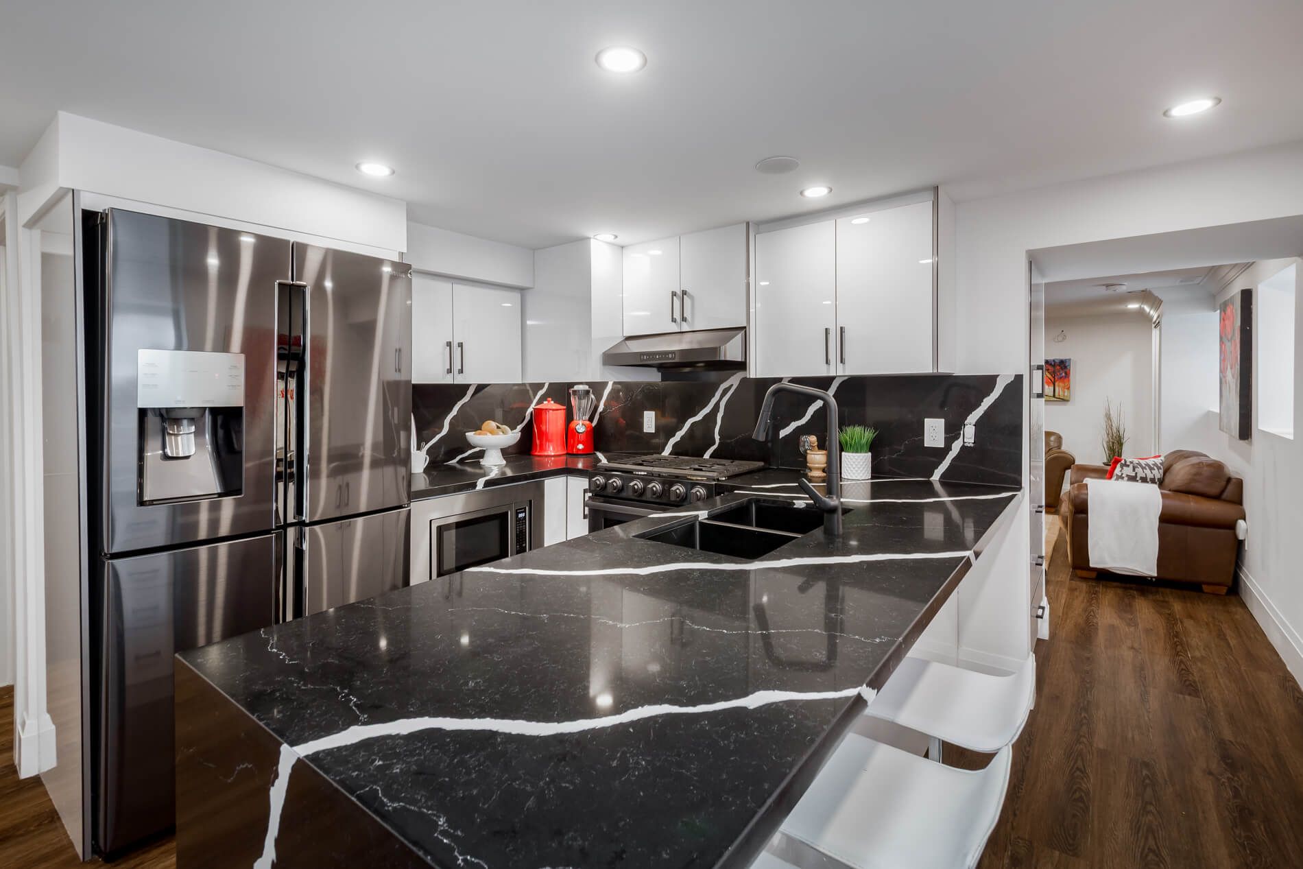 • Modern kitchen features top appliances, quartz countertops, and a large center island.