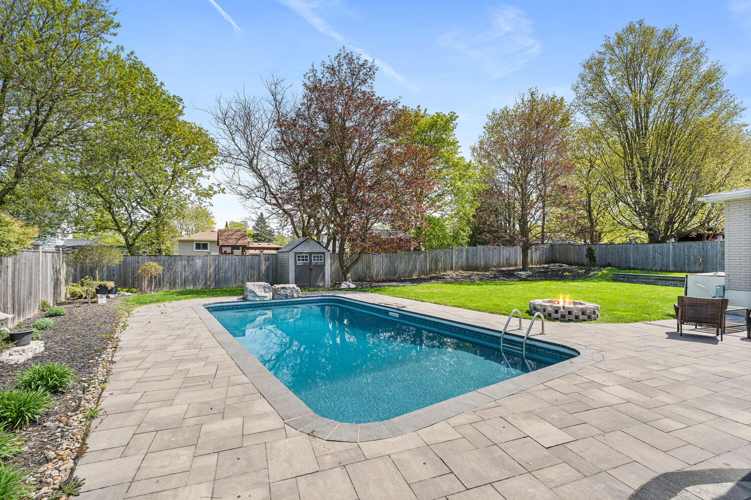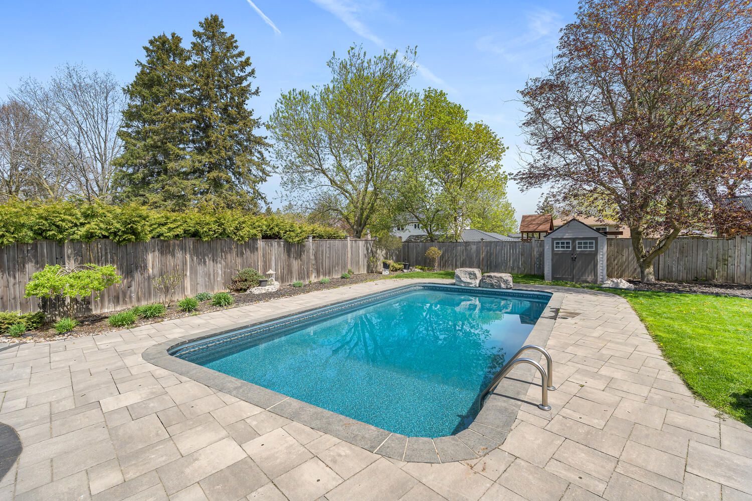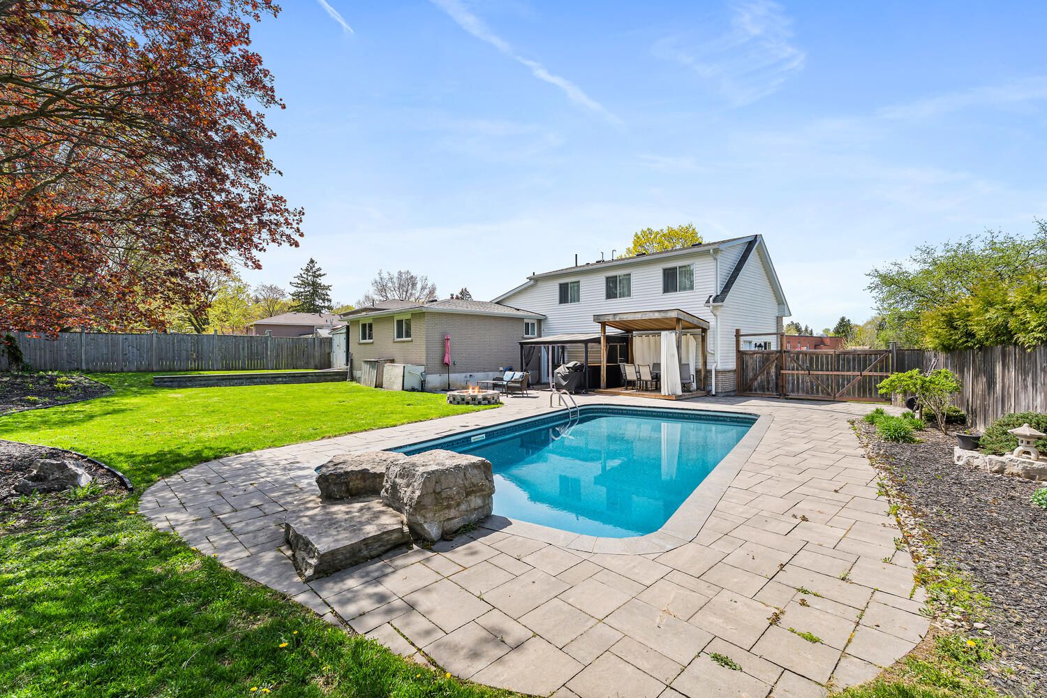 • Private inground salt water pool and landscaped spa tub for summer fun.