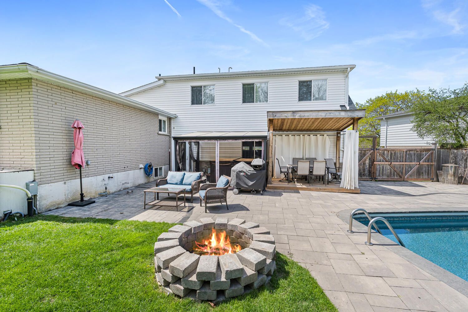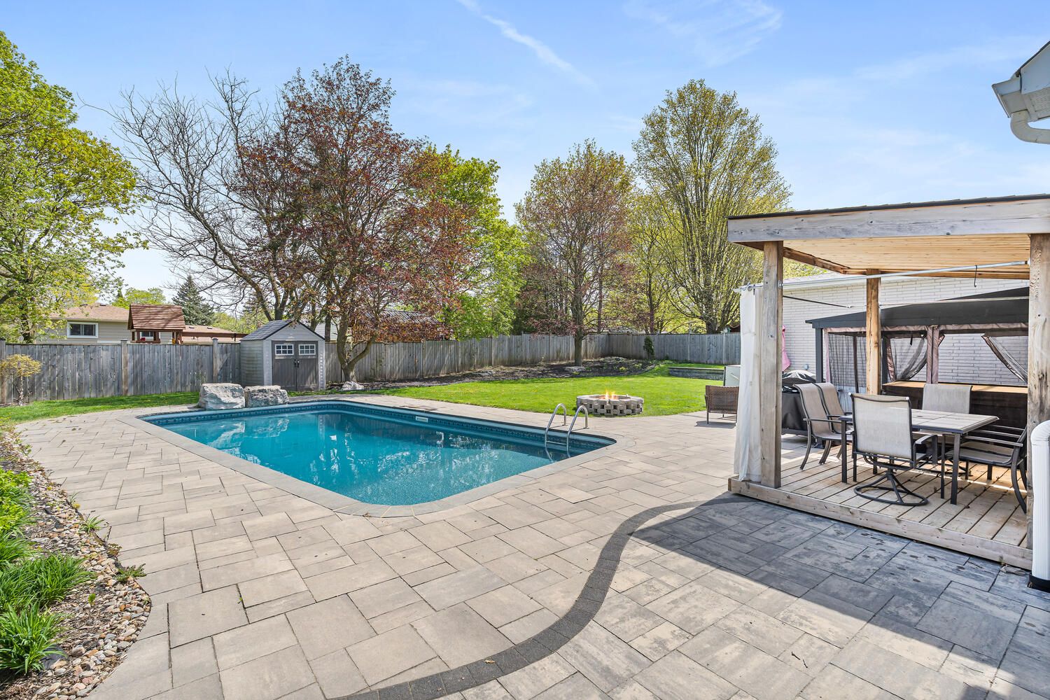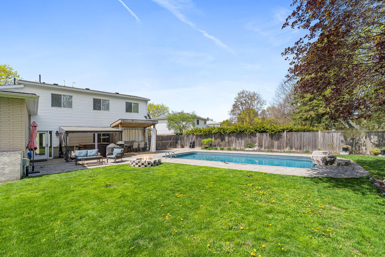• Private inground salt water pool and landscaped spa tub for summer fun.