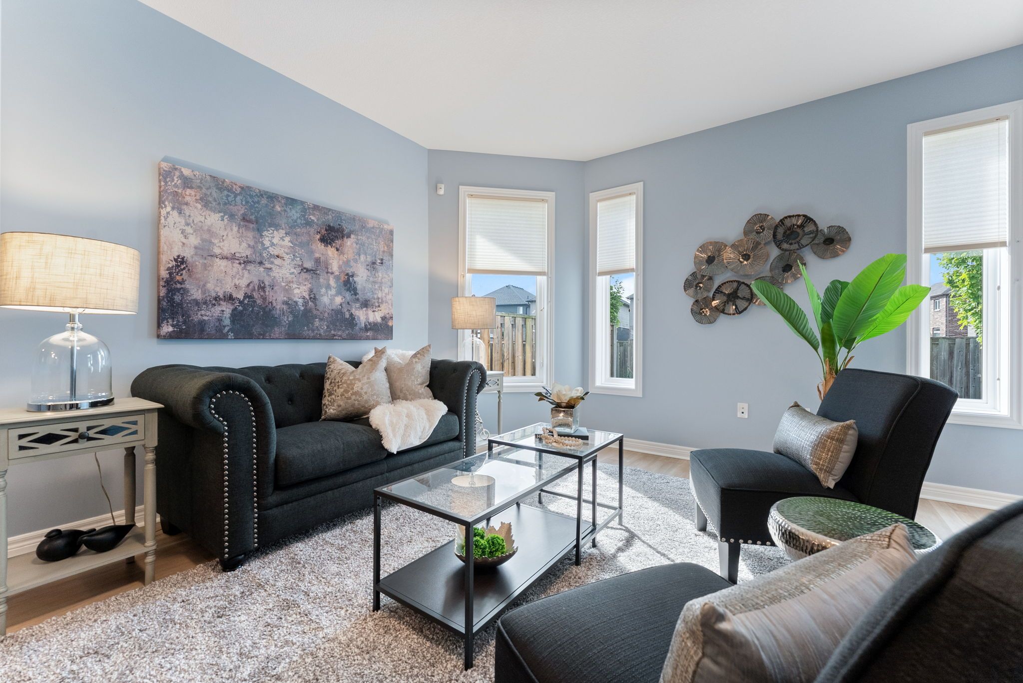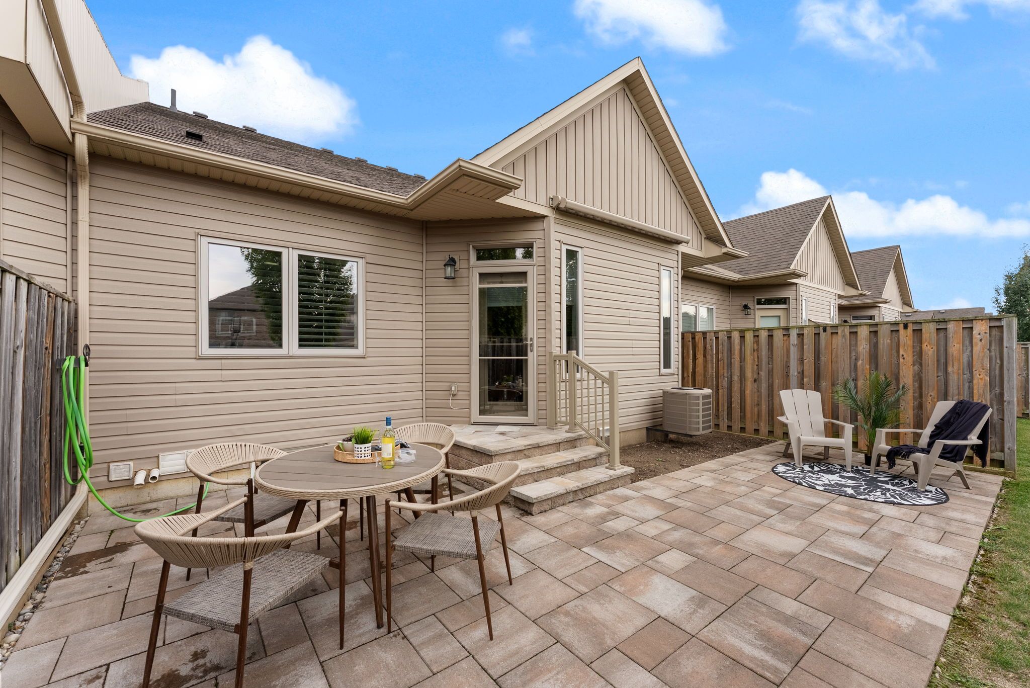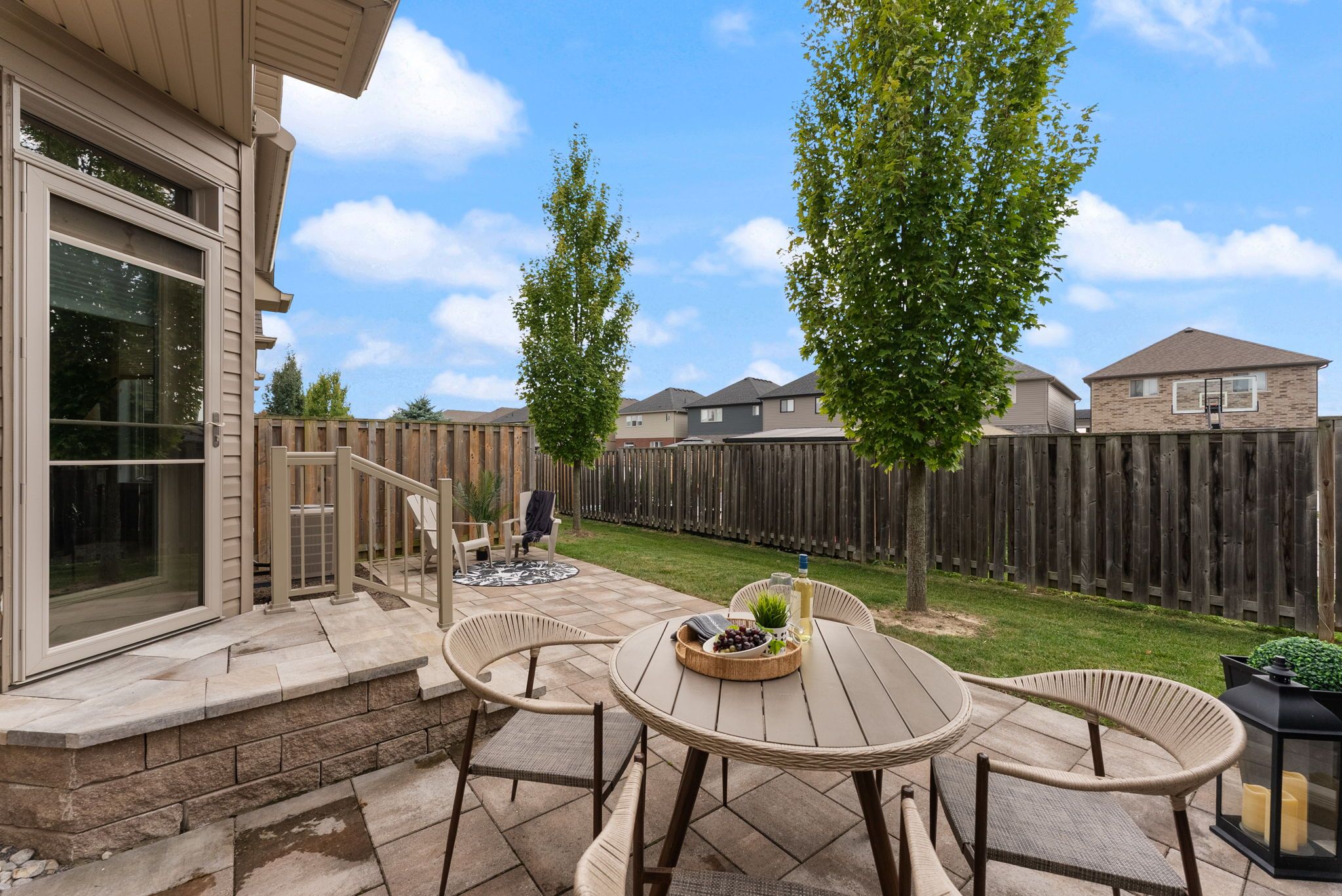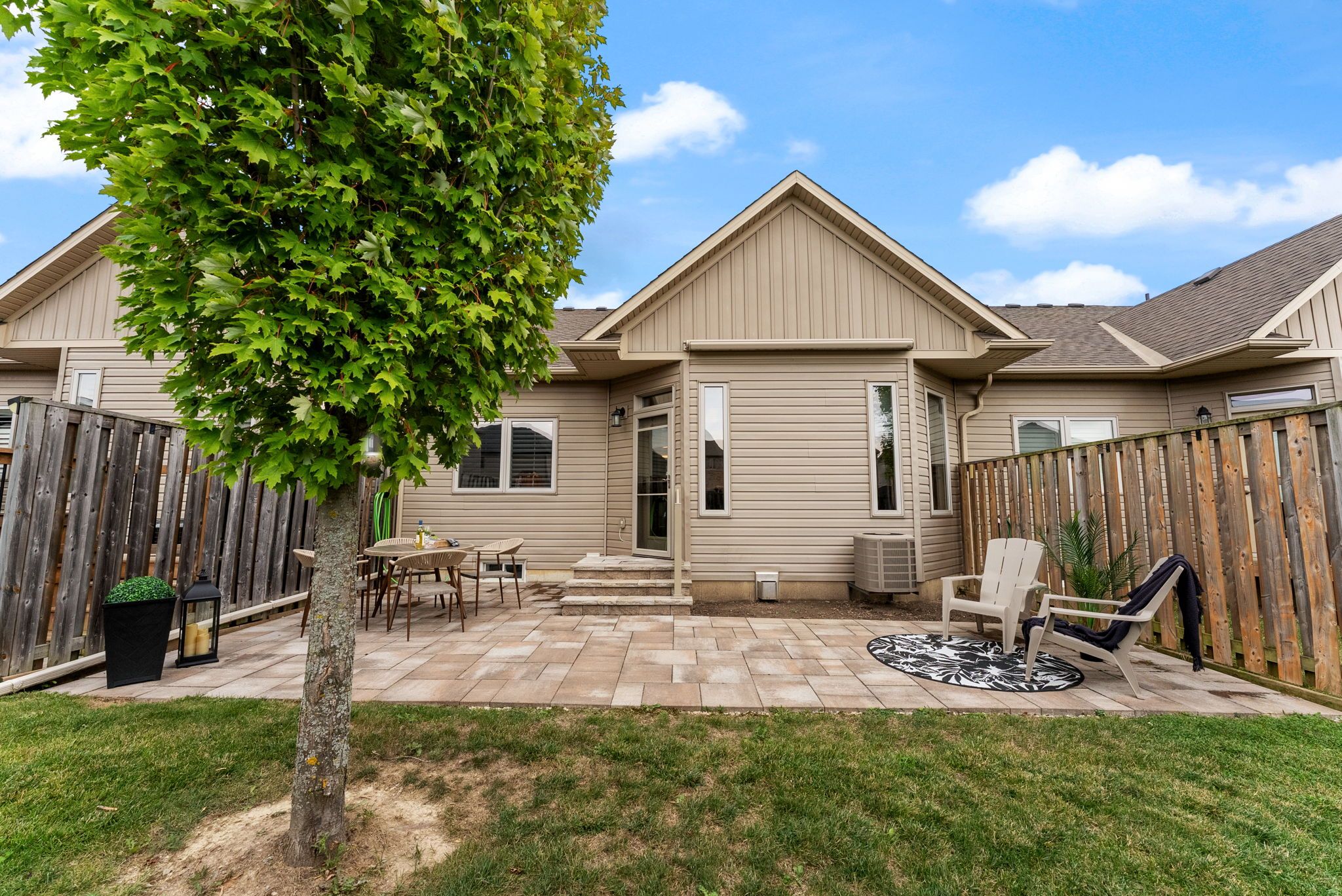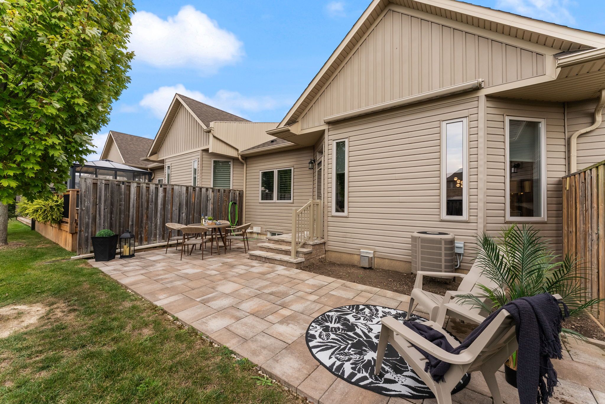 • Private backyard oasis with stone pavers and an awning for relaxation.