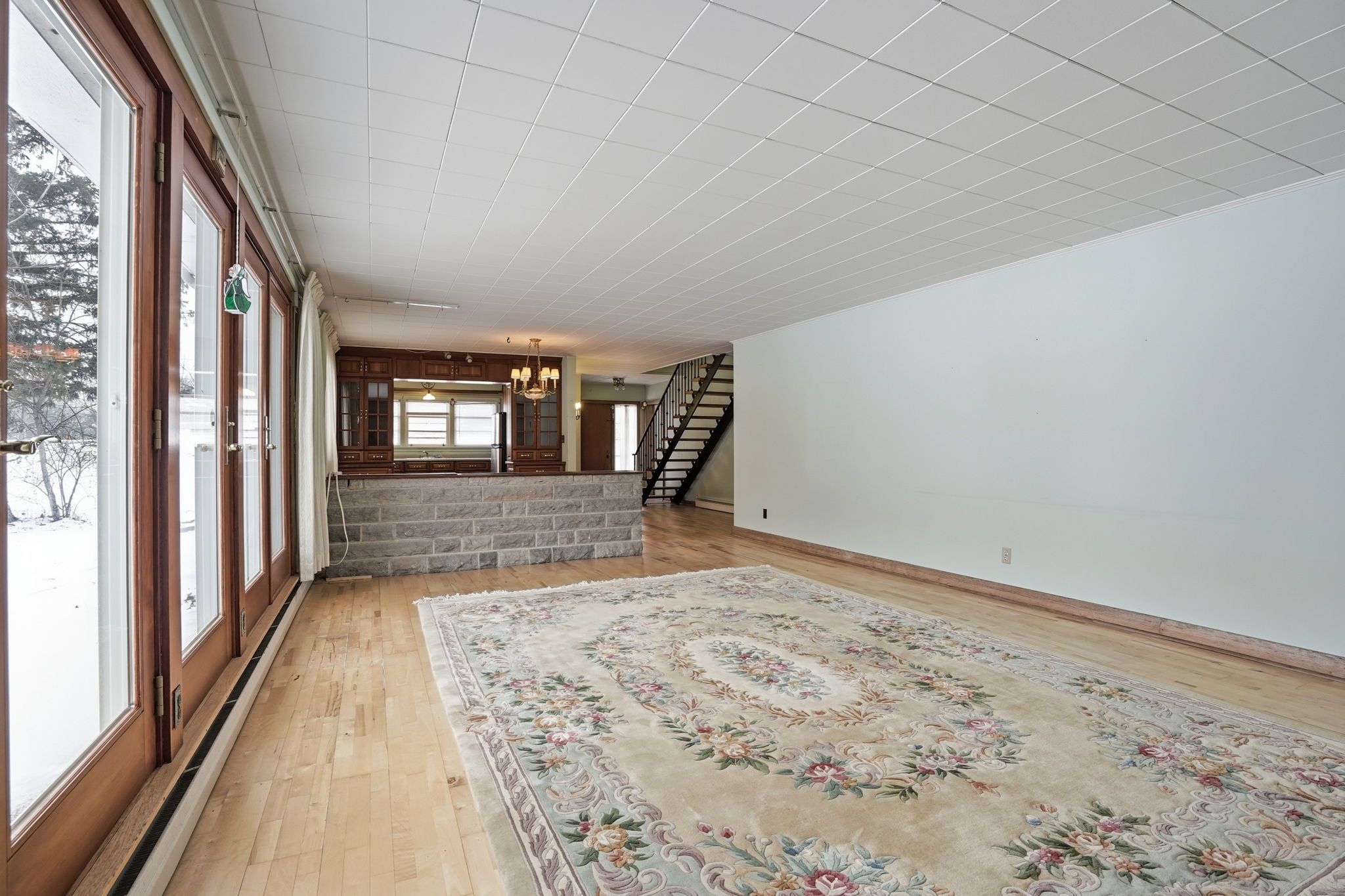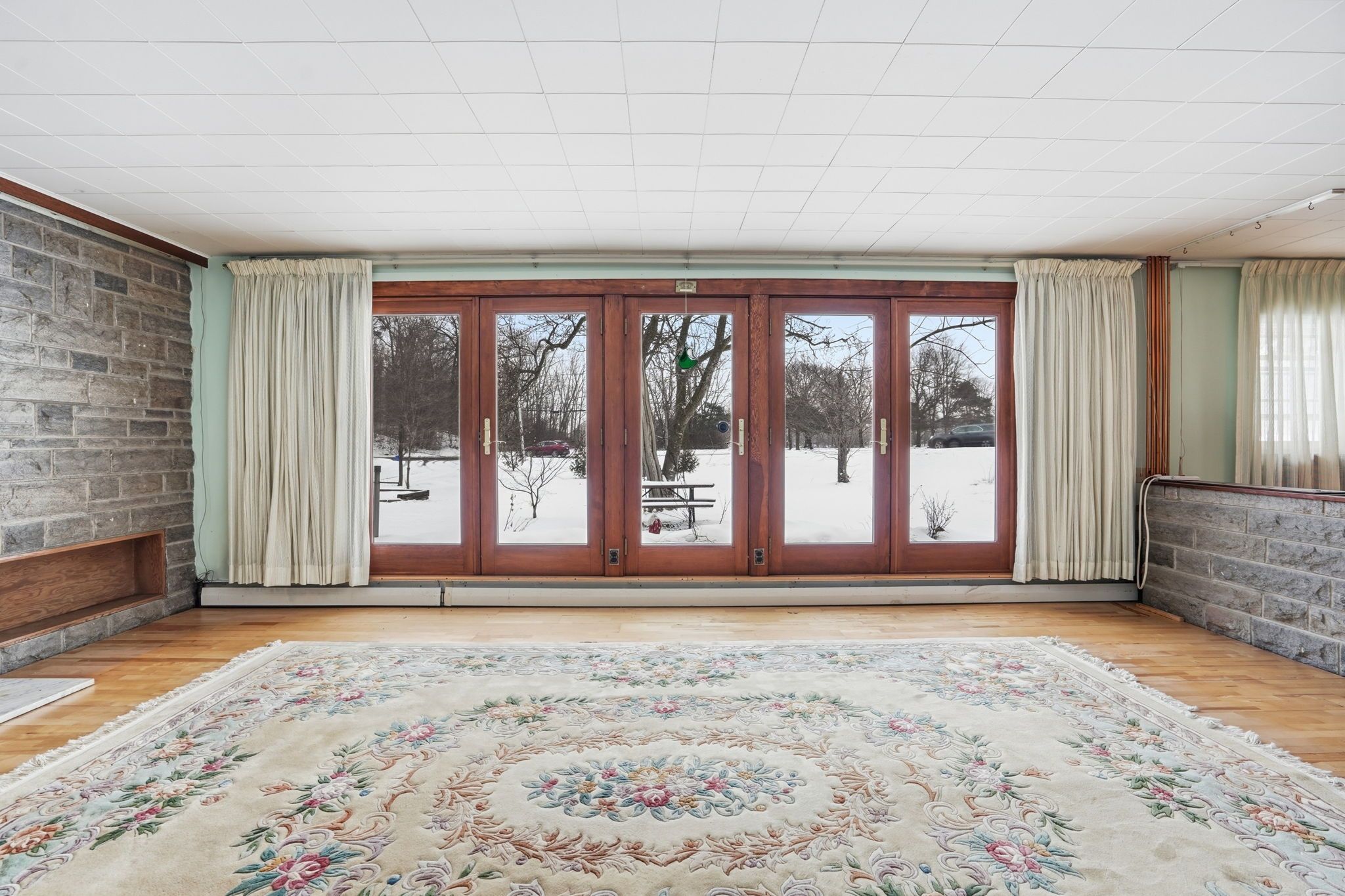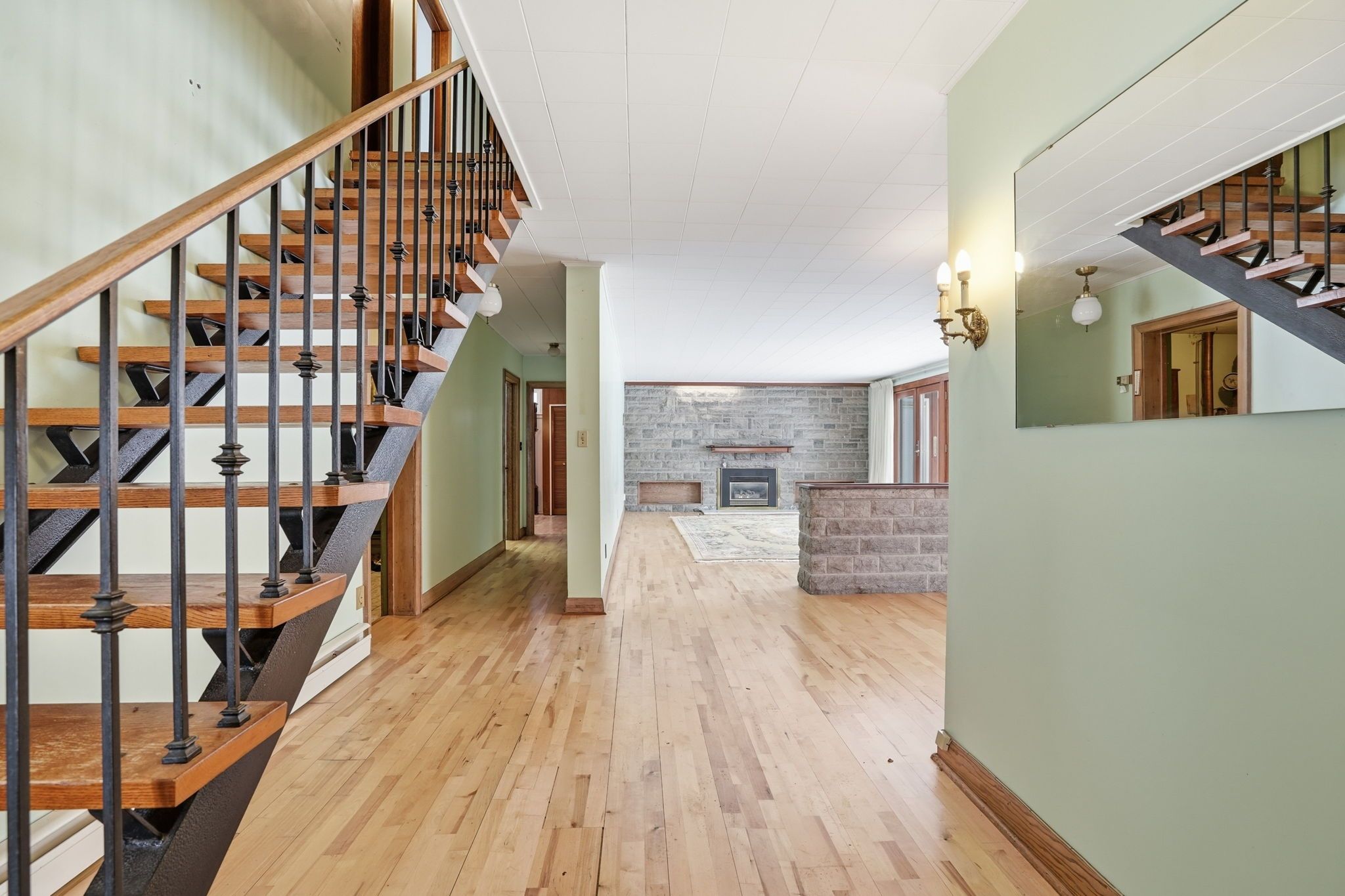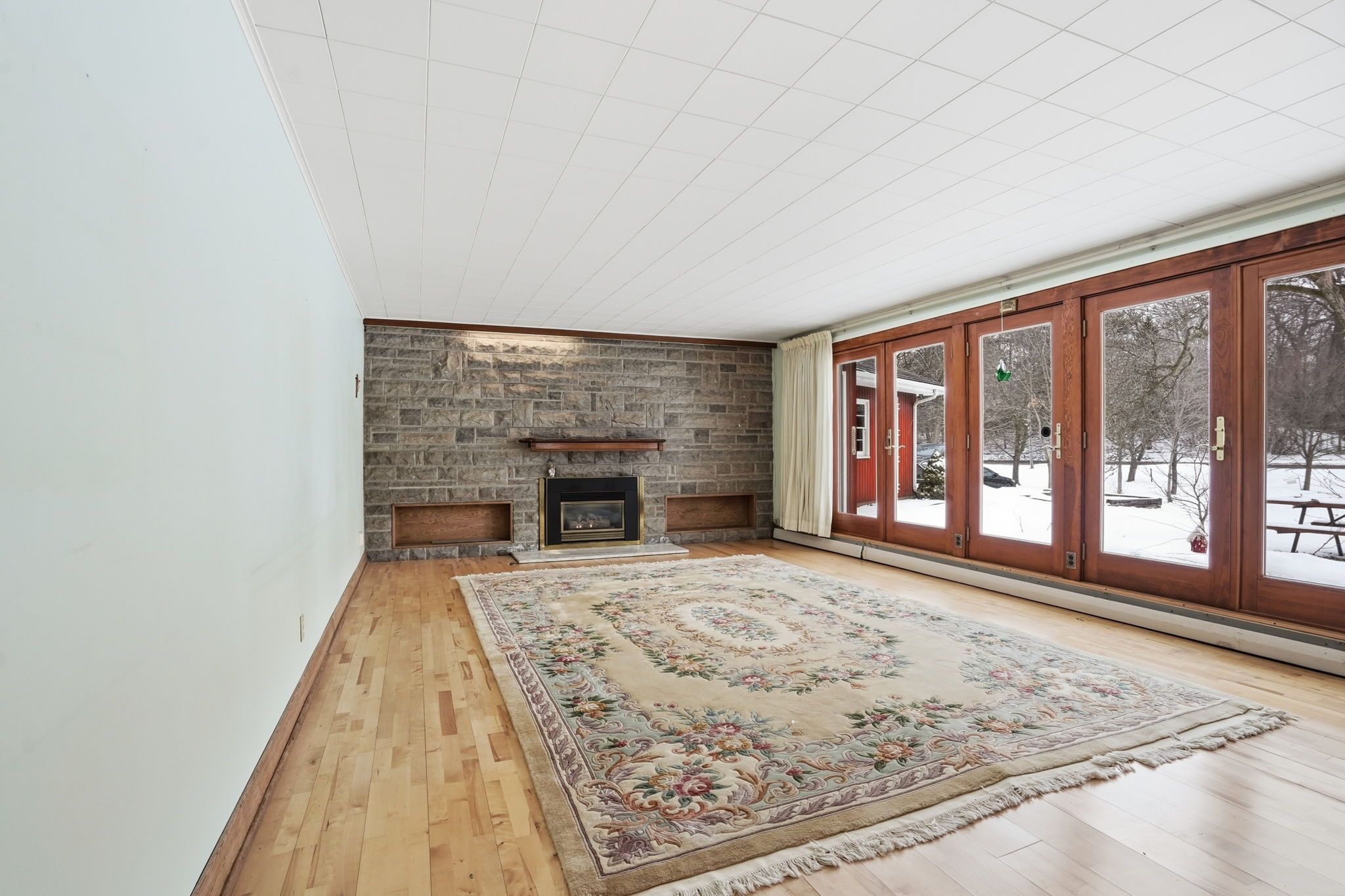 • Striking stone fireplace wall enhances the living space's character.