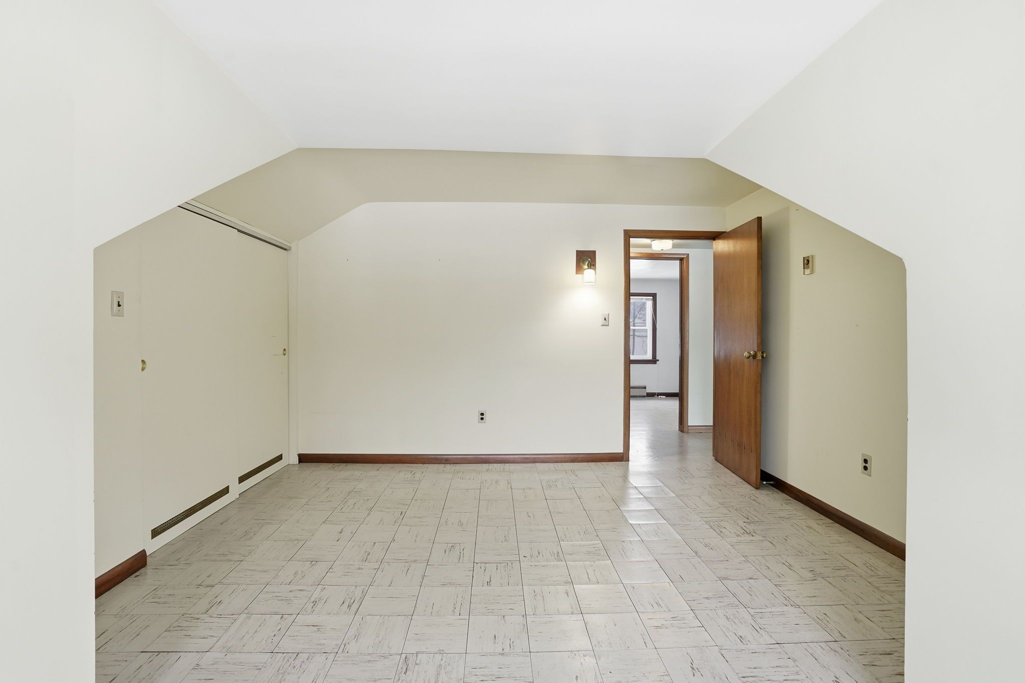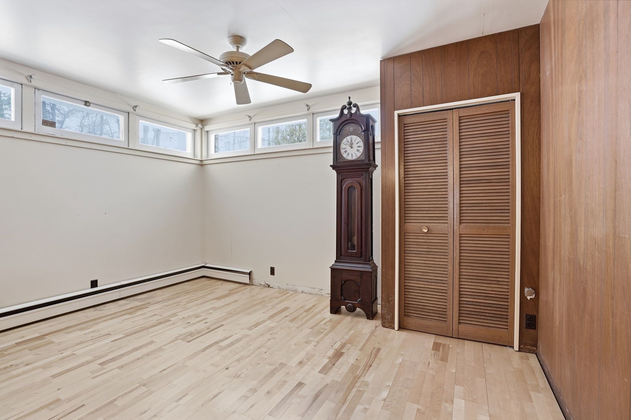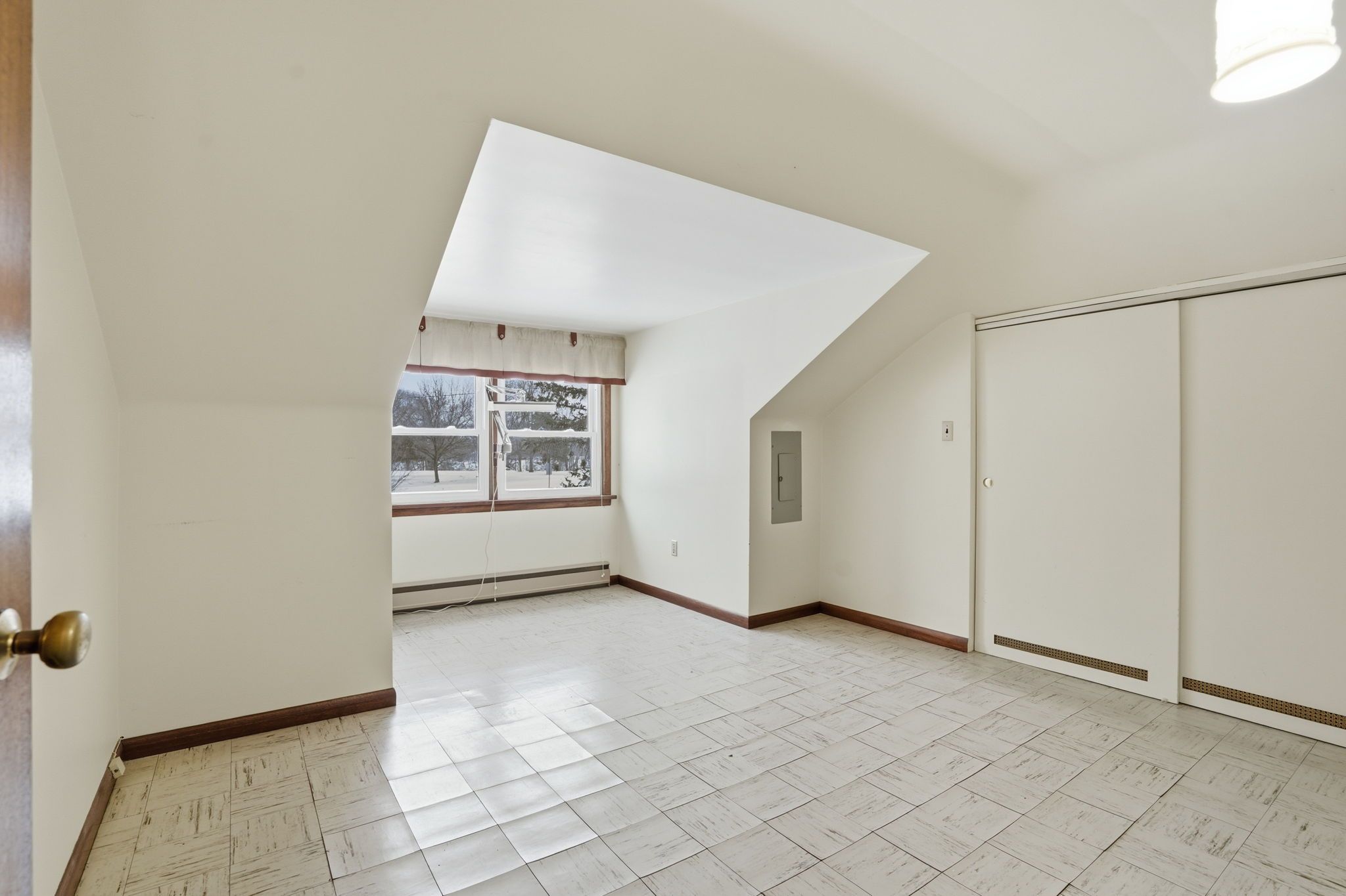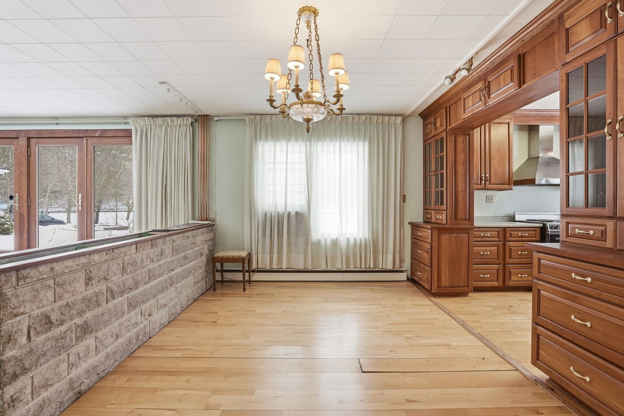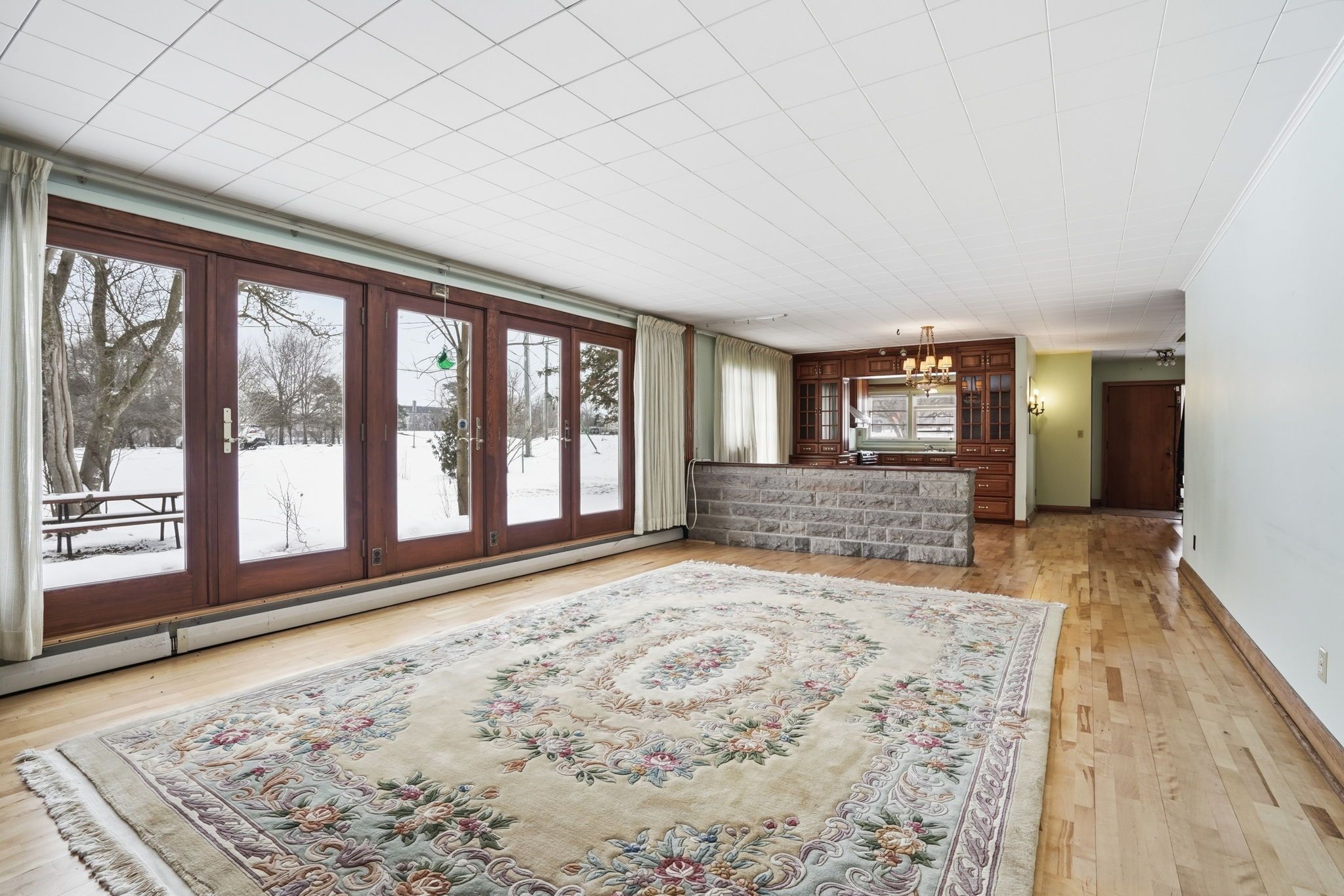 • Striking stone fireplace wall enhances the living space's character.