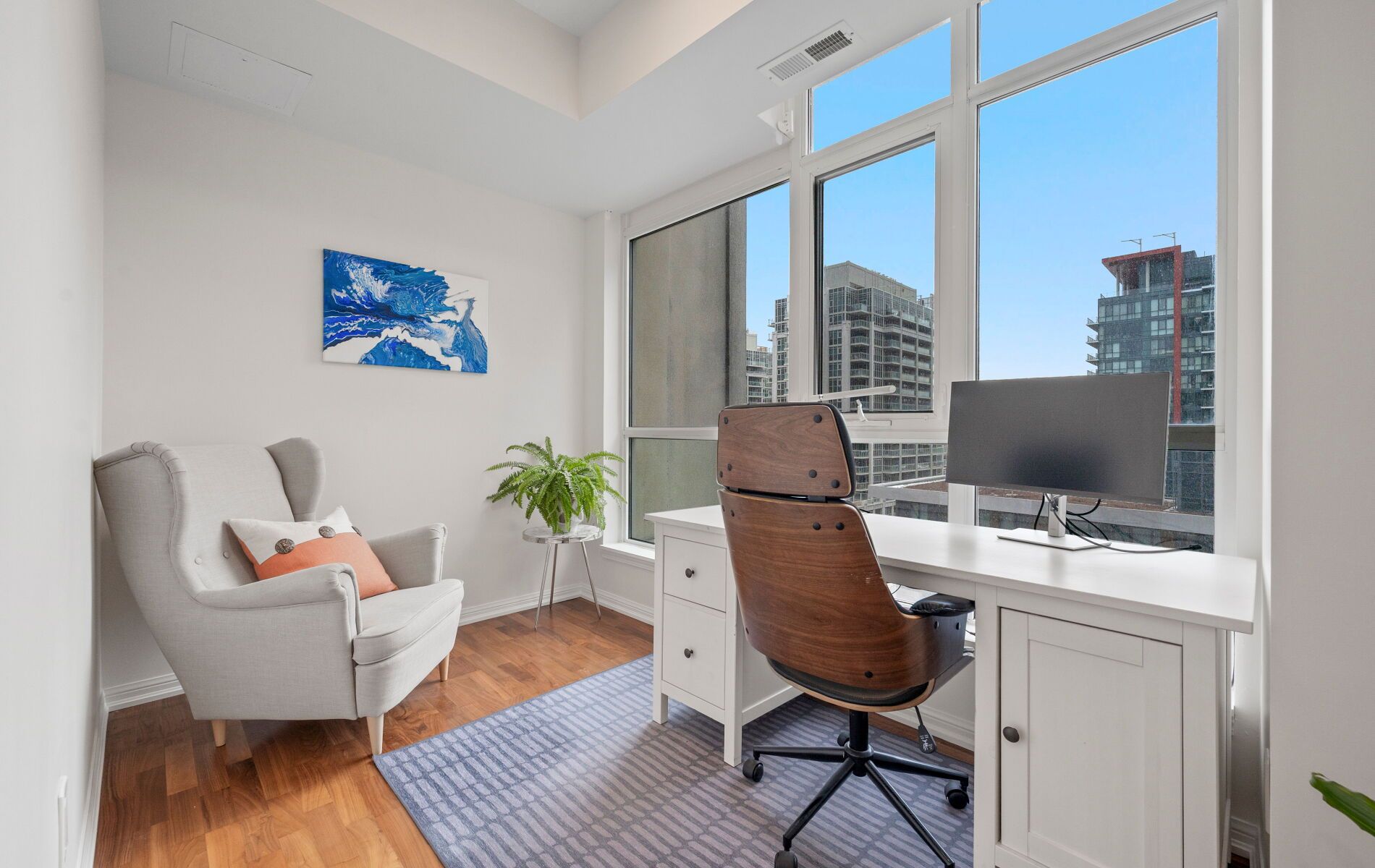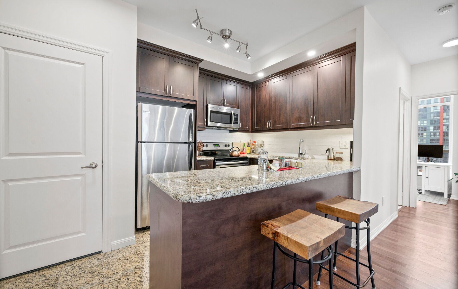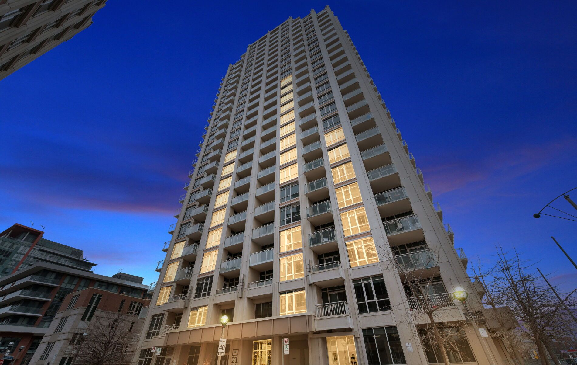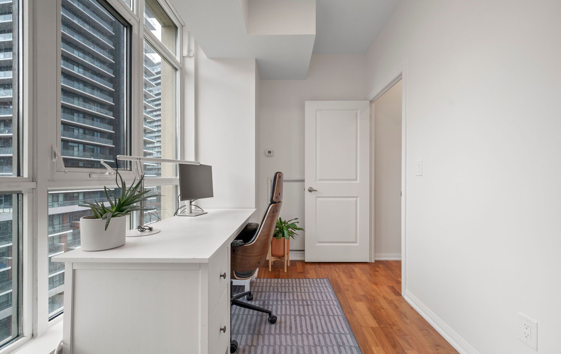 Try the restyle tool on each photo!! Serenity, light, and community - this suite in this building has it all. Listed as 2 bedrooms/2 full bathrooms, it can be a home with 3 bedrooms. Situation on the 9th floor overlooking a stylish inner courtyard and surrounded by the pulse of the neighbouring buildings. Updated and move-in ready for you! Professionally smoothed ceilings, quality painted throughout, new ceiling light fixtures that offer a lovely amber light option for evenings, and daylight brightness for your day. With a fun flick of the switch, the mood meets the moment. The floor plan has a split layout. This feature thoughtfully separates the principal suite from the other bedroom and 3-piece full bathroom area. The den has a door, in addition to floor-to-ceiling windows, and has been used as a 3rd bedroom. The primary bedroom suite includes 2 closets, a 4-piece ensuite, and a private balcony. Your other personal space includes a huge locker [approx. 12' x 7' x 8' (height)]. Located behind your private locked door at your parking spot. Deluxe! The stunning art deco-inspired inner courtyard is fabulous in all seasons. It leverages style, functionality, community, and serenity. Fully landscaped with trees, seating areas, and bbq stations. The winter scene as viewed from suite 908, with snow on the ground, was architecturally striking. Just wait until all those trees pop their leaves! Other amenities are located on the 11th floor and seem endless: a curated indoor pool room feels like luxury. See the pictures! Nicely furnished, large resident lounge that is linked to a dining area for catered events. Large and fully equipped gym with windows. Smaller yoga room for lighter or different forms of exercise. Guest suites. I can't say enough about this community pocket. Everything is walkable - easily 10 minutes or less. This is a transit hub area that embraces a community design. Every necessity and recreational opportunity imaginable is found here.