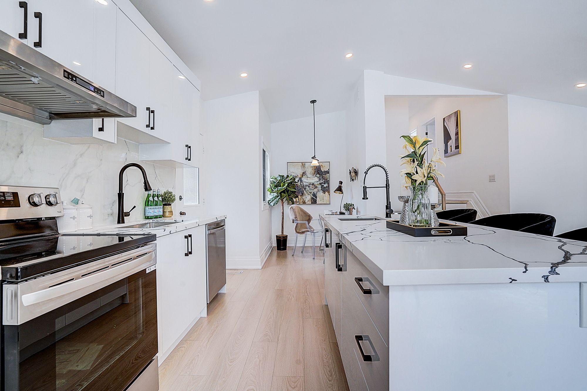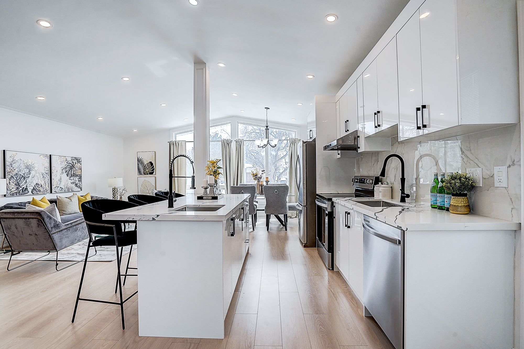 • Stylish open-concept layout with a modern kitchen and large island.