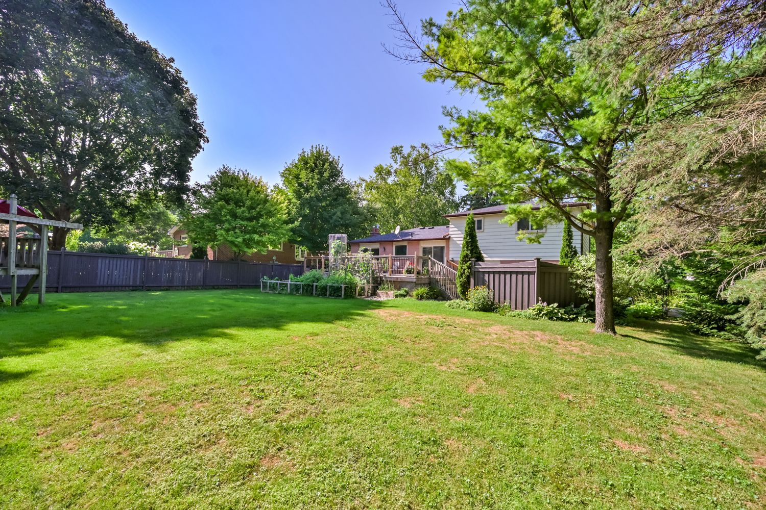 Welcome to this charming and versatile home situated on an expansive and beautifully landscaped 0. 38-acre lot. Offering endless possibilities, this property is perfect for families, investors, or anyone looking to customize their dream home. Step inside to a bright and inviting combined living and dining room featuring rich hardwood floors and large windows that fill the space with natural light. The eat-in kitchen is functional and spacious, boasting wall to wall cabinetry with a built- in desk and two walkouts to a large deck, making outdoor dining and entertaining a breeze. With three generously sized bedrooms, it is ideal for growing families. A finished walk-up basement offers additional living space with a large recreation room and 3pc bathroom. Love the outdoors? You'll be impressed by the massive, private backyard, a true retreat with a children's play area, mature trees, and lush greenery. There's more than enough space to host summer barbecues, garden to your hearts content, or simply relax and enjoy the peace and quiet. Conveniently located close to schools, parks, shopping, and transit, this home combines suburban serenity with city accessibility.