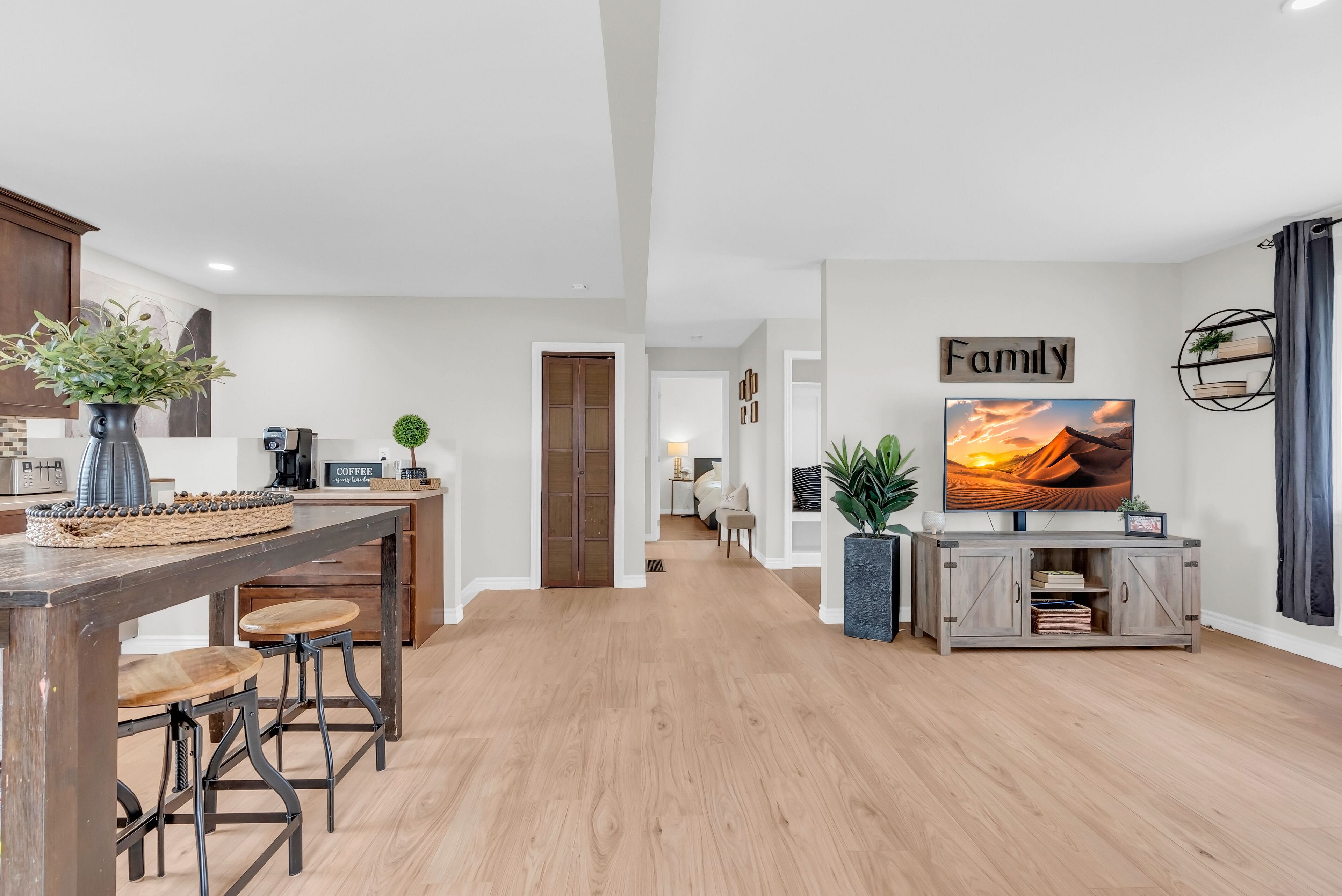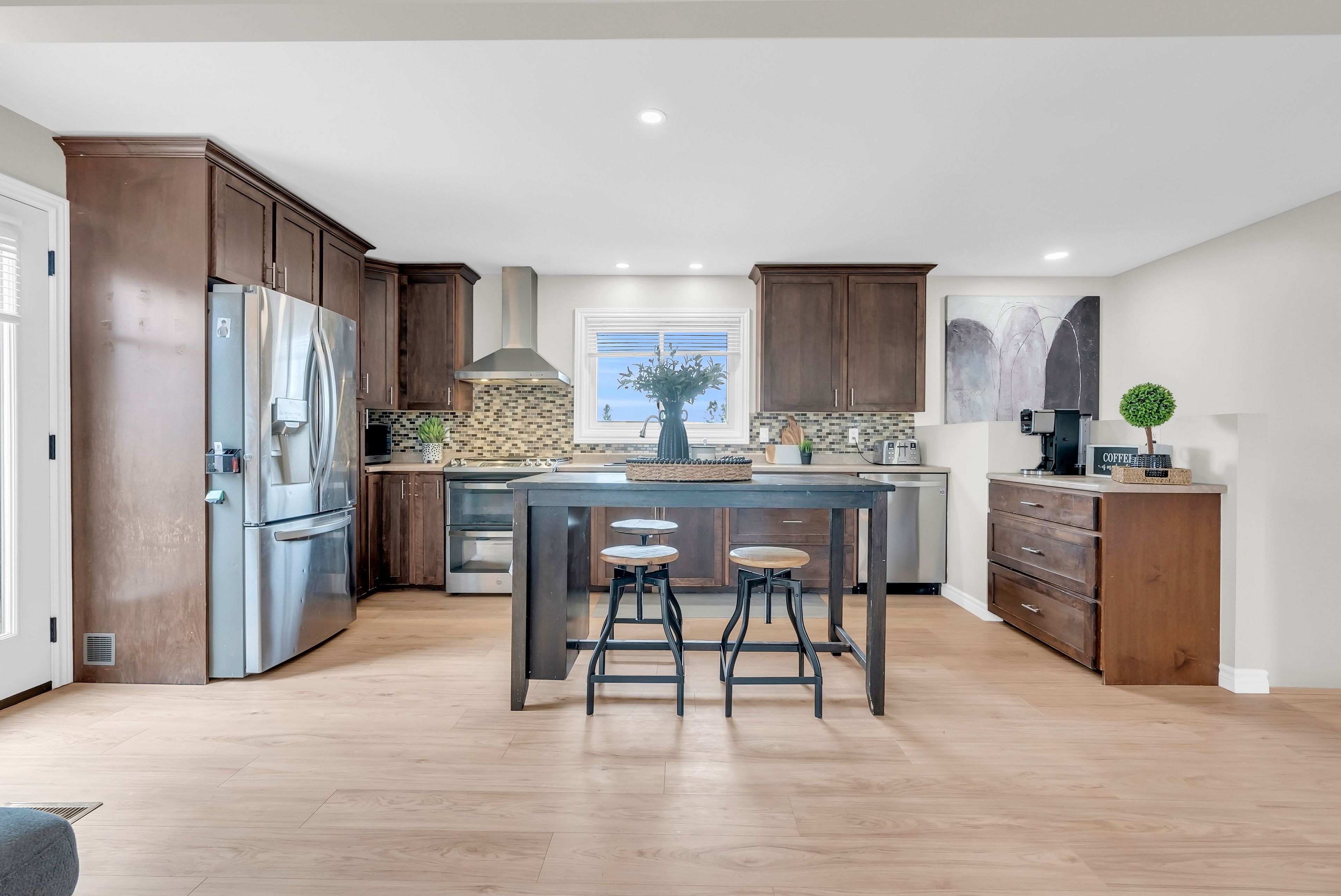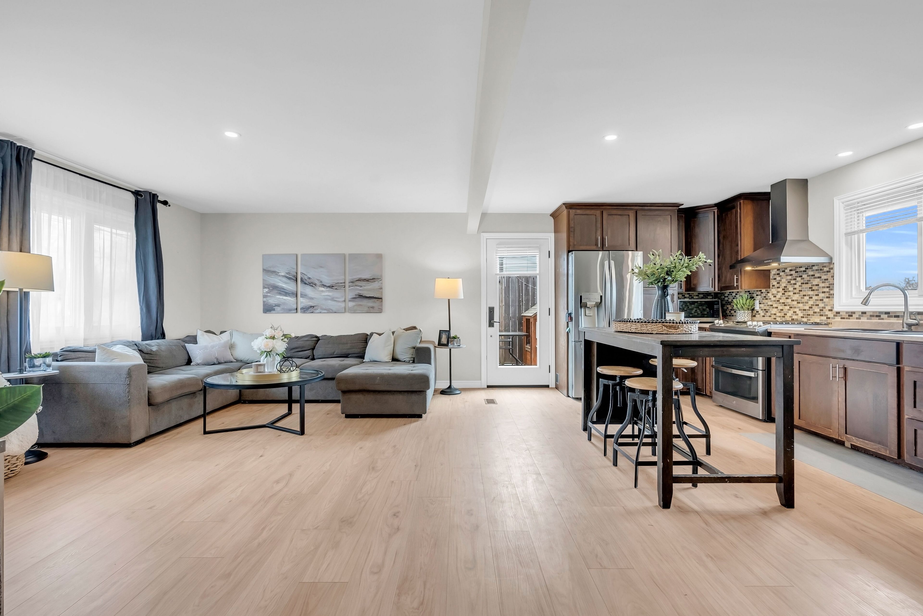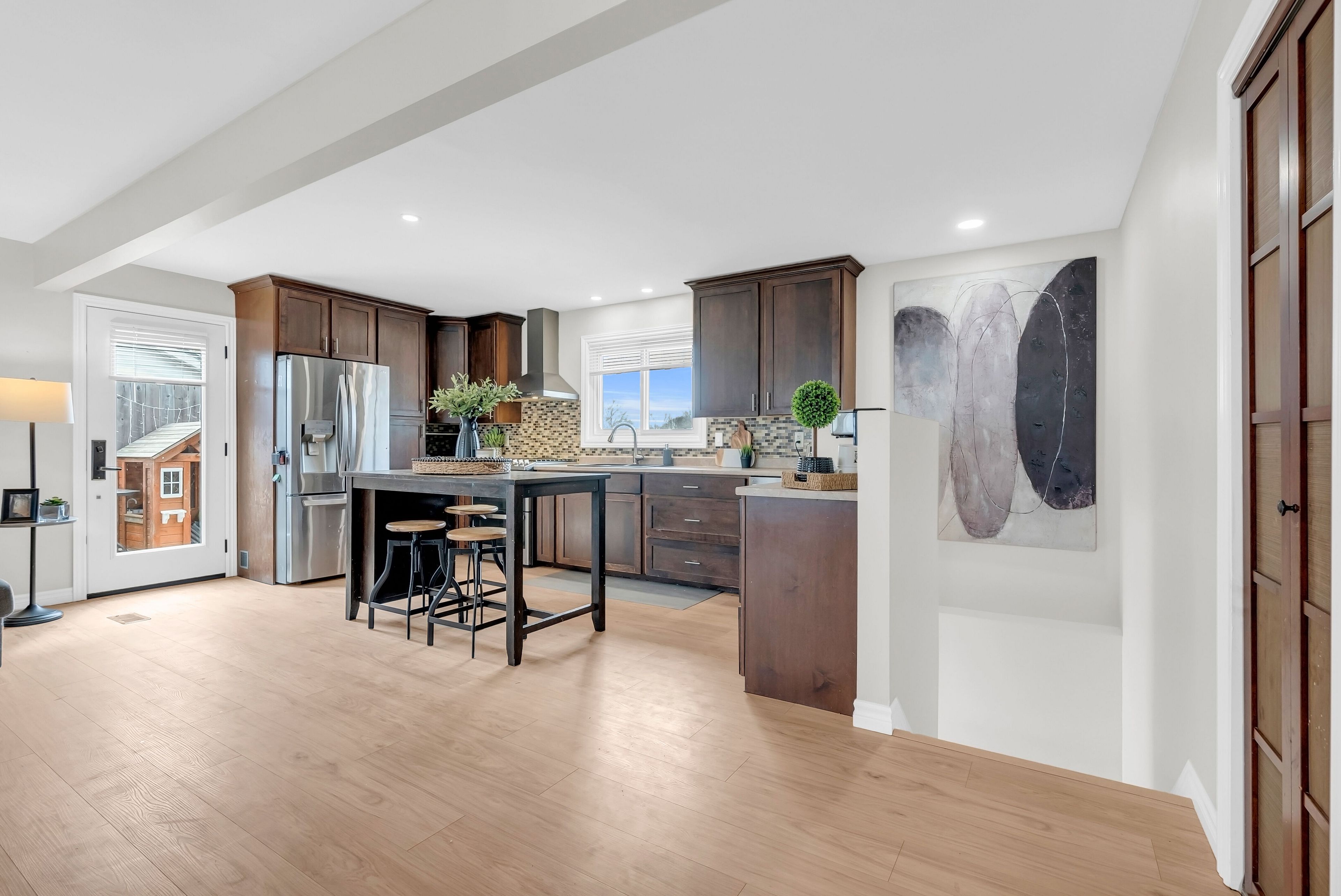• Open-concept main level with a large kitchen and stainless steel appliances.
