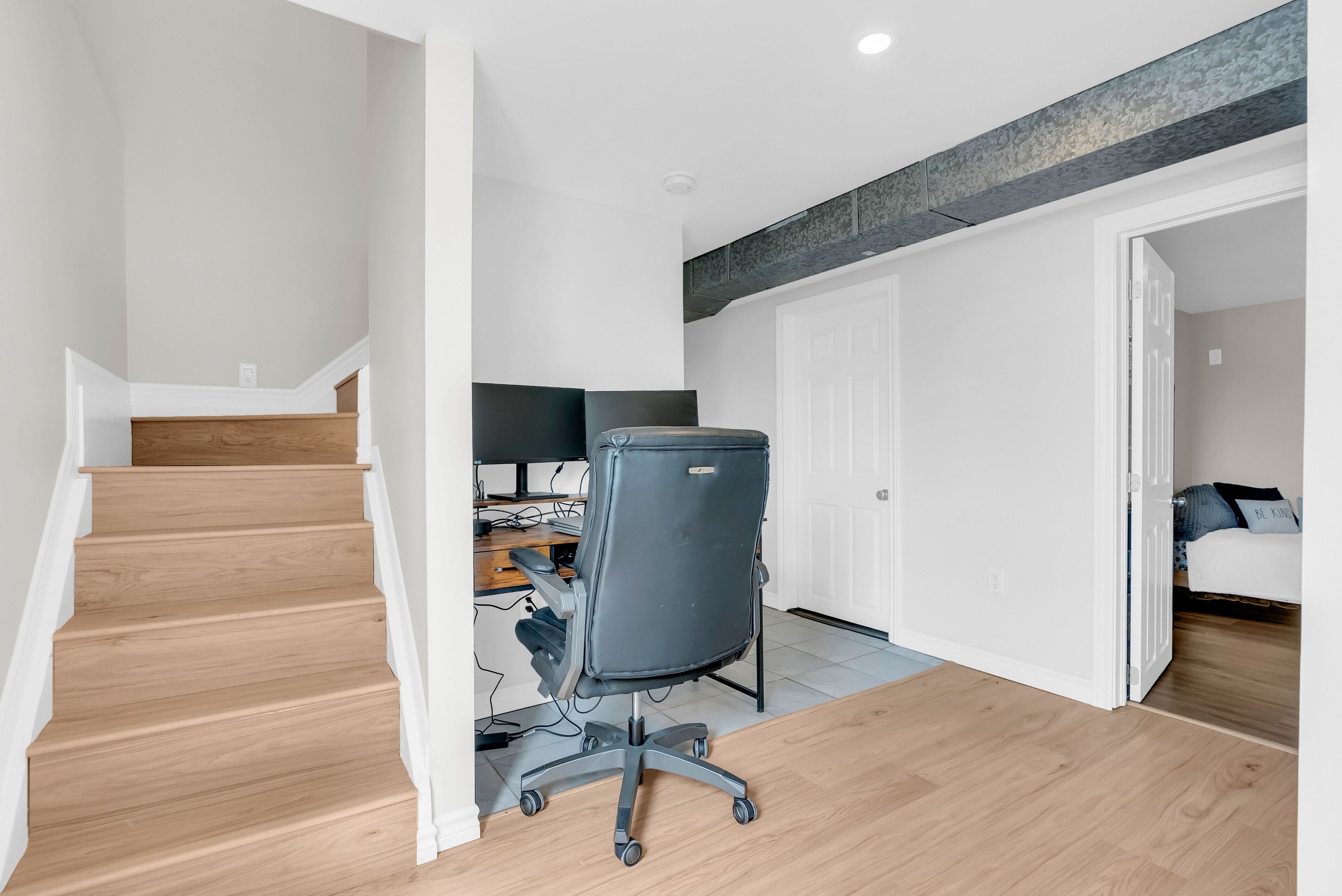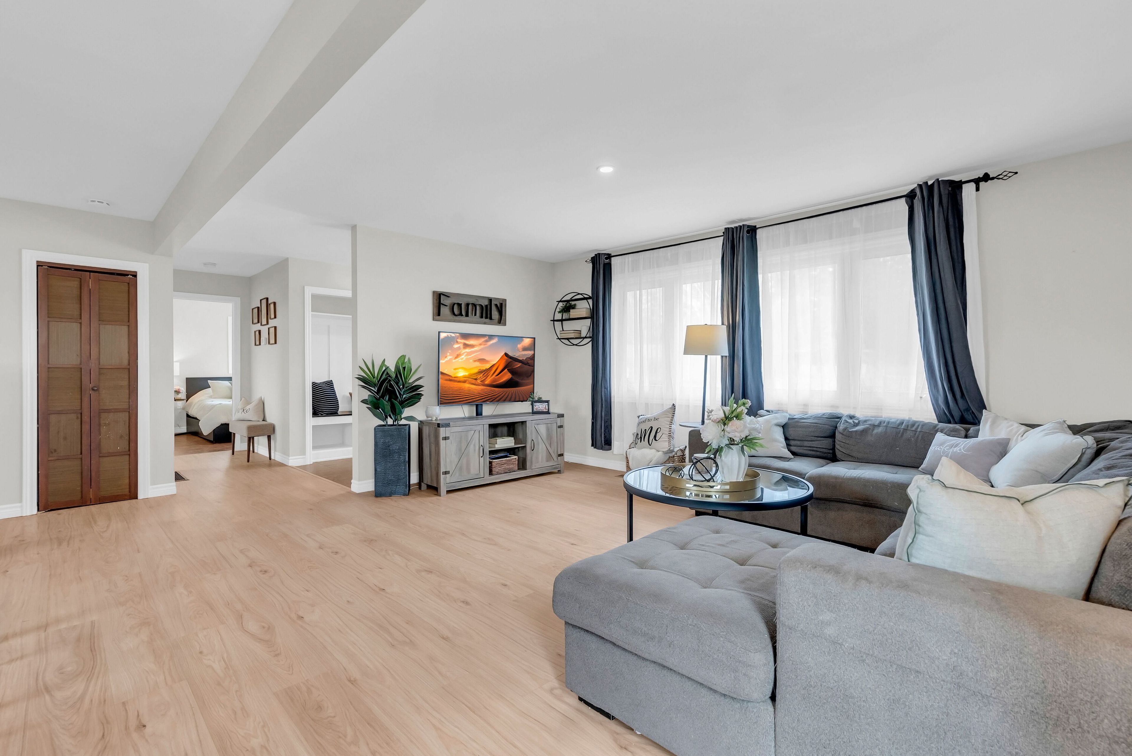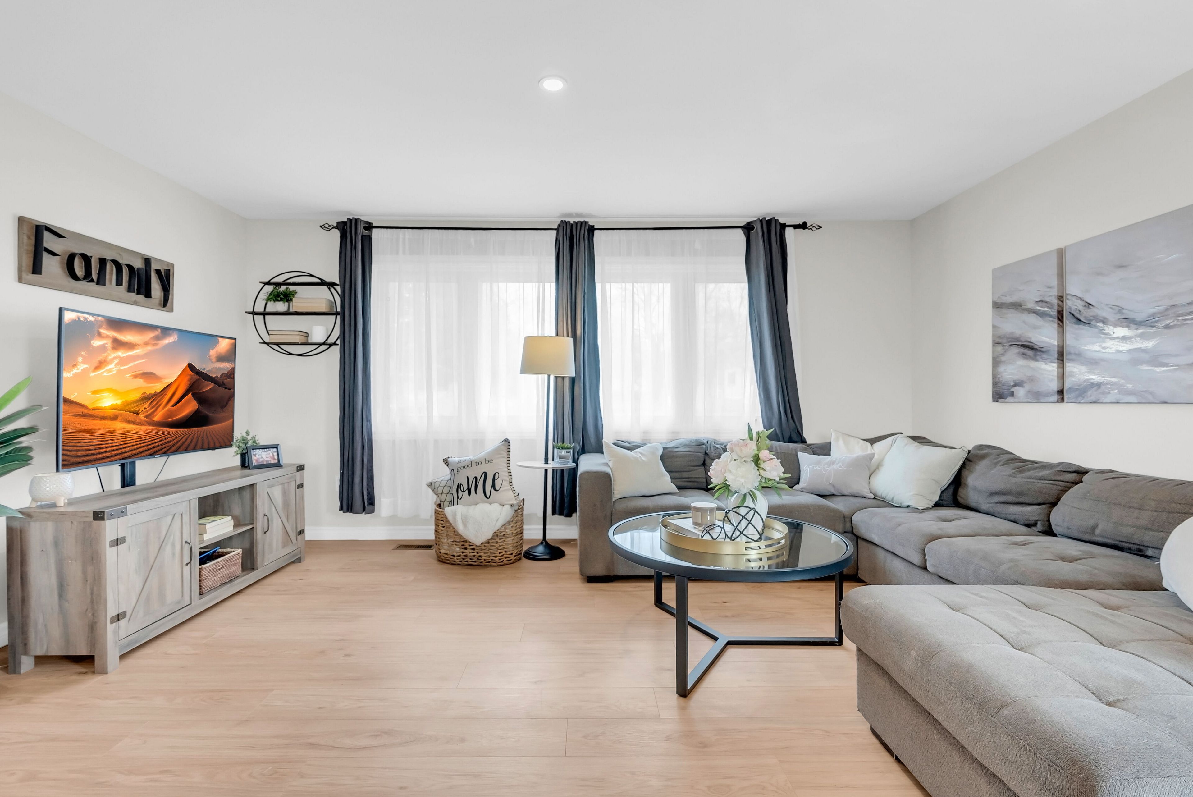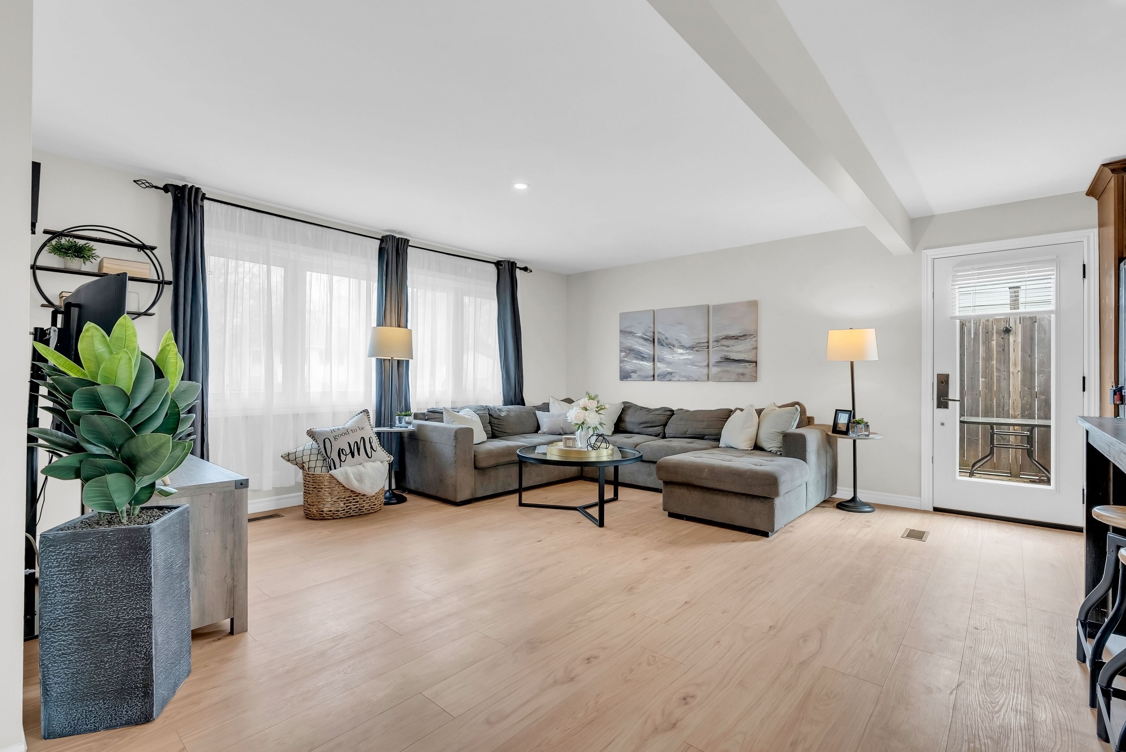 • Open-concept main level with a large kitchen and stainless steel appliances.