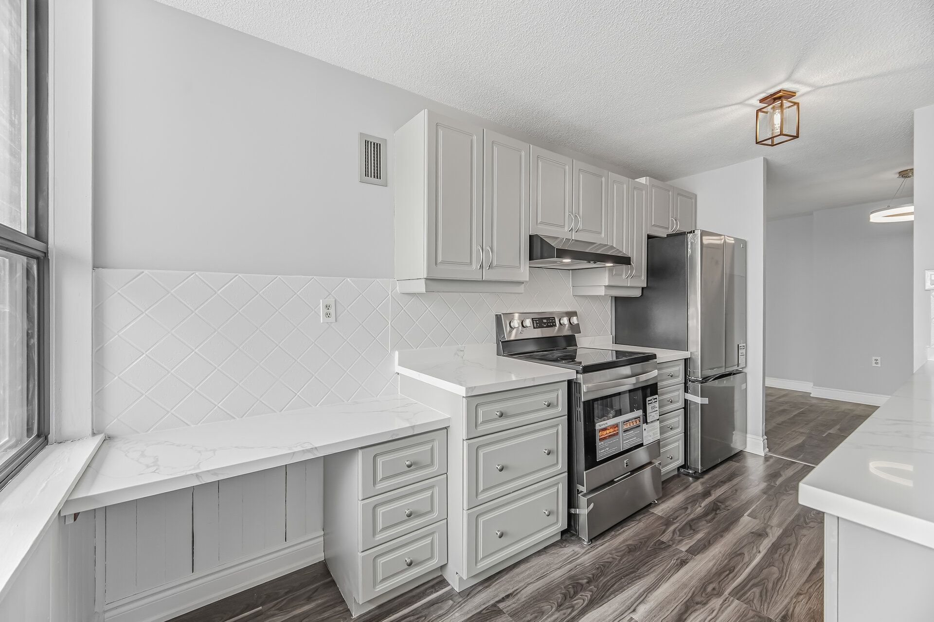 • Brand new stainless steel kitchen appliances and quartz countertops included.