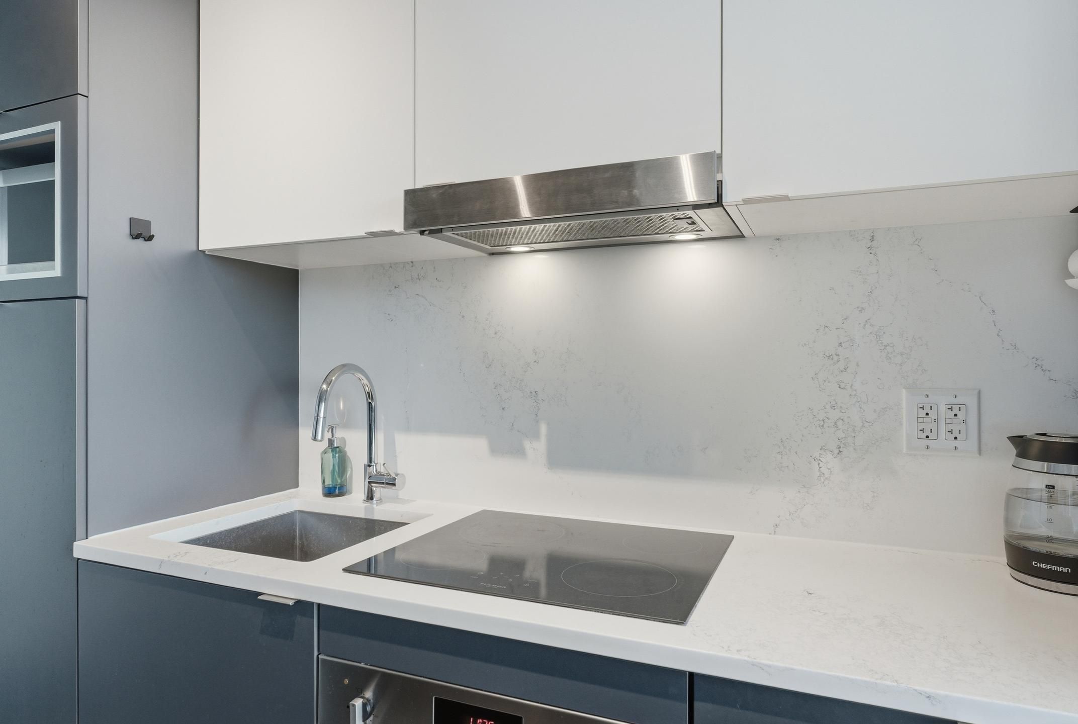 • Modern kitchen with quartz counters and seamless flow into the living area.