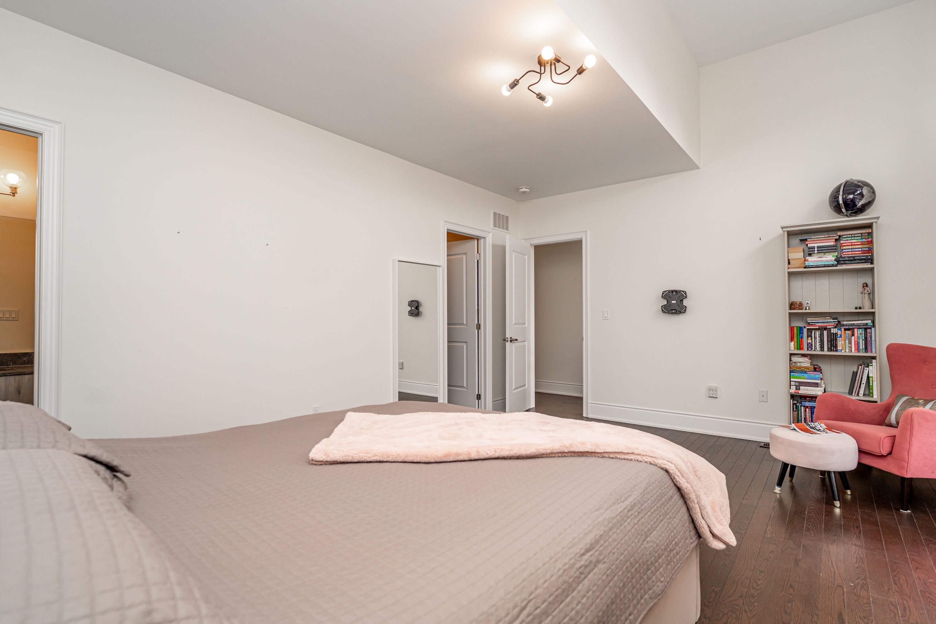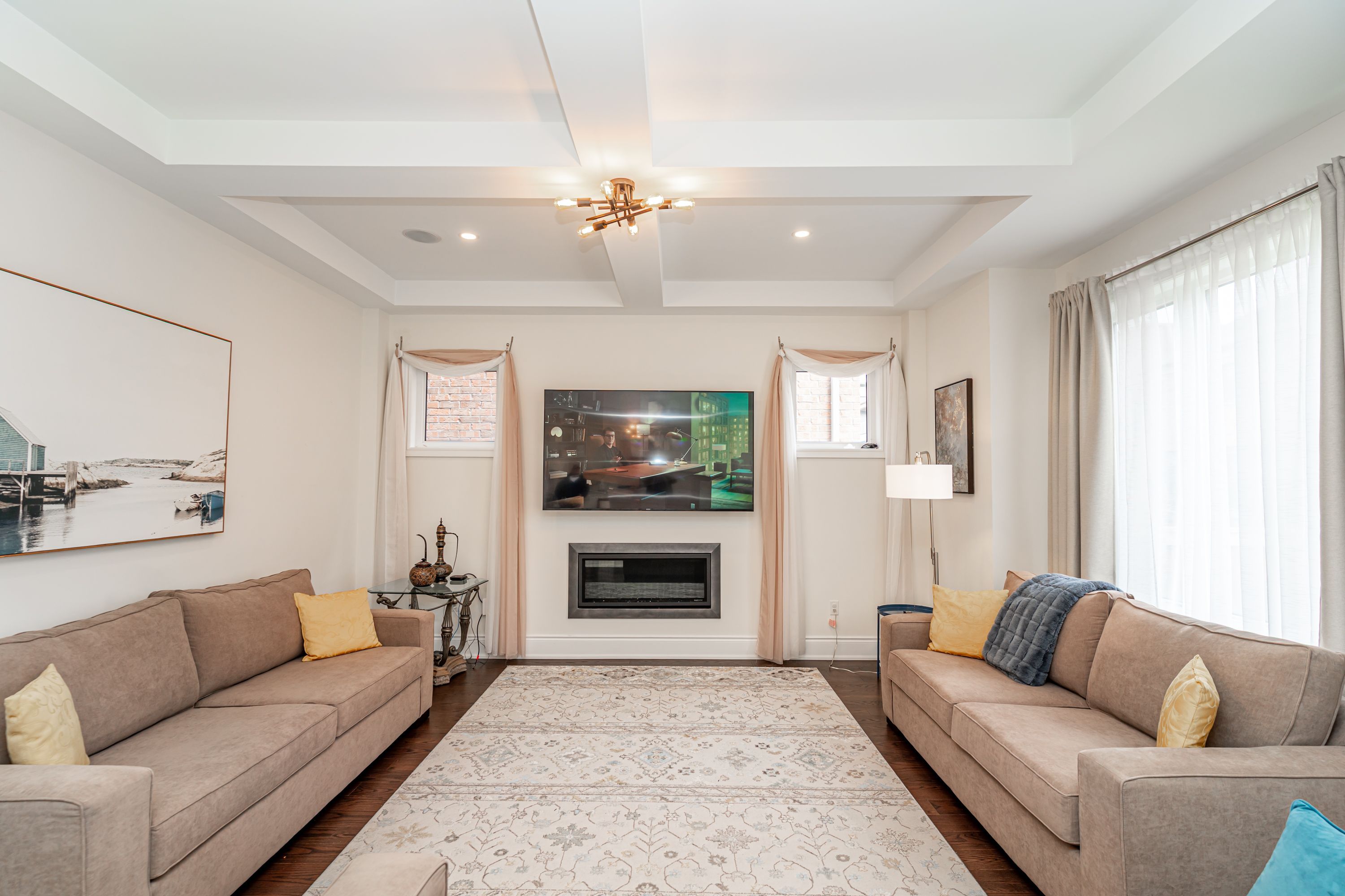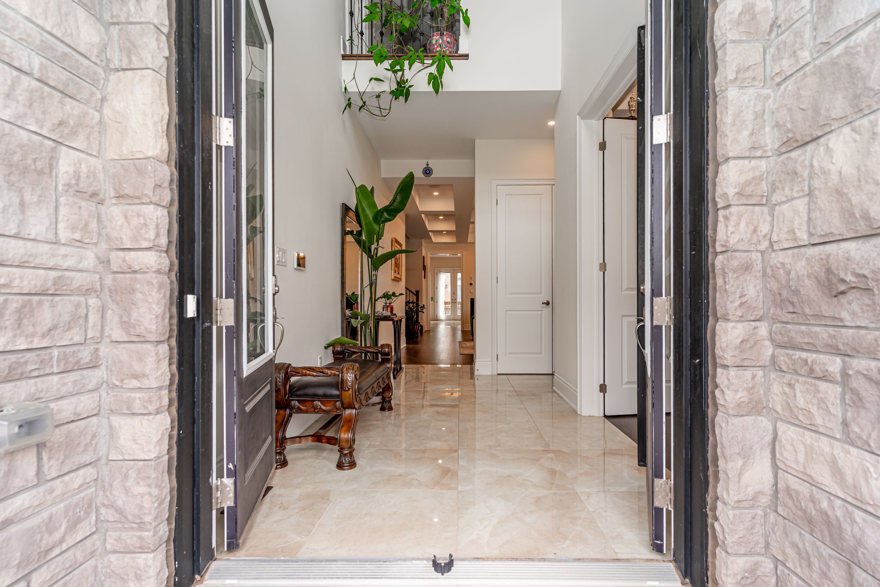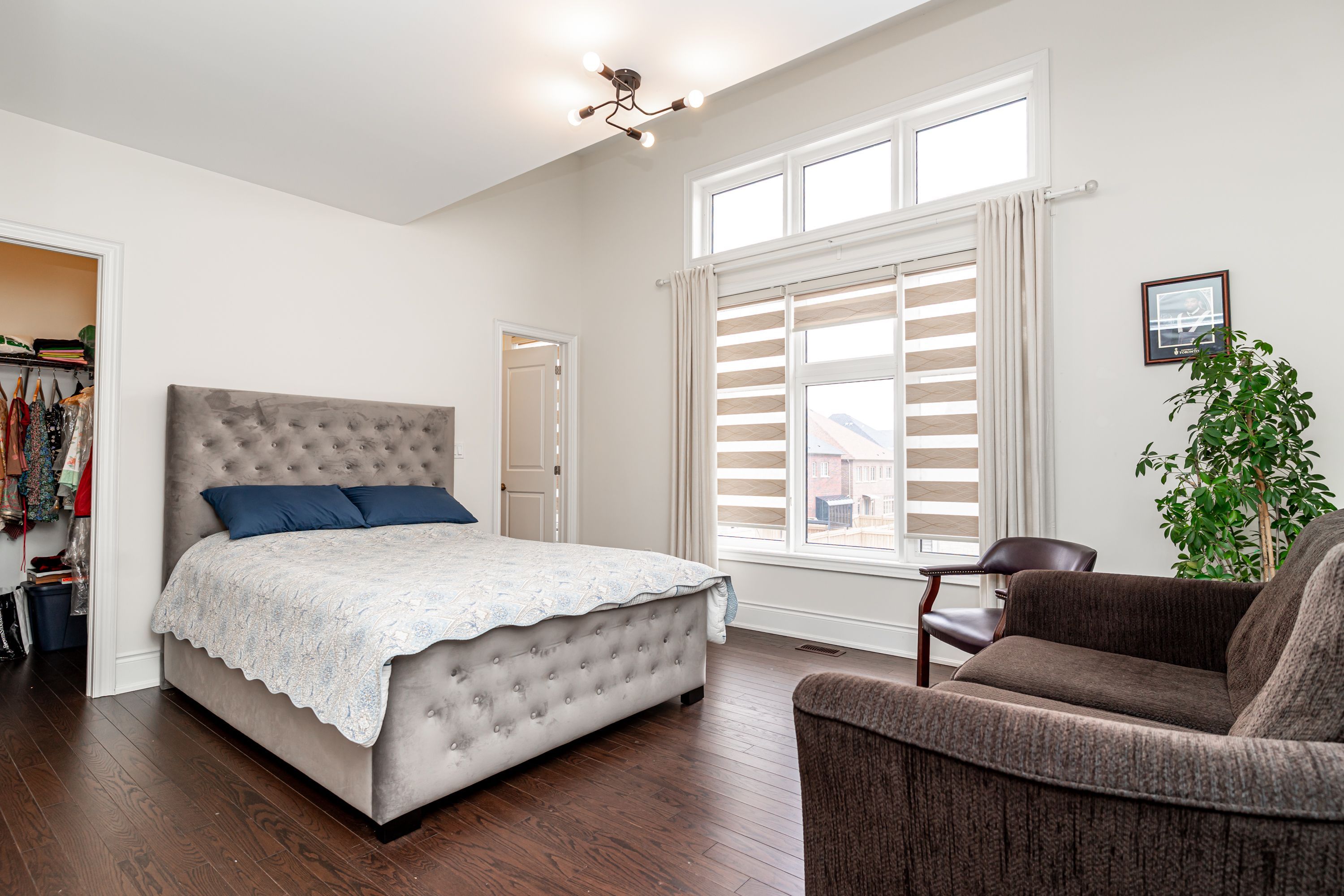 Most spectacular luxury living in a one-of-a-kind 5-bedroom, 4. 5-bathrooms, on premium corner lot. Features 4,353 sq ft of upper-grade living space. 10 ft ceilings on the main floor, 9 ft on the 2nd floor, and 9 ft in the basement. Home offers unique dual master bedrooms. Very unique, open, and spacious foyer with double-door entry and vaulted 22 ft ceilings with windows for natural light. Northwest-facing with lots of sunlight and windows. Over $210k spent on upgrades. Luxury kitchen comes with ceiling-height, extra-large wall cabinets with crown moulding, built-in custom stainless steel jennair 5-piece appliance with custom 6-burner gas cooktop, custom pantry, servery, and quartz countertops with matching backsplash. Kitchen features a large 7 ft x 5 ft centre island with under-counter storage cabinets, perfect for entertaining. Large family room boasts large windows, wall-mounted tv bracket, and ample space for three couches. All bedrooms are attached with walk-in closets and ensuite bathrooms containing glass shower stalls. All bedroom ceilings are vaulted for extra-high windows for natural light. Throughout the home: pot lights, upgraded light fixtures, and hardwood flooring. Three bedrooms have wall-mounted tv installation brackets. Main floor office features built-in desk, pot lights, and sitting area. Large living and dining room with coffered ceiling and designer light fixtures. Spacious eat-in kitchen with large, open breakfast area. Master bedroom ensuite comes with a retreat room (usable as a 5th bedroom). Large walk-in closet (17 ft x 11 ft) attached to master bedroom through retreat room. Mud room contains laundry facilities and wall-mounted storage cabinets. Has a separate entrance. Two entrances to basement. Garden door walk-out to backyard from kitchen. Large backyard boasts complete, shadow-free sunlight. House features built-in ceiling speakers and 22 ft high vaulted ceiling at foyer and main entrance, offering natural light throughout.