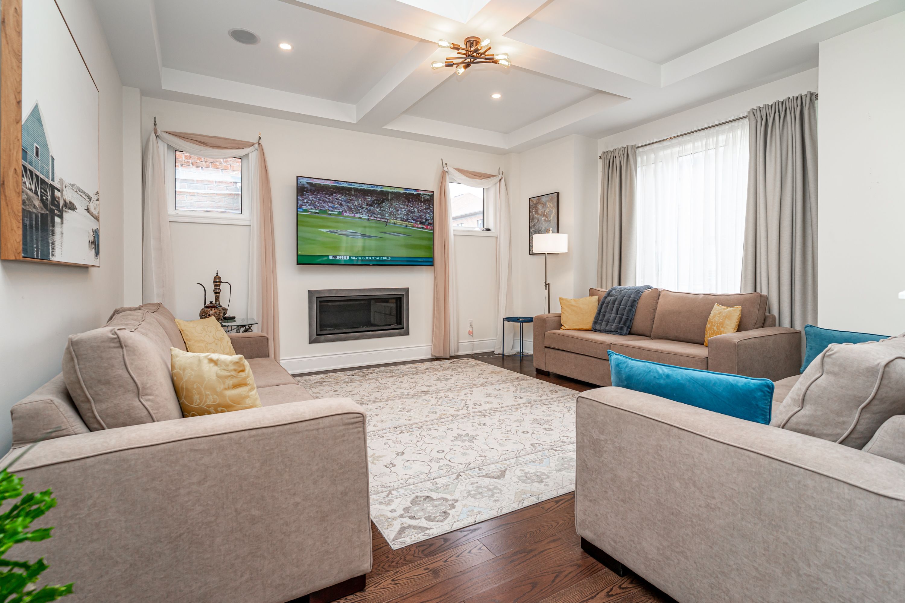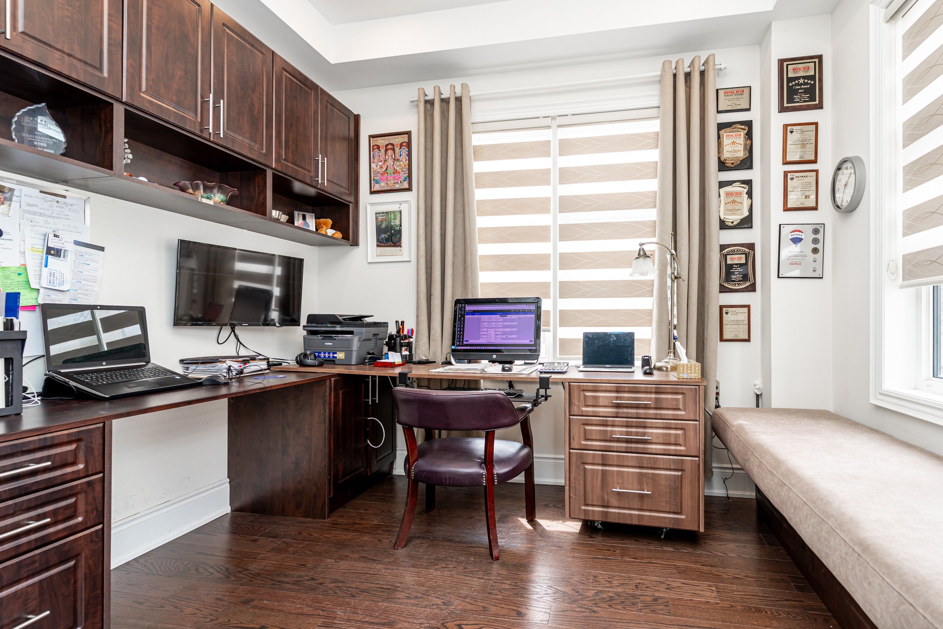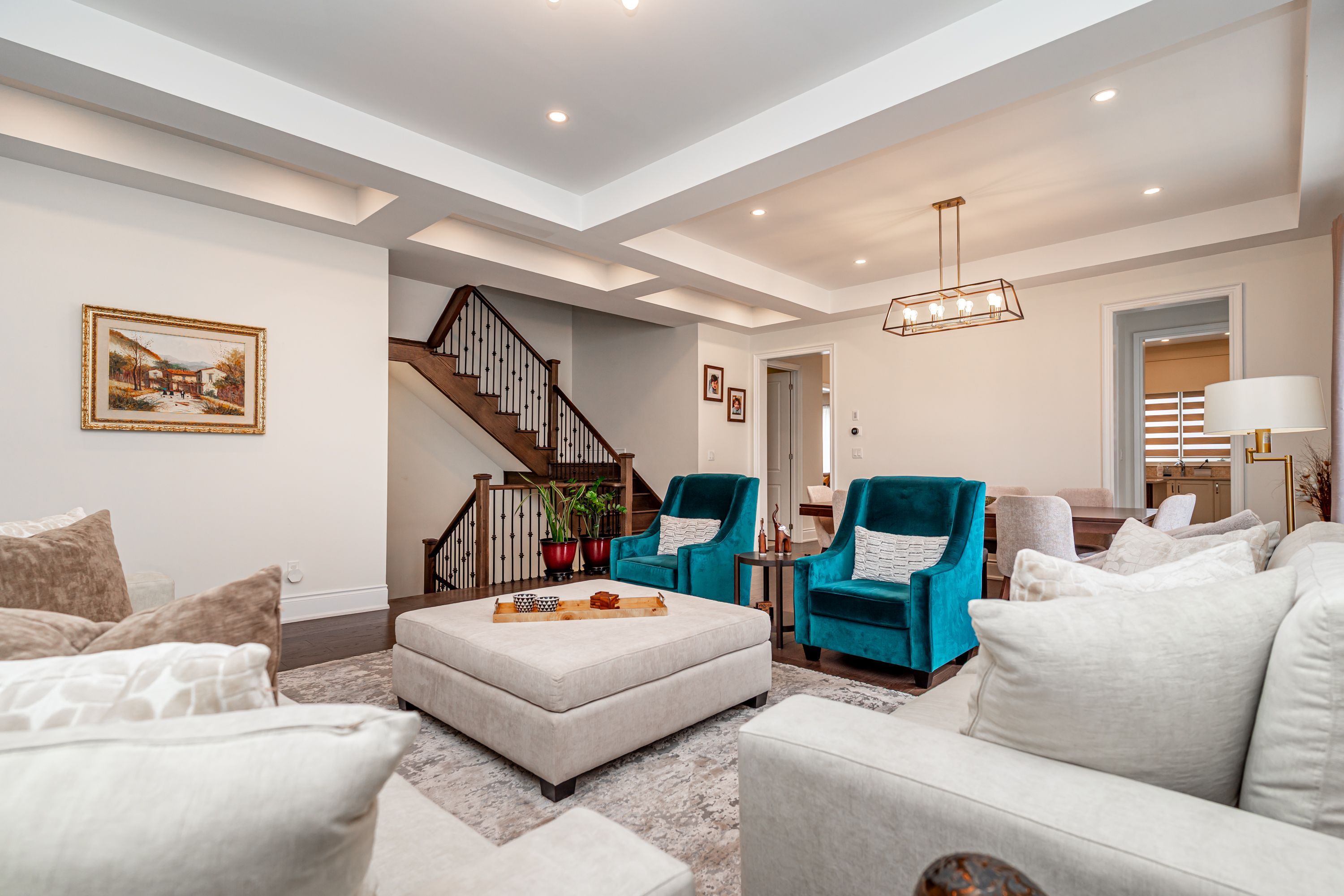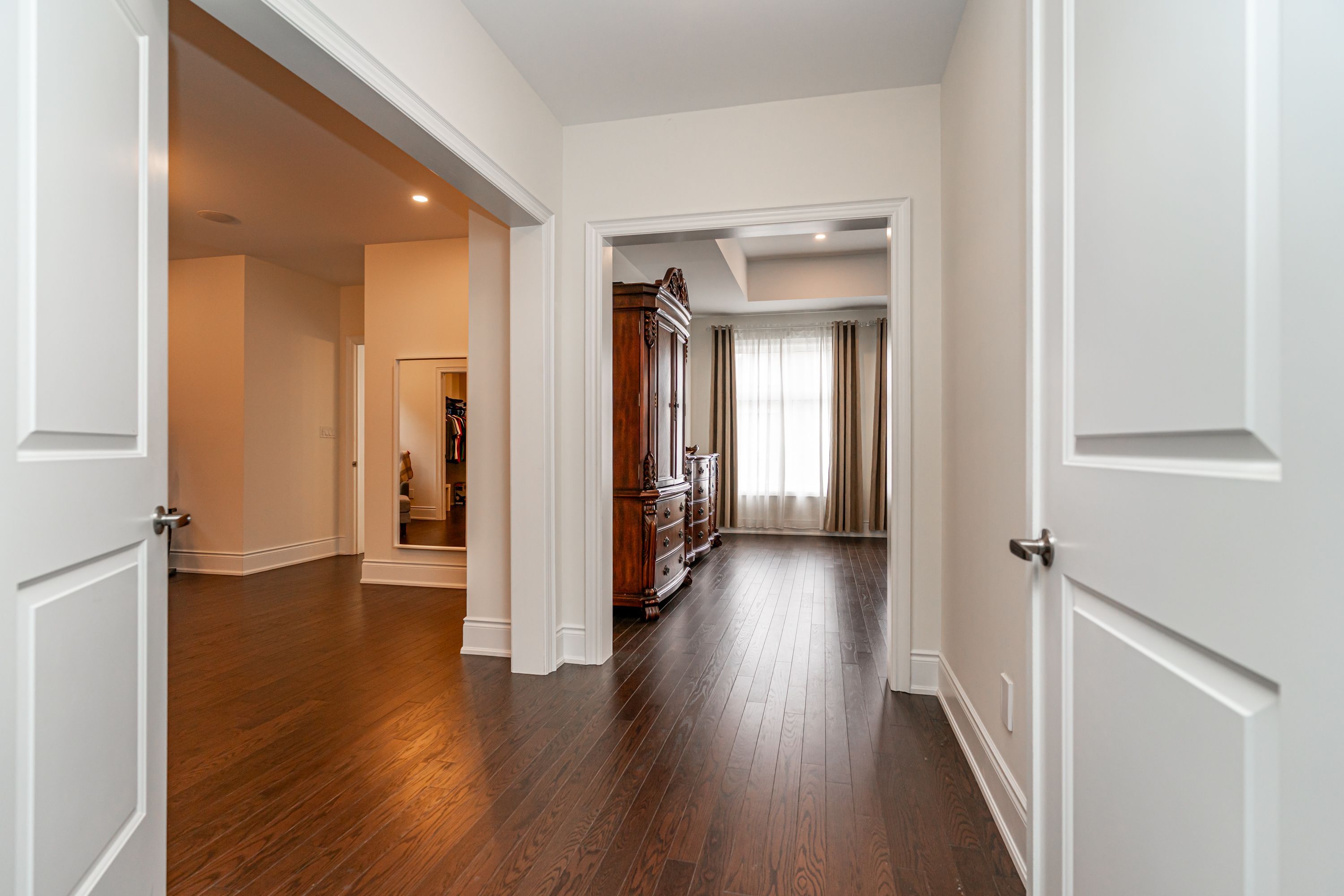 Most spectacular luxury living in a one-of-a-kind 5-bedroom, 4. 5-bathrooms, on premium corner lot. Features 4,353 sq ft of upper-grade living space. 10 ft ceilings on the main floor, 9 ft on the 2nd floor, and 9 ft in the basement. Home offers unique dual master bedrooms. Very unique, open, and spacious foyer with double-door entry and vaulted 22 ft ceilings with windows for natural light. Northwest-facing with lots of sunlight and windows. Over $210k spent on upgrades. Luxury kitchen comes with ceiling-height, extra-large wall cabinets with crown moulding, built-in custom stainless steel jennair 5-piece appliance with custom 6-burner gas cooktop, custom pantry, servery, and quartz countertops with matching backsplash. Kitchen features a large 7 ft x 5 ft centre island with under-counter storage cabinets, perfect for entertaining. Large family room boasts large windows, wall-mounted tv bracket, and ample space for three couches. All bedrooms are attached with walk-in closets and ensuite bathrooms containing glass shower stalls. All bedroom ceilings are vaulted for extra-high windows for natural light. Throughout the home: pot lights, upgraded light fixtures, and hardwood flooring. Three bedrooms have wall-mounted tv installation brackets. Main floor office features built-in desk, pot lights, and sitting area. Large living and dining room with coffered ceiling and designer light fixtures. Spacious eat-in kitchen with large, open breakfast area. Master bedroom ensuite comes with a retreat room (usable as a 5th bedroom). Large walk-in closet (17 ft x 11 ft) attached to master bedroom through retreat room. Mud room contains laundry facilities and wall-mounted storage cabinets. Has a separate entrance. Two entrances to basement. Garden door walk-out to backyard from kitchen. Large backyard boasts complete, shadow-free sunlight. House features built-in ceiling speakers and 22 ft high vaulted ceiling at foyer and main entrance, offering natural light throughout.