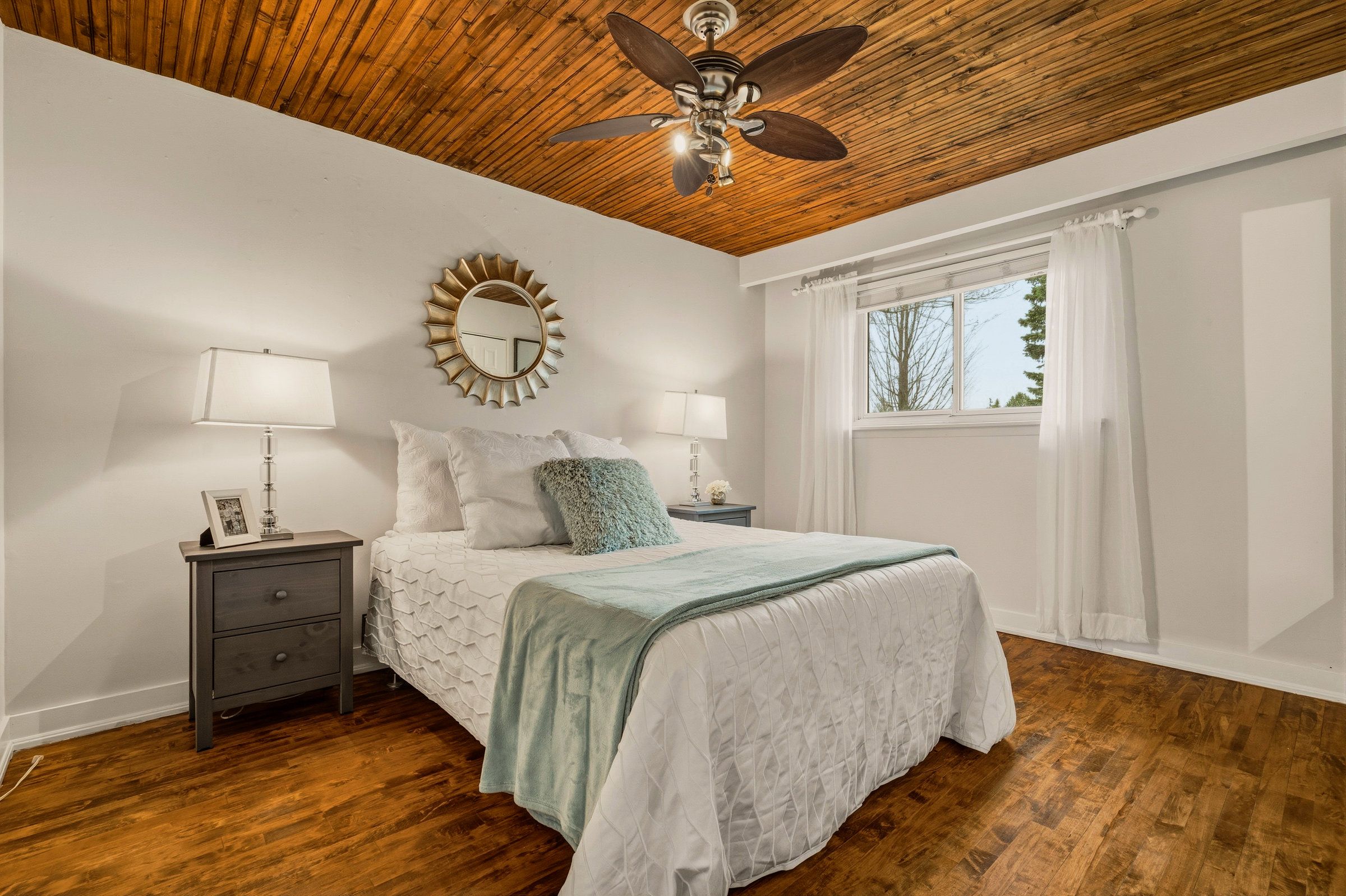 • Private backyard oasis with a custom deck and mature trees for relaxation.
