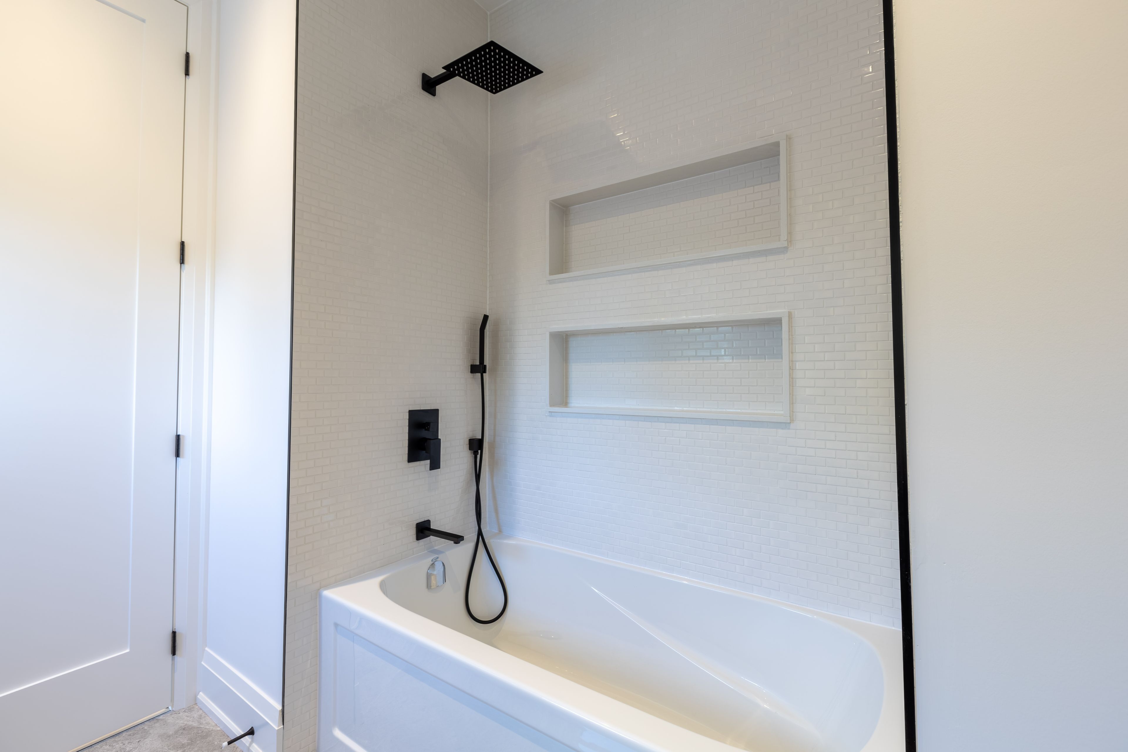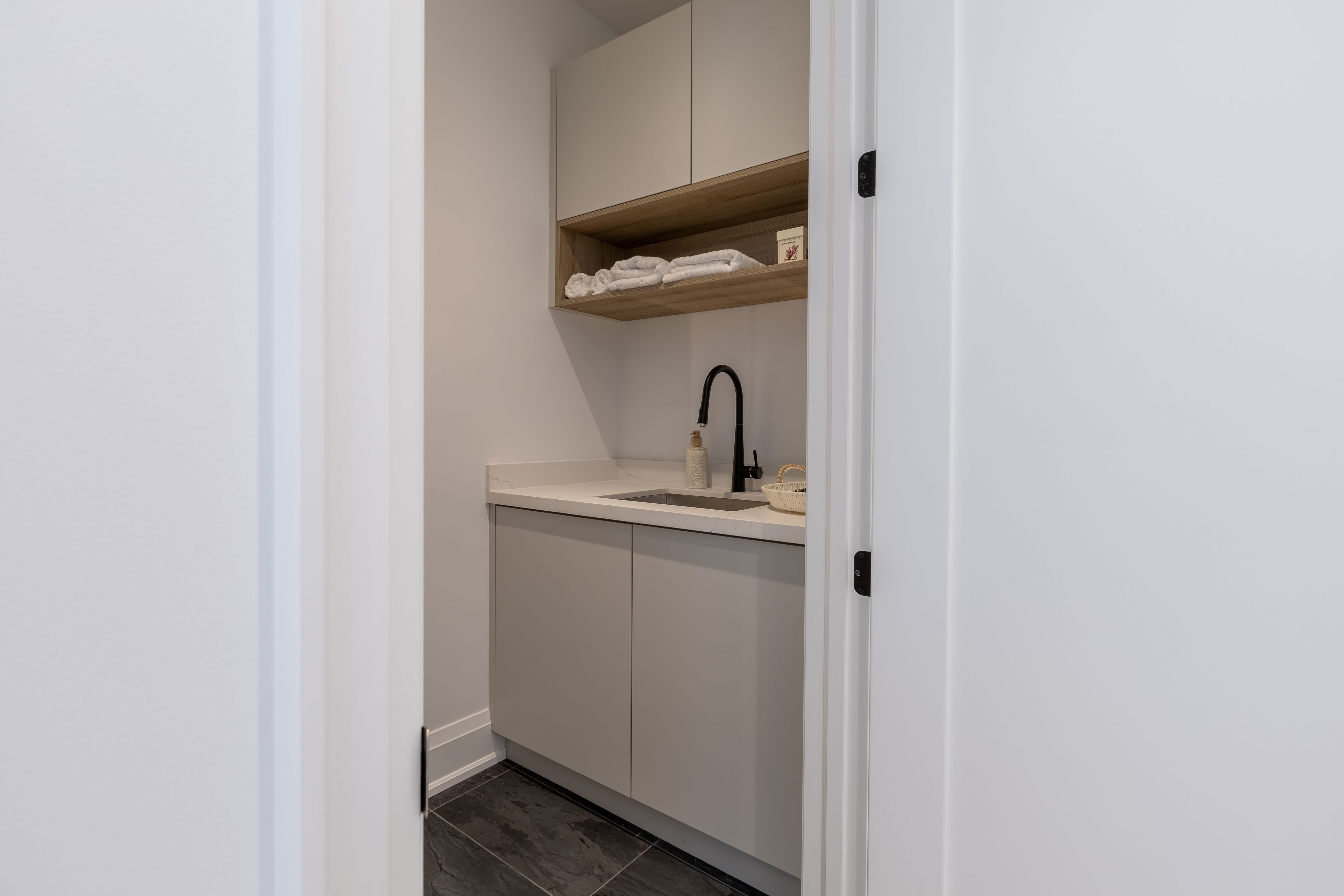 • Upgraded features include high ceilings, custom shelving, and herringbone flooring.