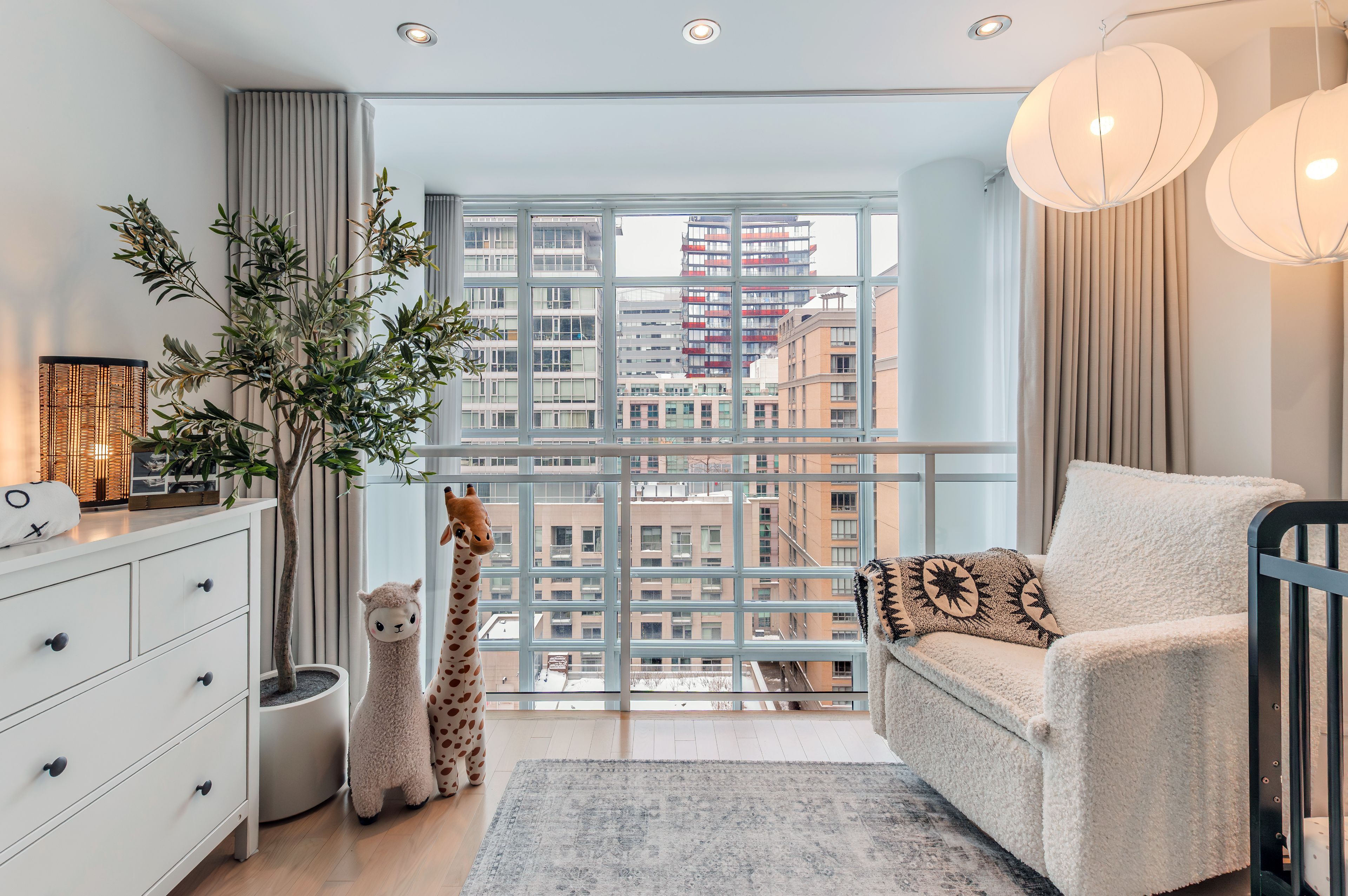 Rising above the city in boutique condos at 21 nelson, this striking lower penthouse offers a rare sense of scale and light in the heart of downtown toronto. Spanning approximately 1,405 sq ft with an additional 99 sq ft balcony, the residence unfolds across a thoughtfully designed 2+1 bedroom, 3-bathroom layout, where dramatic 19-foot ceilings and walls of glass create an atmosphere that feels closer to a boutique hotel suite than a typical condominium. The main living space is defined by its remarkable vertical volume and natural light. Floor-to-ceiling windows frame northeast city views while the open-concept layout seamlessly connects the living, dining, and kitchen areas-creating an ideal setting for both everyday living and effortless entertaining. The modern kitchen, anchored by a generous island with seating, blends clean lines with practical design, while the dining area sits against expansive windows that bring the skyline directly into the room. A dedicated office overlooking the balcony offers a bright and inspiring workspace-perfectly suited for modern work-from-home living without sacrificing privacy or style. The primary suite is calm and refined, complete with a ensuite and ample storage, while the second bedroom provides versatility for guests, family, or additional lifestyle needs. Step outside to the northeast-facing balcony, where morning light and layered city views create a peaceful extension of the home above the surrounding skyline. Complete with one parking space and access to boutique condos' rooftop terrace, pool, concierge, and fitness amenities, this residence delivers an elevated downtown lifestyle just steps from queen west, tiff bell lightbox, osgoode station, and the financial district. A rare offering that combines volume, light, and sophisticated city living in one of toronto's most connected neighbourhoods.