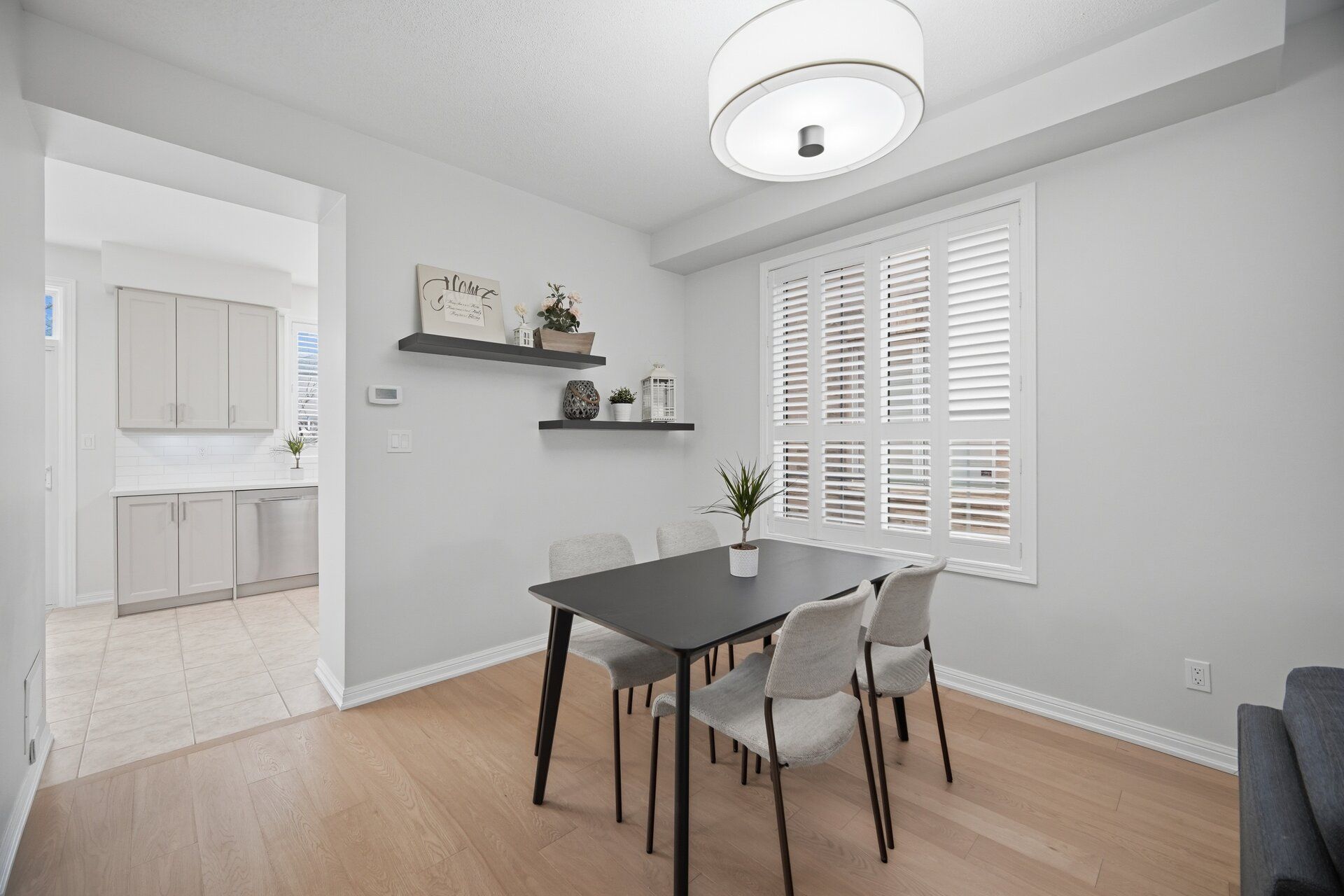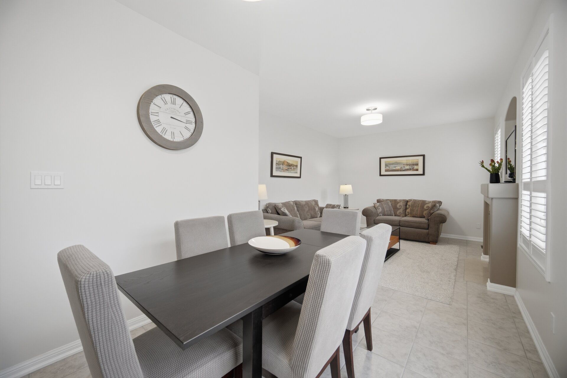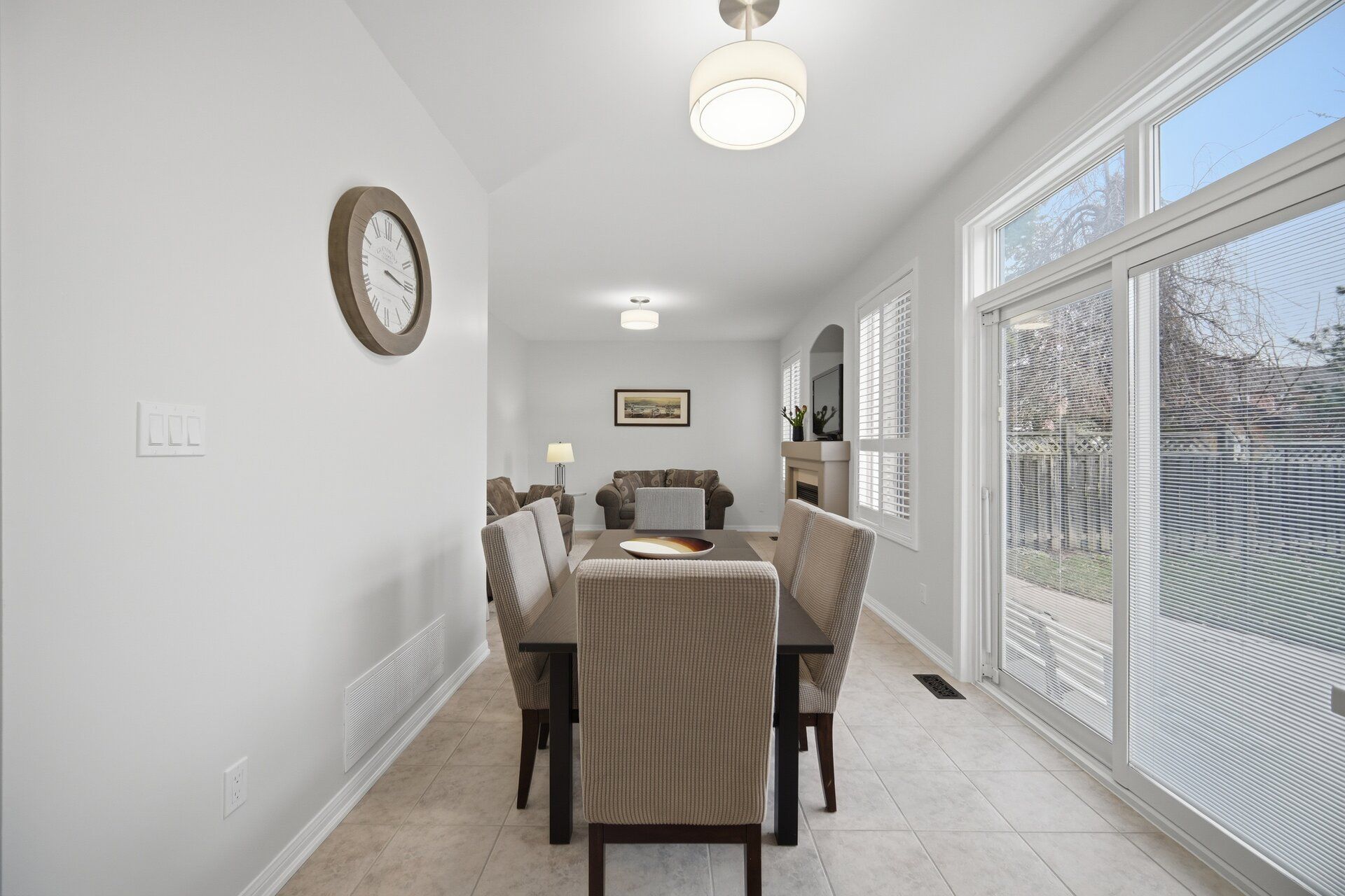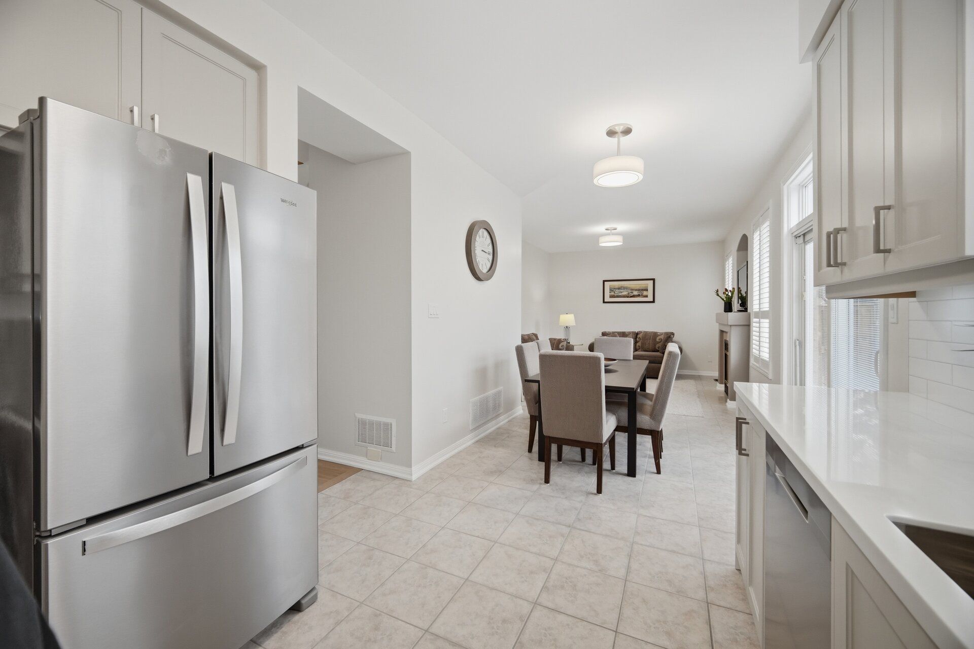 • Open-concept living and dining with high ceilings and hardwood flooring.