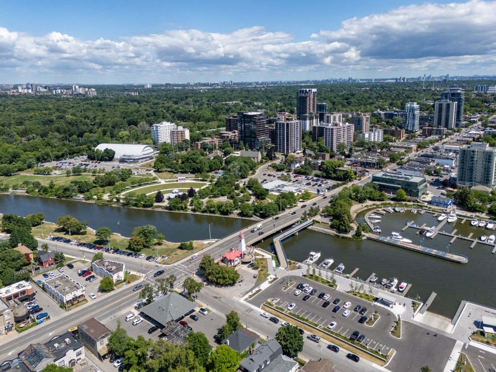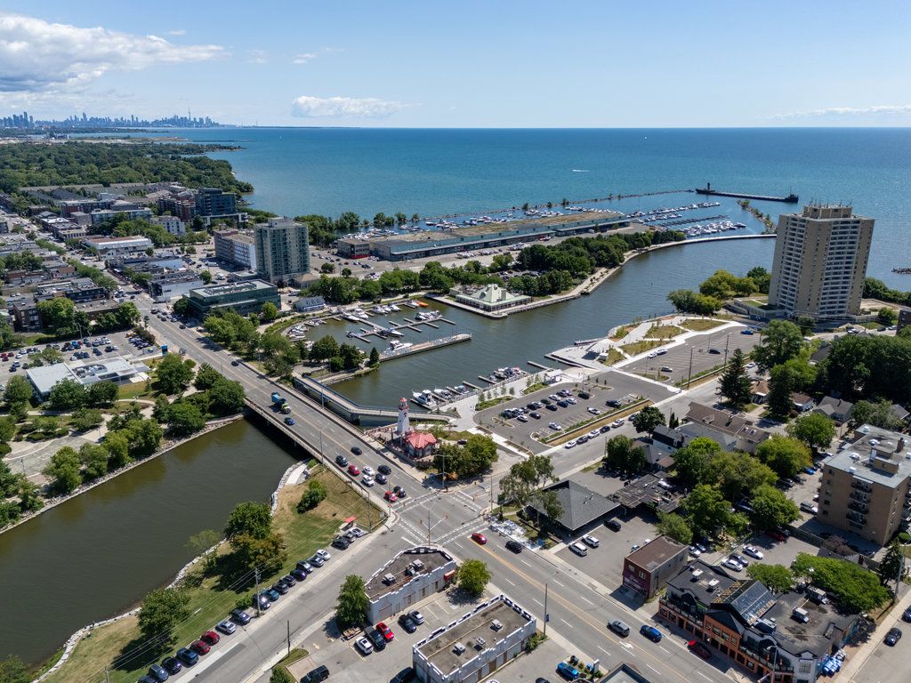 Location. Location. Location. Welcome to this stunning lower penthouse condo in the heart of port credit. Boasting over 1,200 sq. Ft. Of beautifully upgraded living space, this bright and airy suite features 9ft ceilings and expansive south, west and east facing exposures, flooding the home with natural light throughout the day. Step outside onto the wrap around balcony and enjoy panoramic views perfect for morning coffee, evening sunsets, or entertaining guests. This well designed layout includes two spacious bedrooms plus a versatile den, ideal for a home office or guest space, along with two bathrooms with modern finishes. The open concept living and dining area connects to a contemporary kitchen, making it perfect for both everyday living and hosting. With additional storage, in-suite laundry, one parking and one locker. Located just steps from the go train and amenities including boutique shopping, trendy restaurants, scenic lakefront trails, and the lively port credit waterfront community.