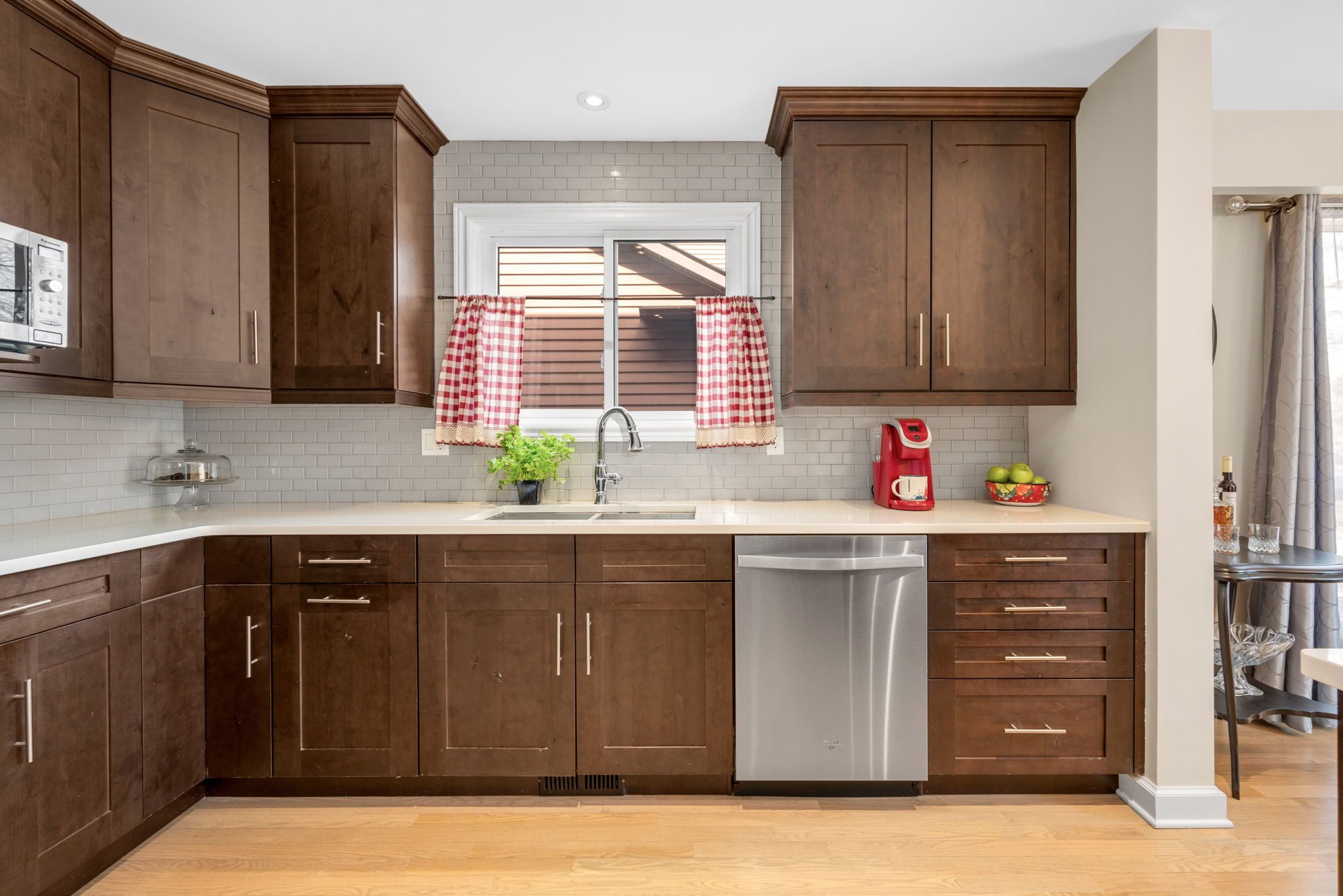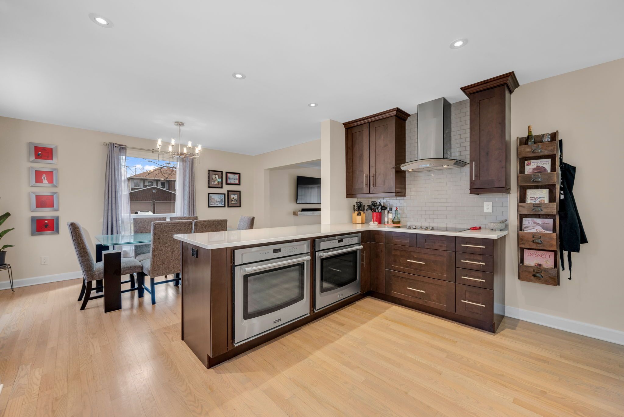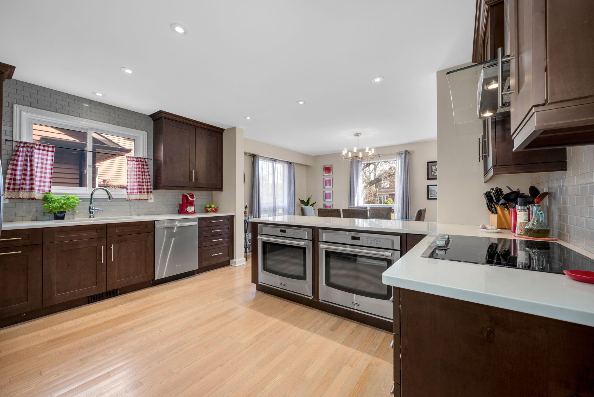• Open concept kitchen with double ovens and quartz countertops for entertaining.