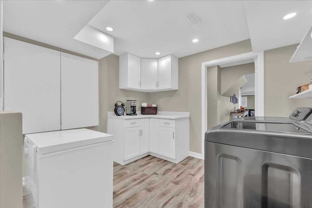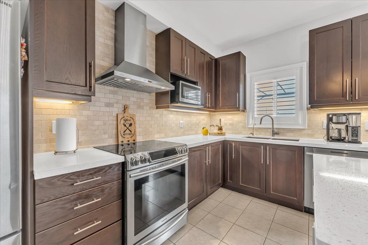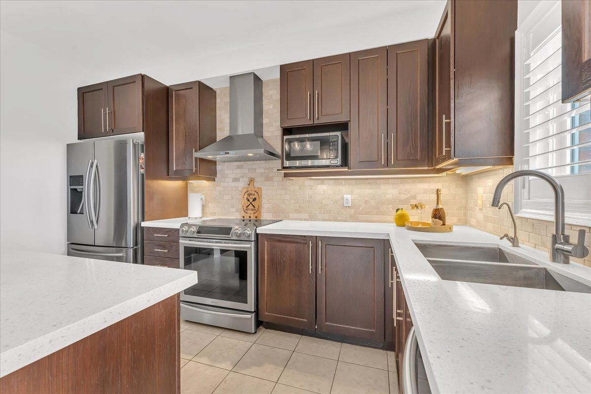 • Chef's kitchen features quartz countertops and high-end stainless appliances.