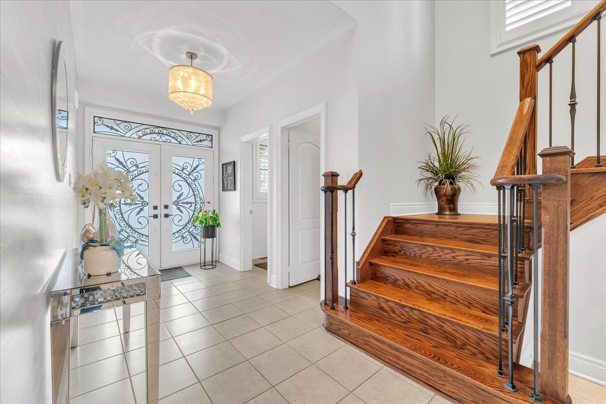 • Grand foyer welcomes guests with ceramic tile and wrought-iron staircase.