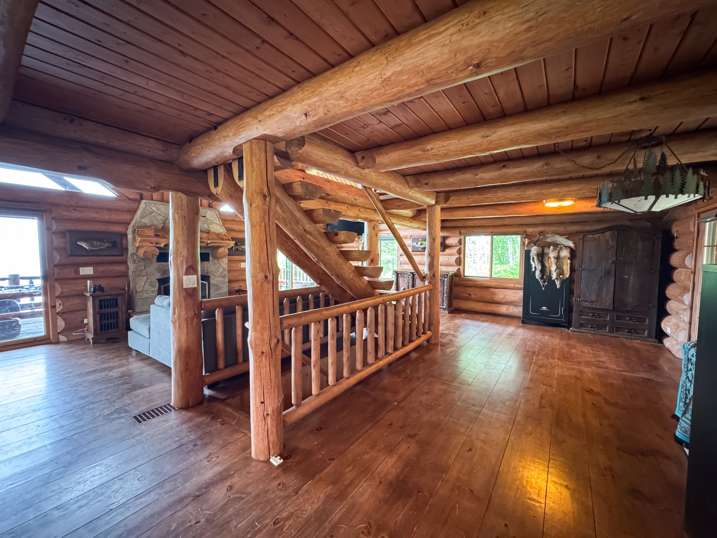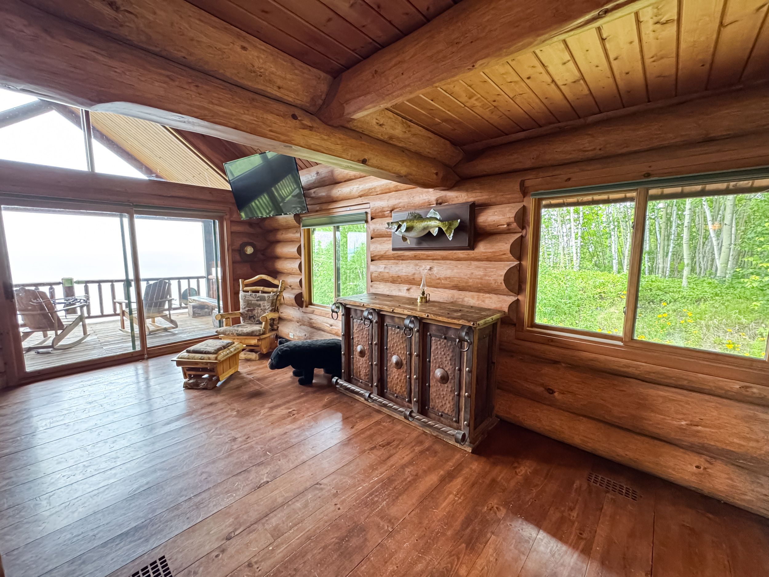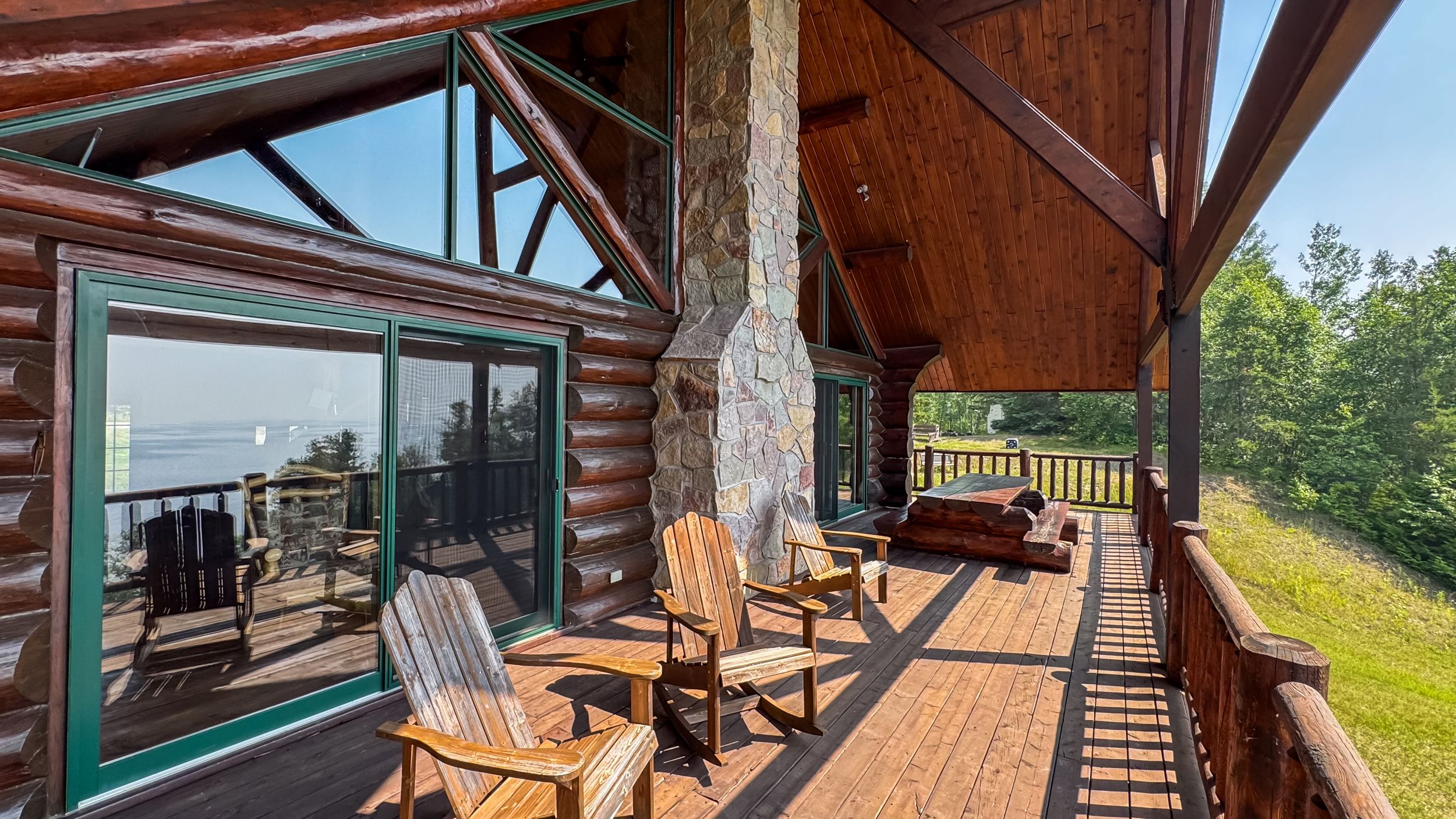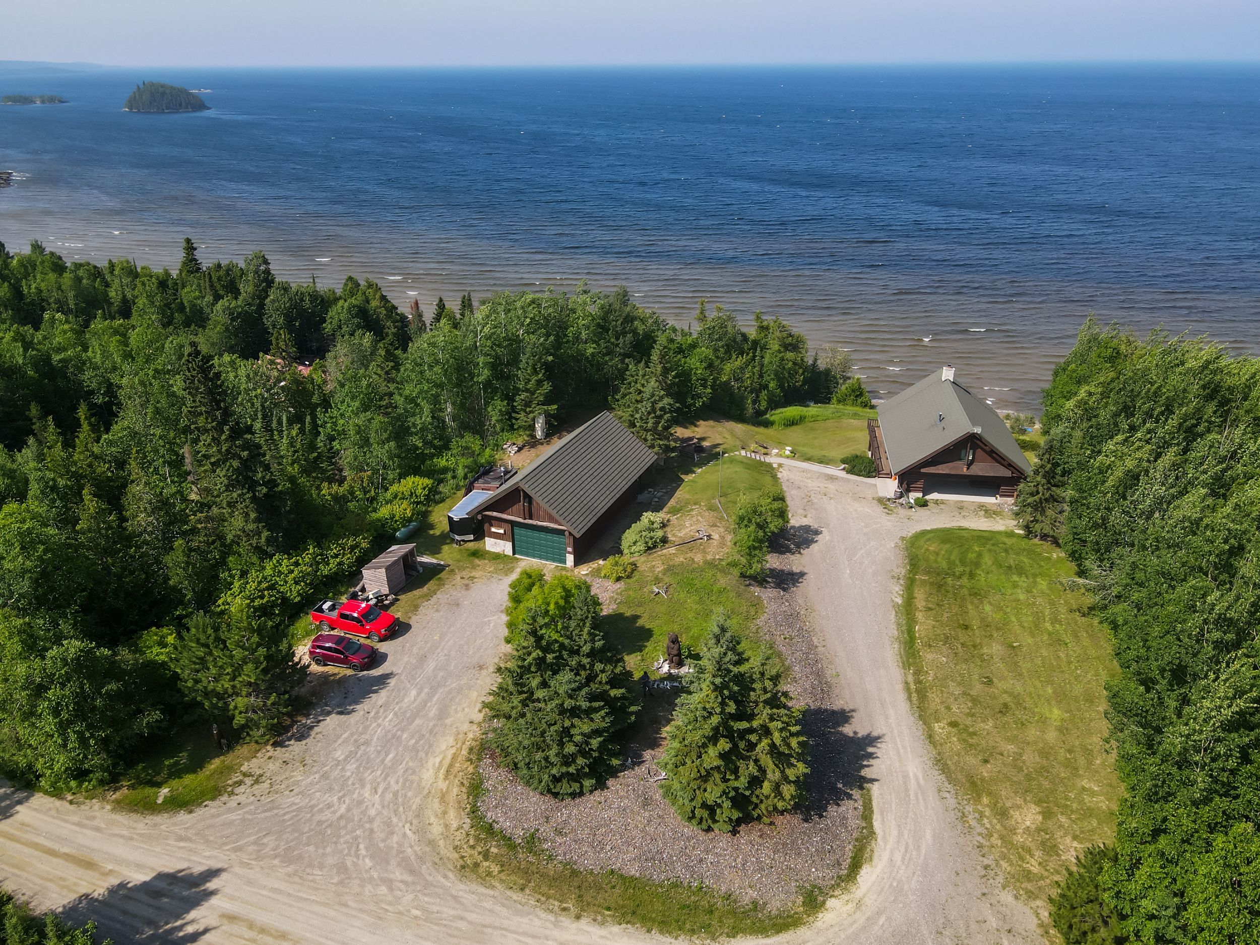 • Luxury off-grid log home on 1.4 acres with sandy beachfront access.