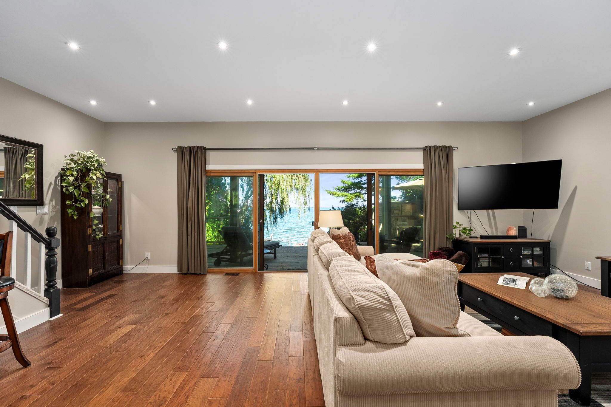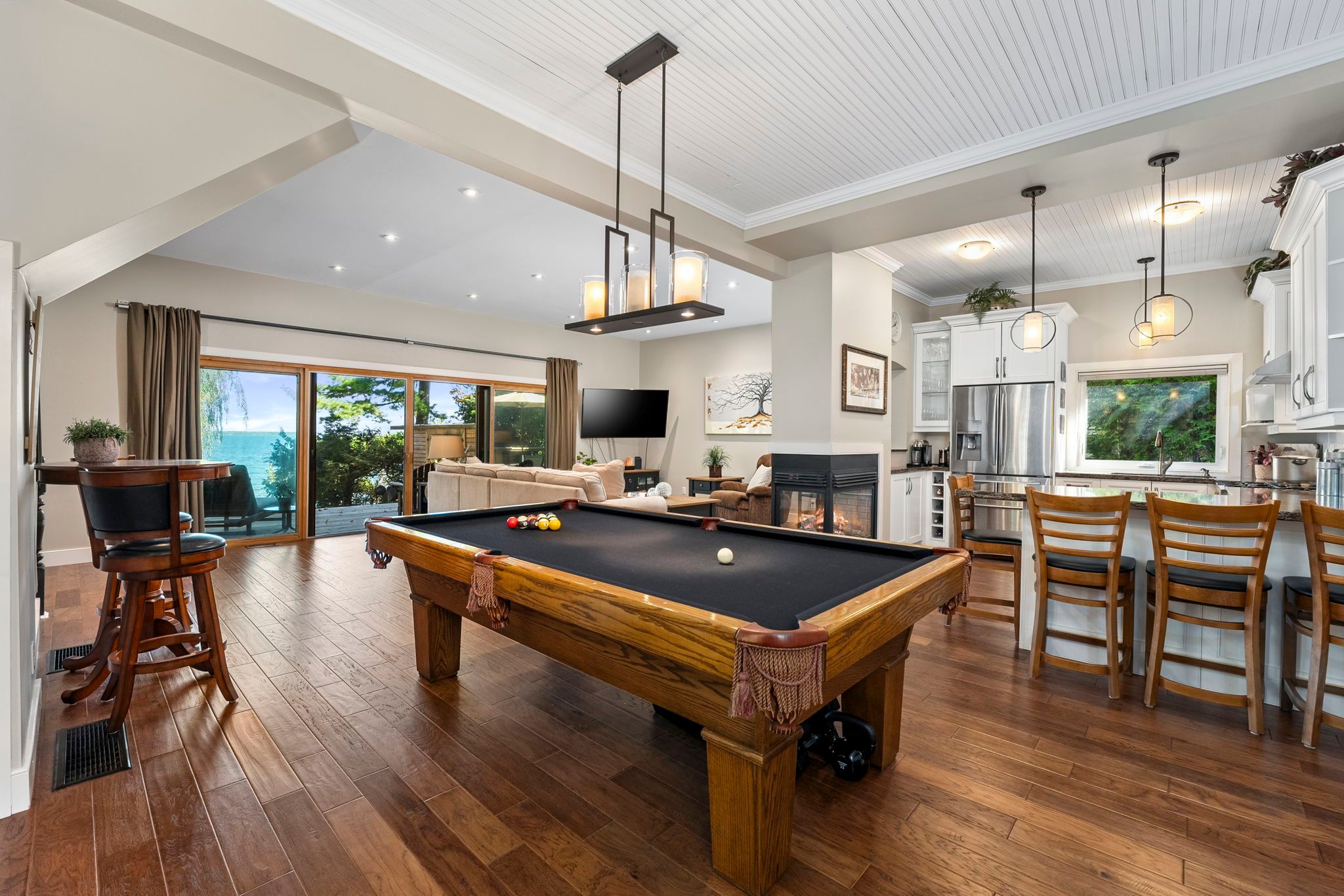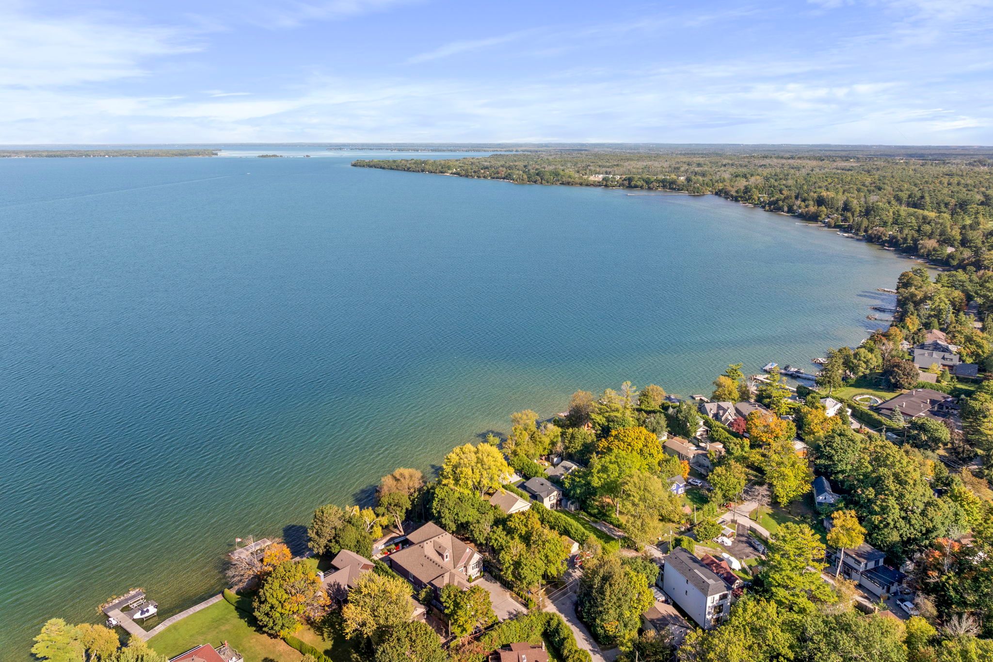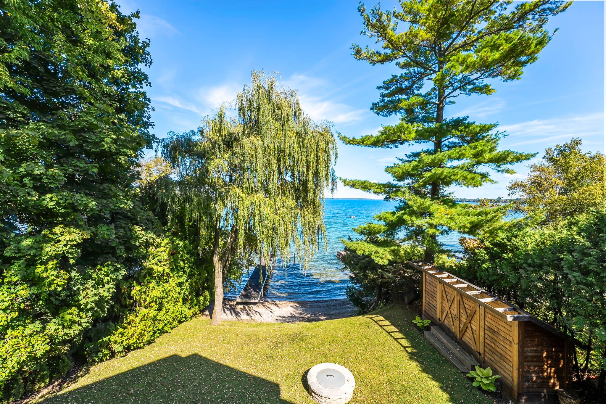 Welcome to your haven of tranquility, where 60 feet of pristine shoreline meets the calm, crystal-clear waters of lake simcoe. From the moment you step inside, you'll be captivated by the expansive windows and glass sliding doors that frame breathtaking, panoramic lake views, seamlessly connecting indoor and outdoor living. The main floor dazzles with an open-concept great room featuring a peninsula gas fireplace, engineered hand-scraped hardwood flooring, and pot lights, creating an inviting and warm atmosphere. The chef's kitchen is a true showstopper, boasting cambria quartz countertops, a breakfast bar, pass-through, gas range, and sleek stainless-steel appliances-perfect for entertaining. A main-floor office with convenient yard access and a three-piece bathroom enhances functionality, complemented by a separate utility room/pantry. Step outside and unwind on the new deck with glass railings or seek comfort under the covered porch, where you can relax and take in the soothing lake views and sounds of nature. Gather with friends and family around the stone fire pit for cozy evenings under the stars. The complete second-storey renovation, finished in 2023, offers a luxurious retreat with a primary suite featuring a floor-to-ceiling, stone-faced gas fireplace, vaulted ceilings, & a large private balcony overlooking the serene lake-an idyllic spot for morning coffee. The spa-like semi-ensuite bath pampers you with a deep soaker tub with water views, heated floors, and elegant five-piece fixtures. The convenience of second-floor laundry, along with a spacious dressing room or flex space, adds to the thoughtful layout. Two additional sun-filled bedrooms complete the upper level, offering ample space for family or guests. With parking for twelve vehicles and ample room for a future garage, this exquisite waterfront property is fully equipped to host family, friends, and all your year-round adventures. Don't miss your chance to own this exceptional lakeside retreat!
