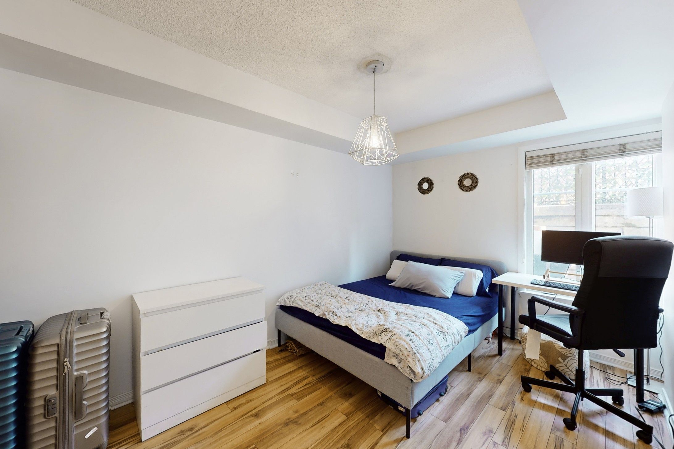 • Spacious bedroom with a large window and custom built-in closet.
