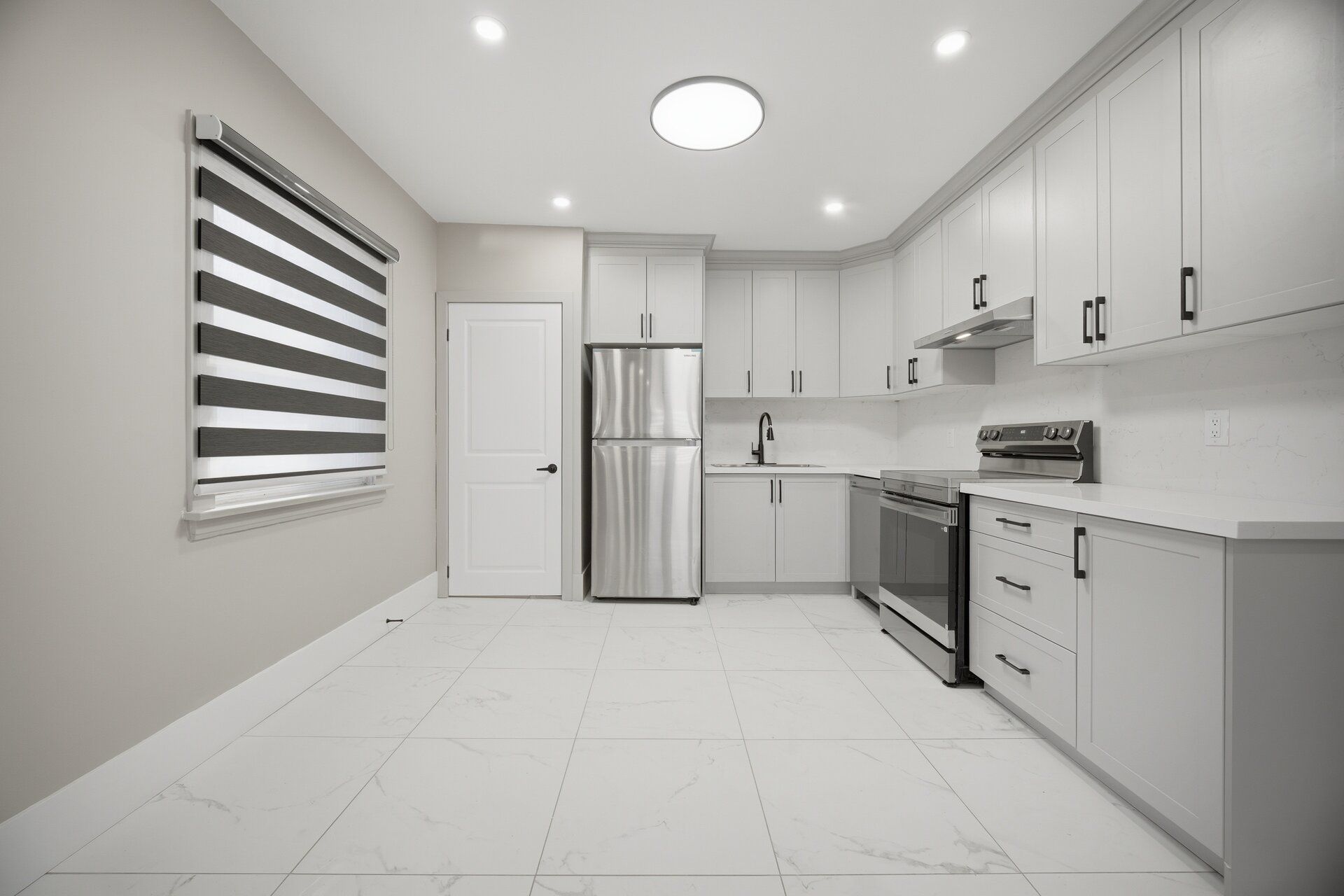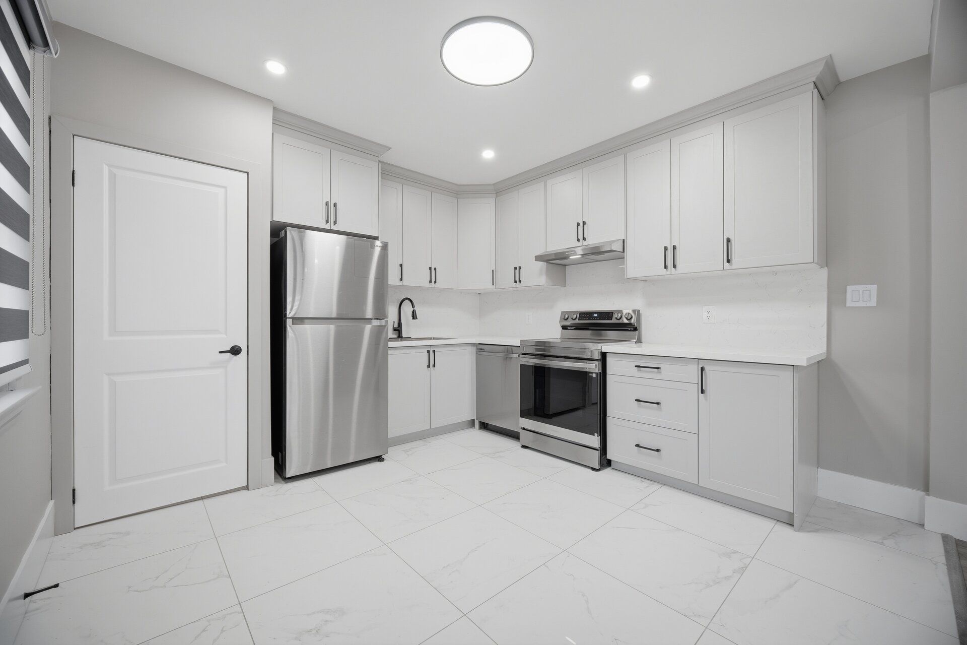 • Contemporary kitchen with stainless steel appliances and quartz countertops.