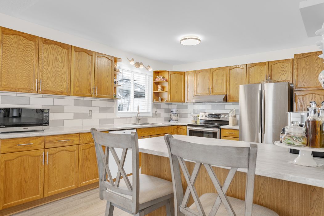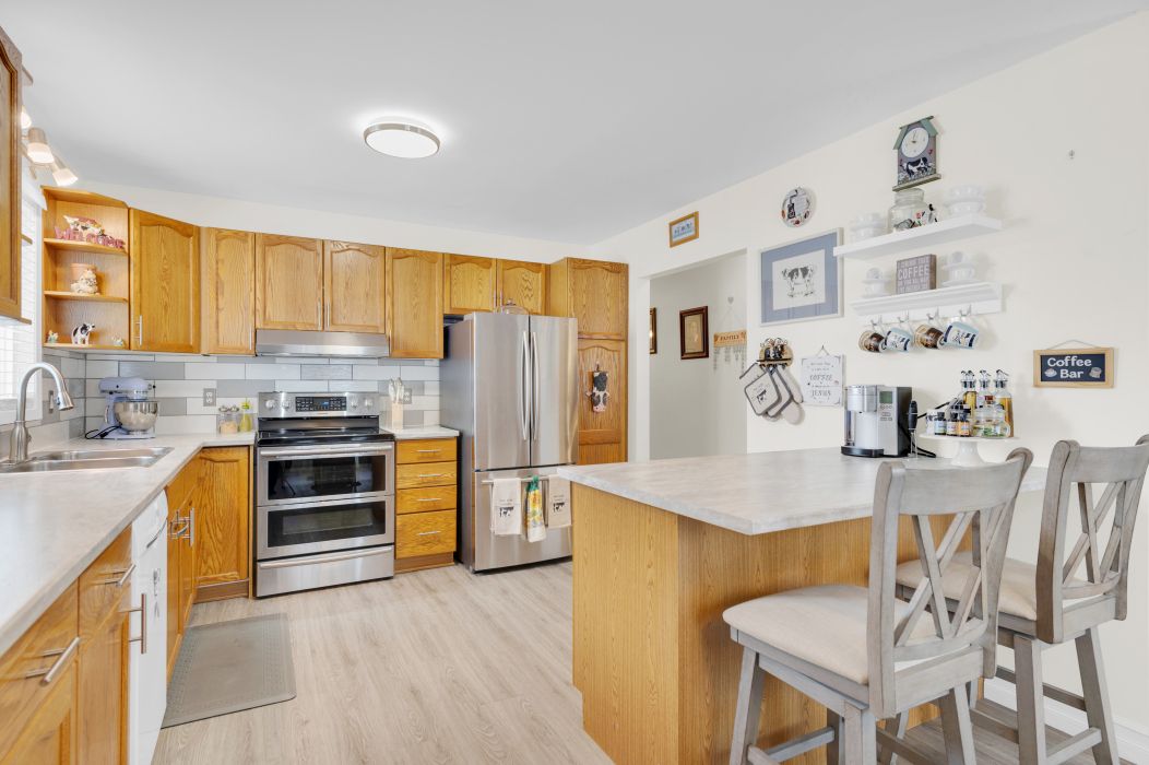 • Bright open concept kitchen and dining area with modern updates and breakfast bar.