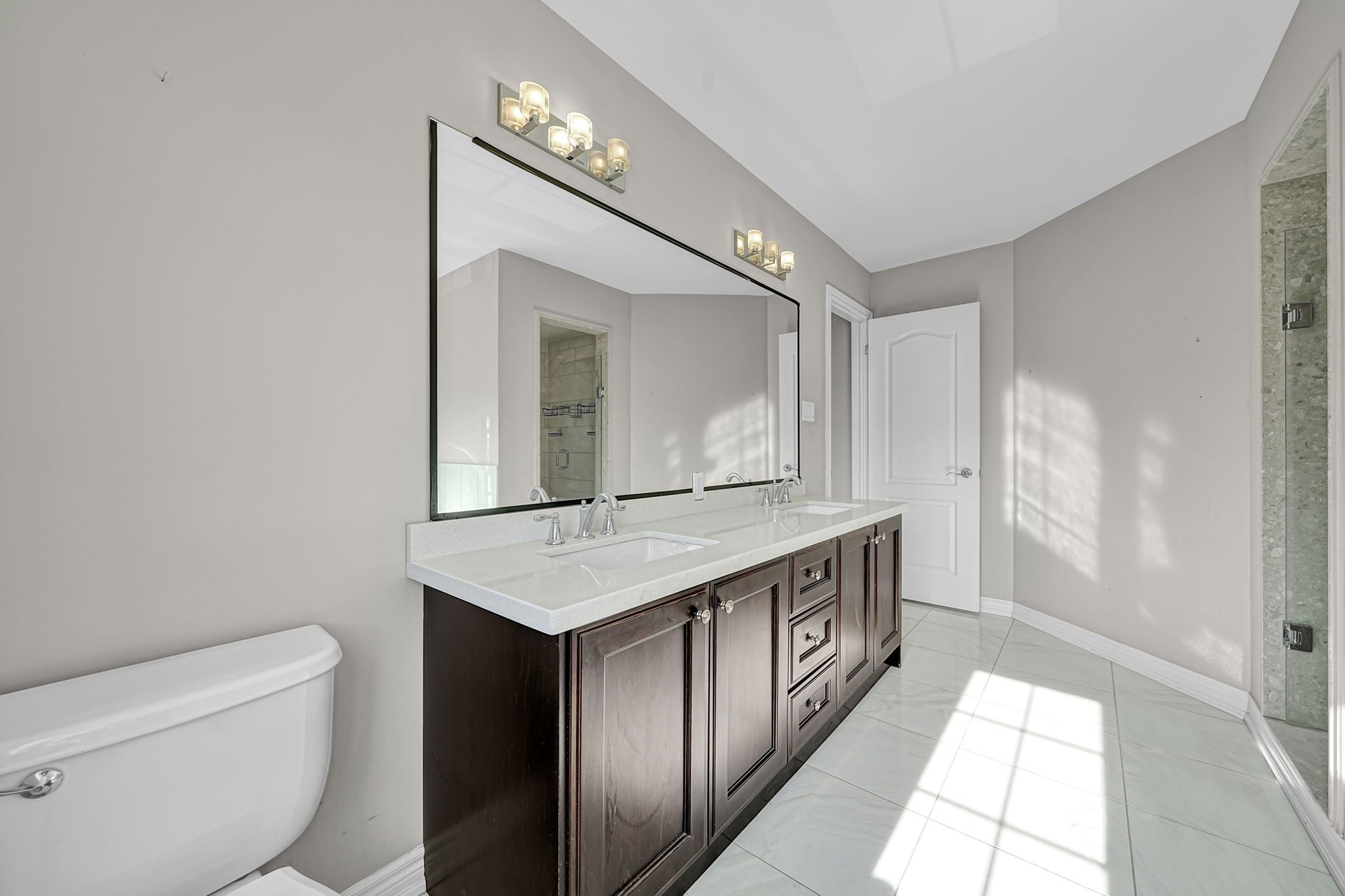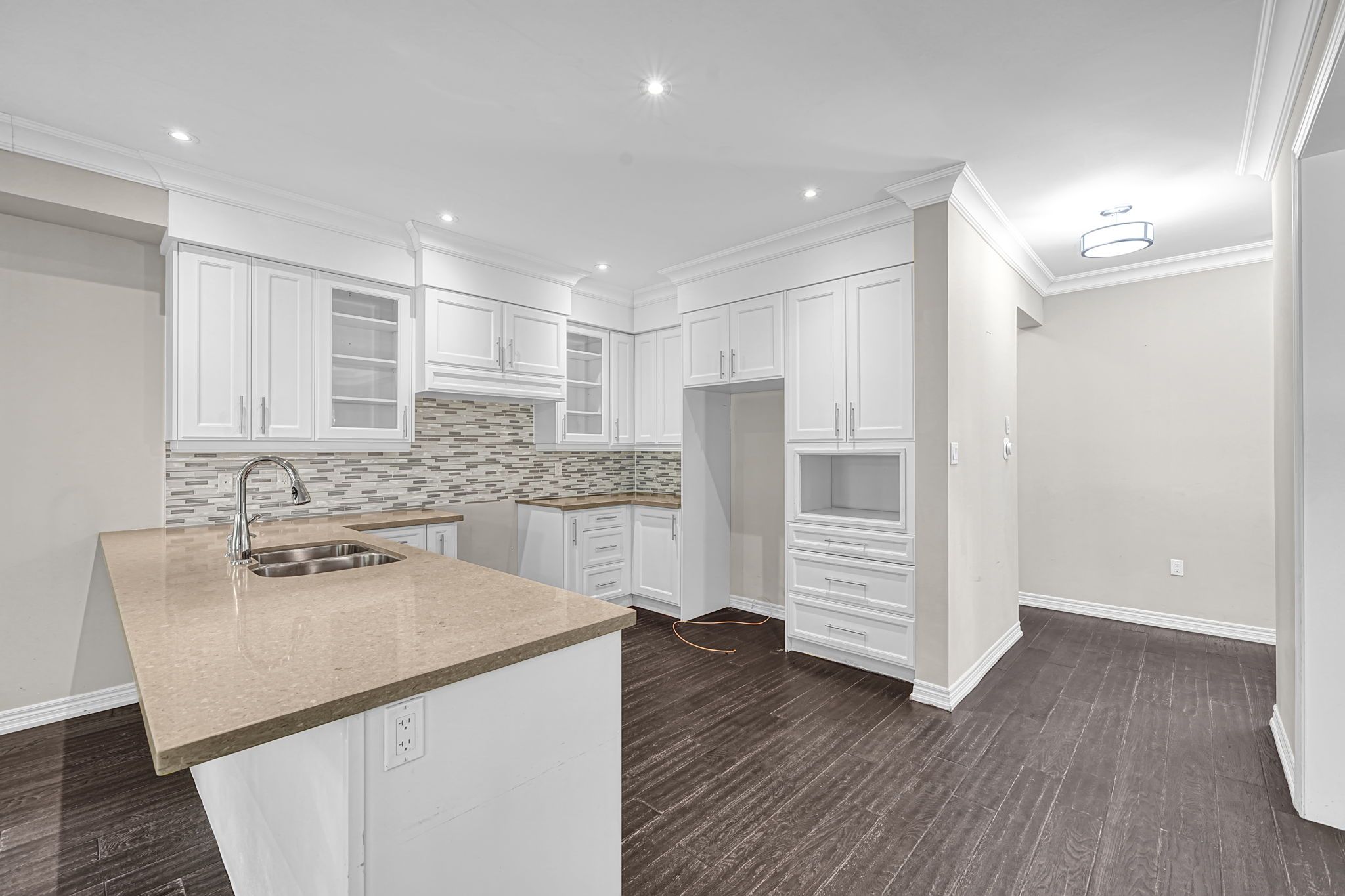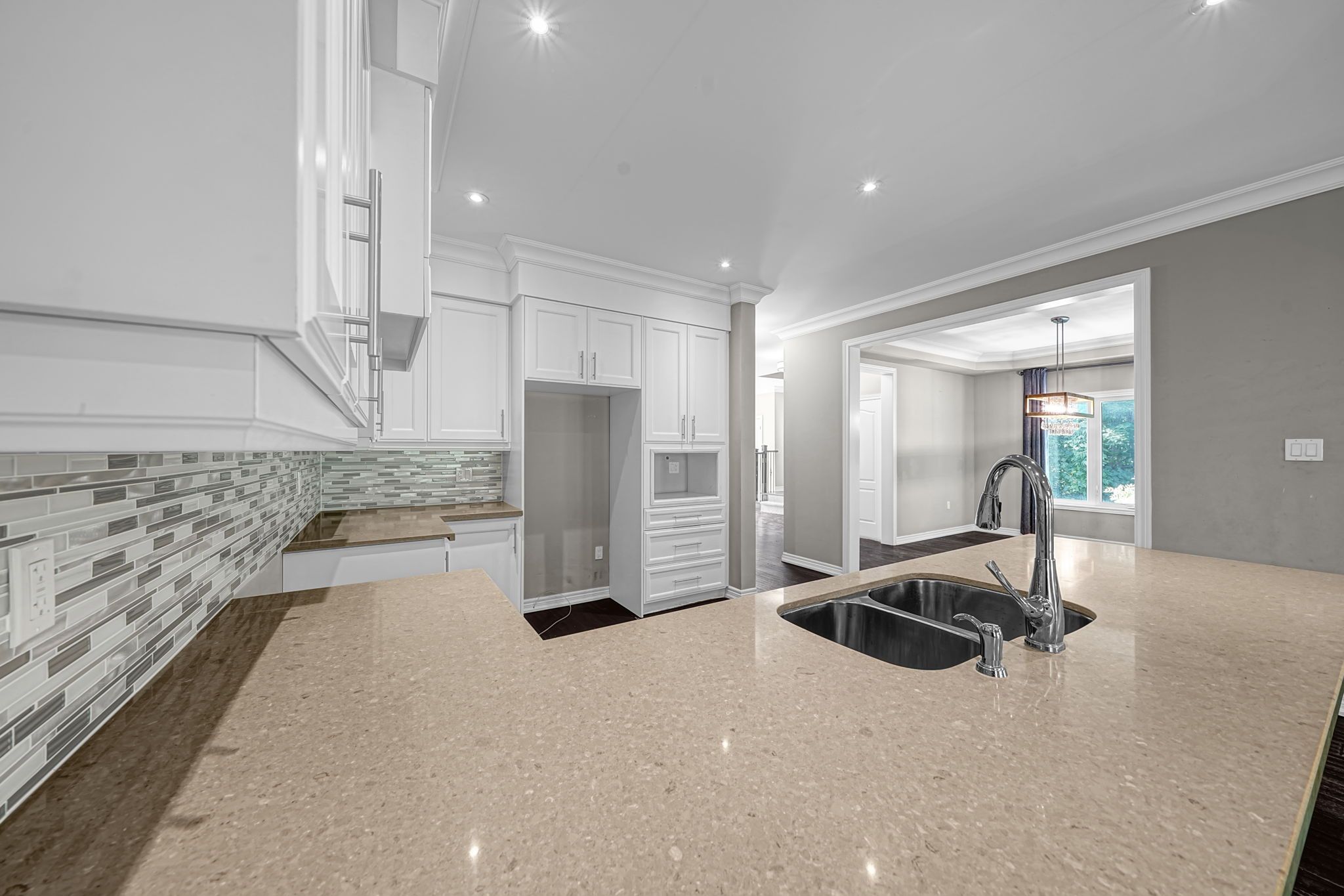 • Modern kitchen with upscale finishes and elegant light fixtures.