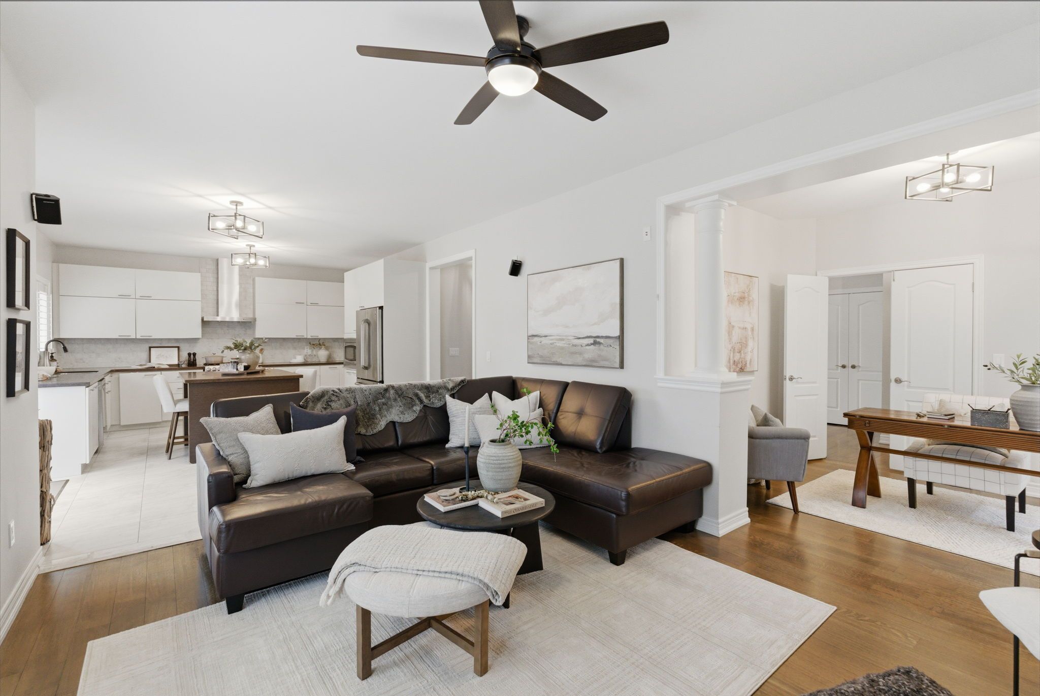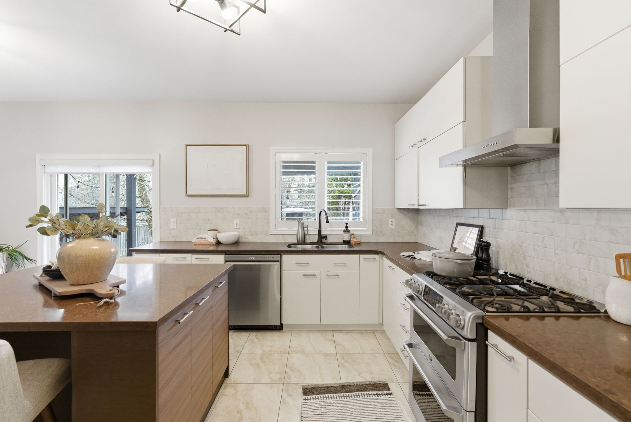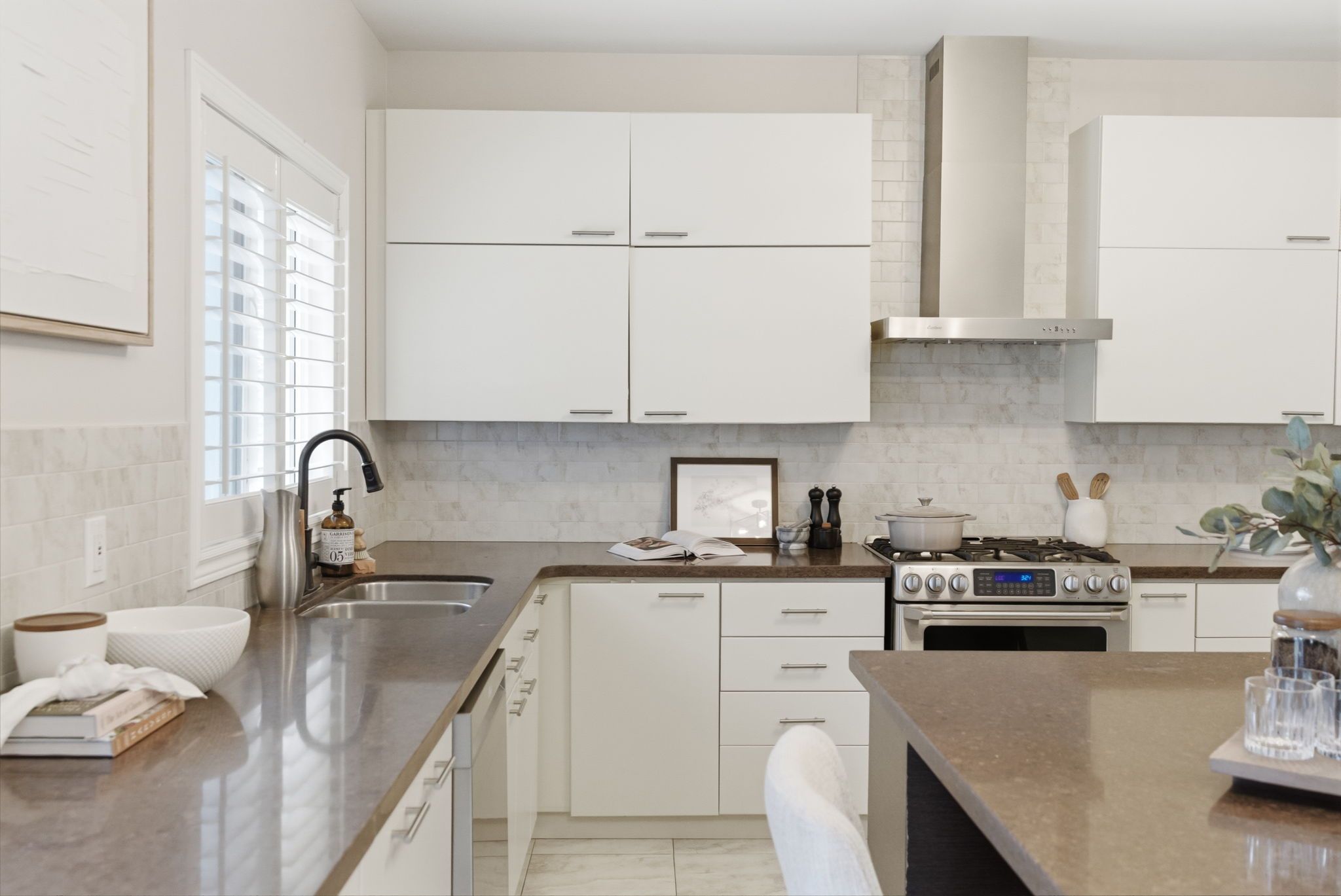 • Modern kitchen with quartz counters connects to a family room and patio.