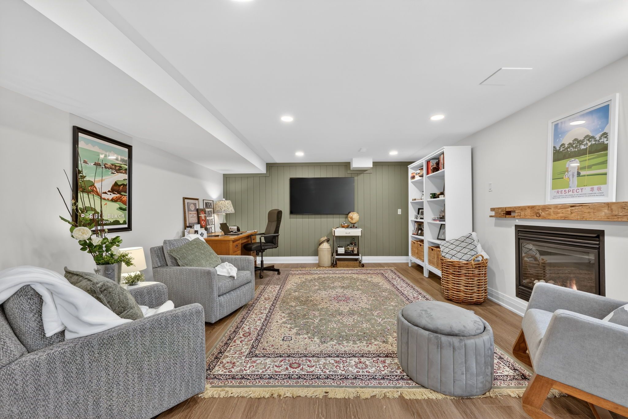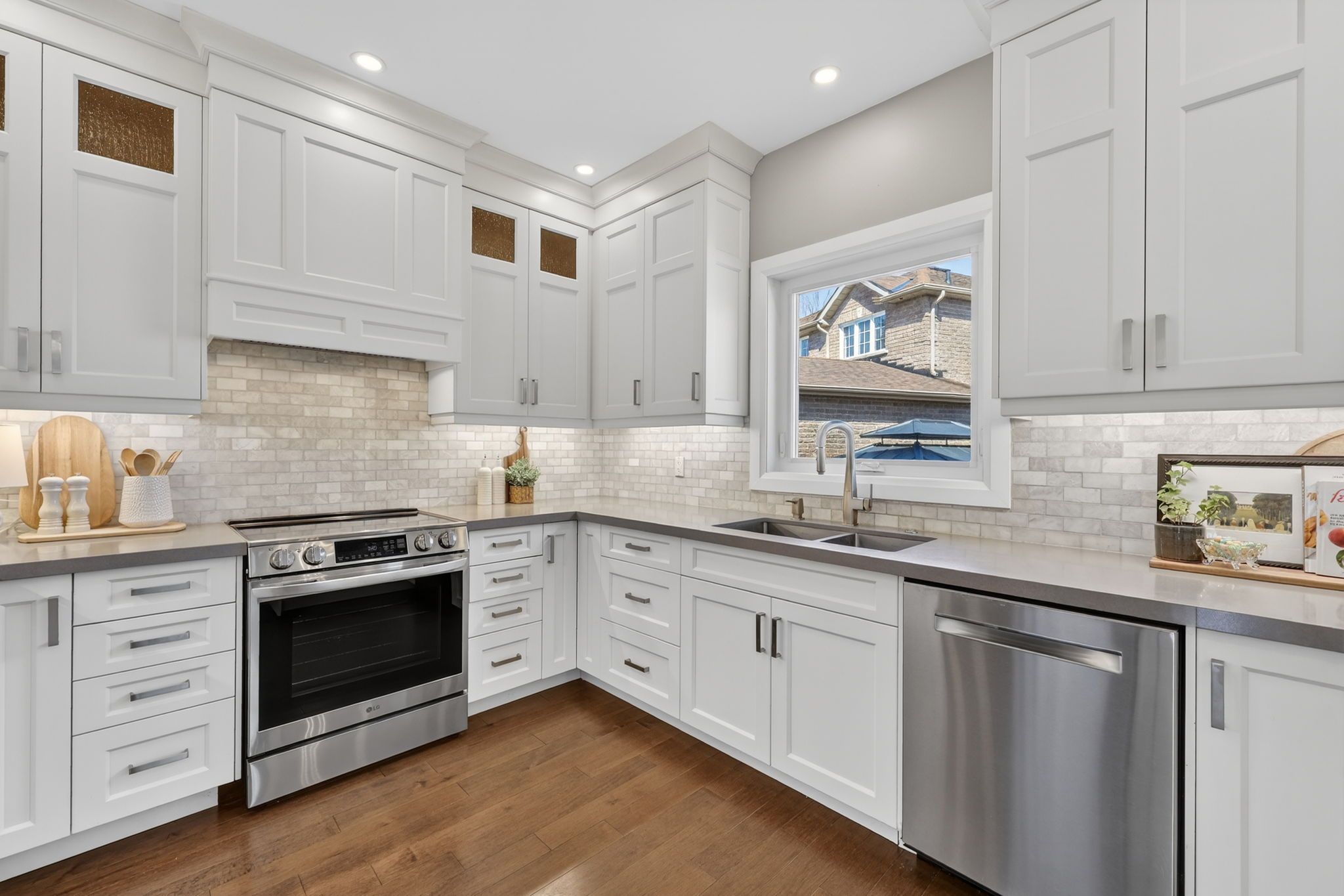 • Upgraded interior with hardwood flooring, custom fireplace, and modern kitchen finishes.