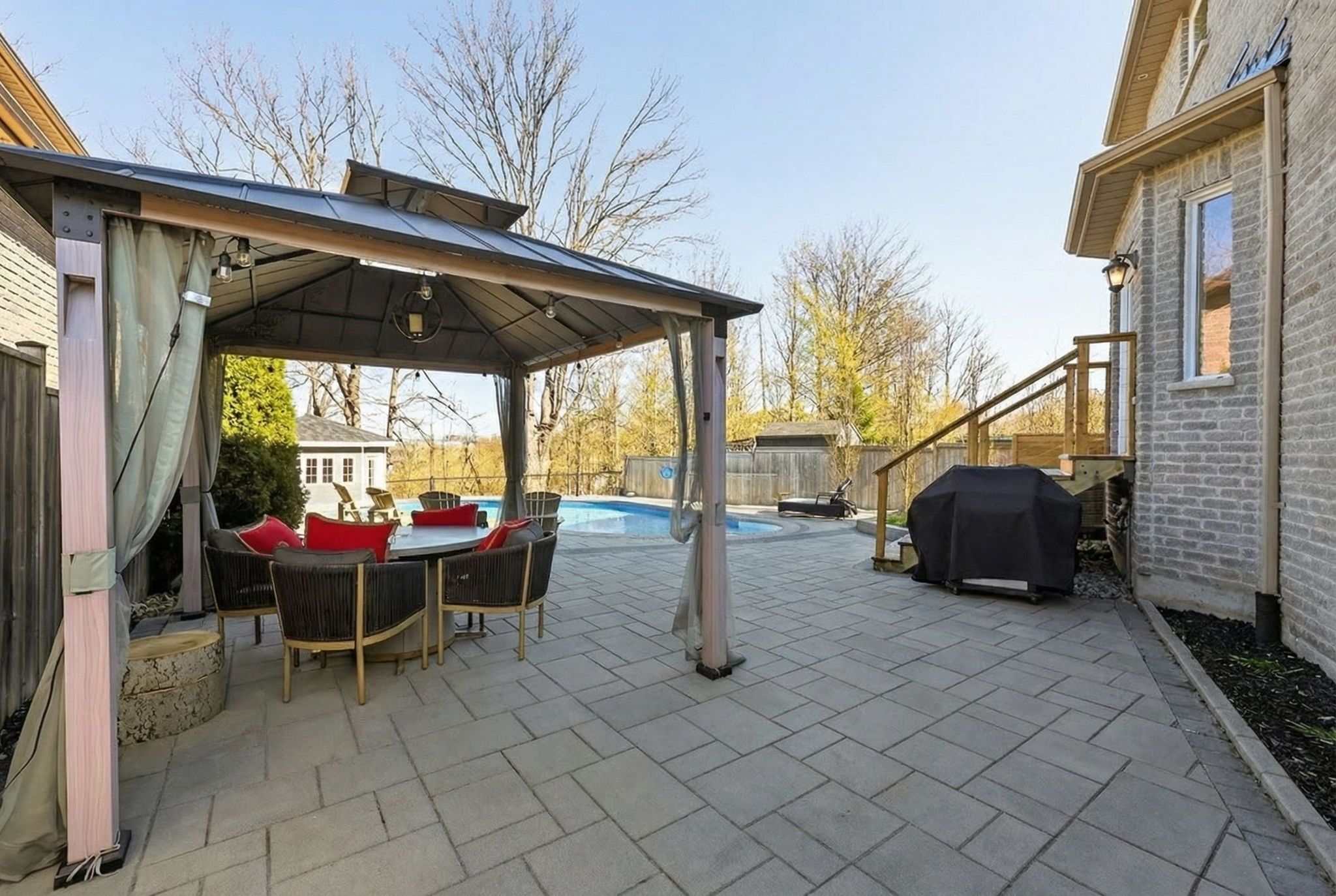 Showstopper designer home with new in-ground pool & backyard oasis! Located in barrie's prestigious osprey ridge neighbourhood - surrounded by shops, trails, barrie golf & country club with magical elevated views of little lake! Backing onto pond & greenspace! The interior of this home has been immaculately maintained & upgraded with hand picked designer finishes, including; hardwood flooring, solid wood spiral staircase with wrought iron spindles, custom gas fireplace feature w/ authentic barn board mantel, full sized mudroom with laundry & built in shelving! Stunning modern kitchen w/ crown moulding, quartz counters, marble backsplash, glass display cabinetry and serves as the heart of the home with easy flow to the formal dining room & your beautiful backyard! Forest & pool views from every rear window! Upstairs boasts four large bedrooms, two with serene forest views, huge primary retreat with his/ her closets & five piece en suite! Incredible backyard with new salt water pool and custom stone/ hardscaping - amazing for entertaining & peaceful relaxation! New fully finished basement with two bedrooms, full bathroom, gas fireplace & bright above grade windows! Located at the end of a quiet court with 54' of frontage! Walk to hospital, pubs, shops, bayfield st shopping, golf course, trails & so much more! New pool '20. New deck '25. New gazebo '24. Custom fireplace feature '25. New broadloom '24. New whole house paint '25. New water softener '26. New reno basement '25. New under soffit lighting '24. New updated lighting '25.