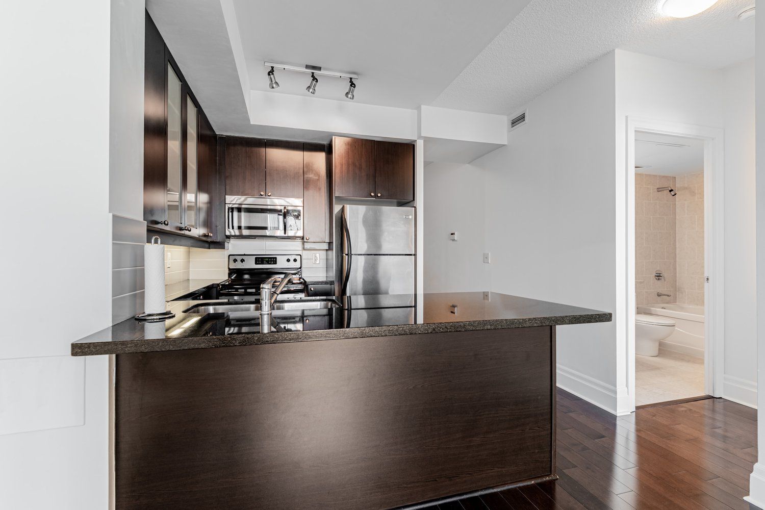 You won't want to miss this! Spacious 1 bed, 1 bath apartment in desirable unionville, markham with parking and locker. Open-concept layout - perfect for entertaining w/9ft ceilings, modern kitchen with stainless steel appliances and breakfast bar, spacious bedroom, and tasteful full bathroom. Tons of storage. Walk-out to the private balcony offering view of downtown markham. Only steps away from shopping, restaurants, cinema, transit, go station, hwy 407, hwy 404 and york university.