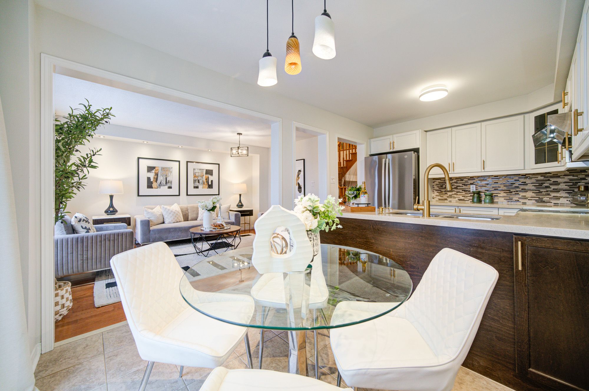 • Eat-in kitchen features quartz countertops and room for family dining.