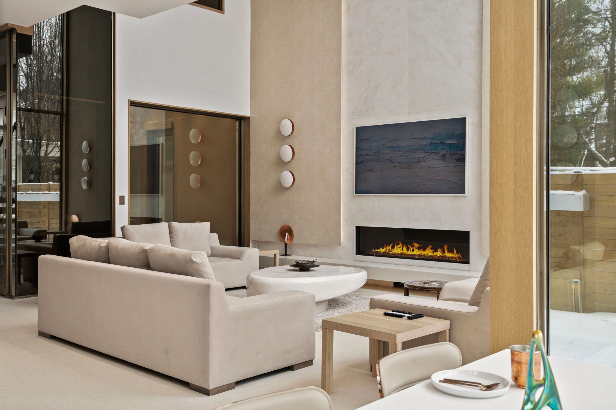 • Modern amenities include an elevator, home theater, and snow melt system.