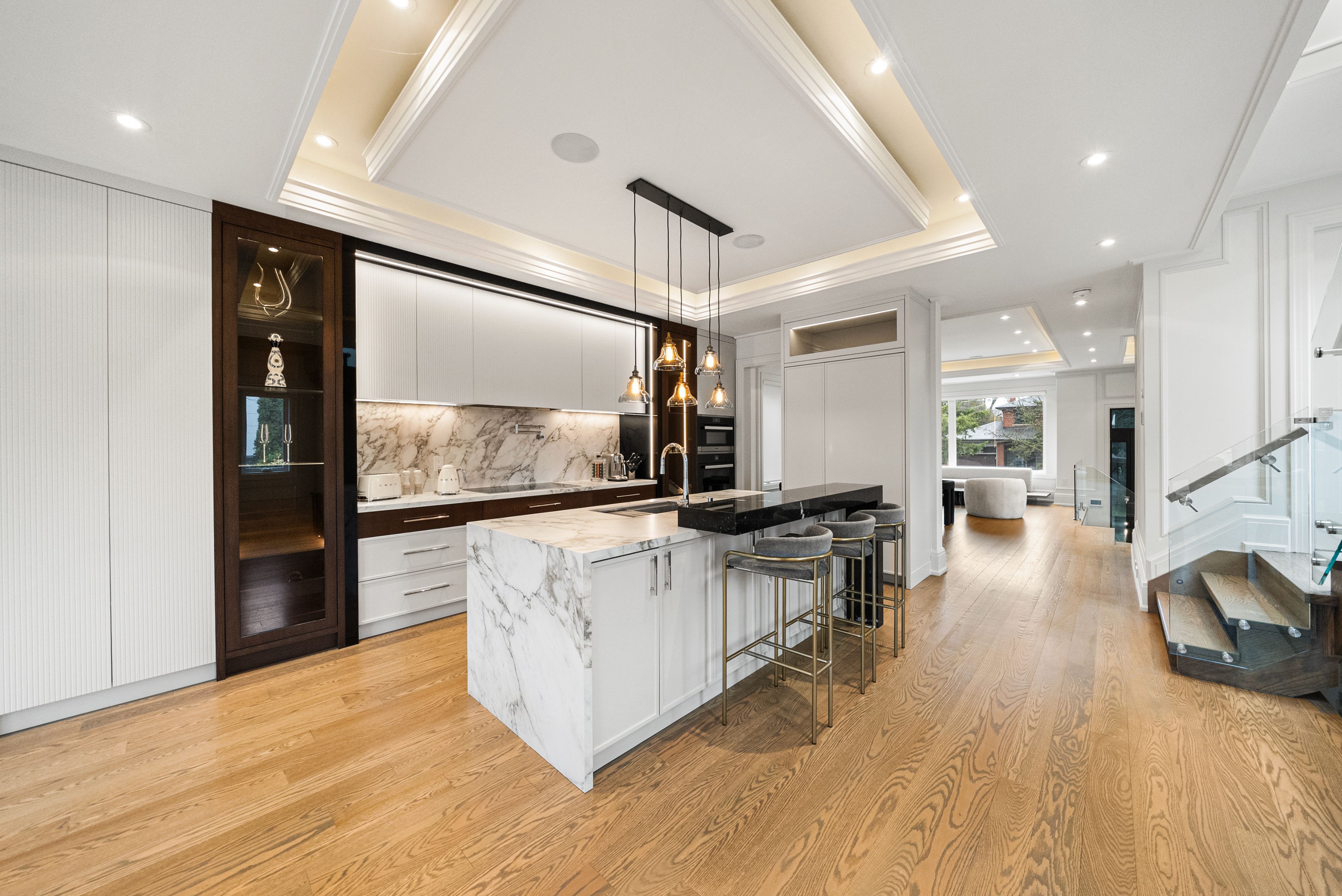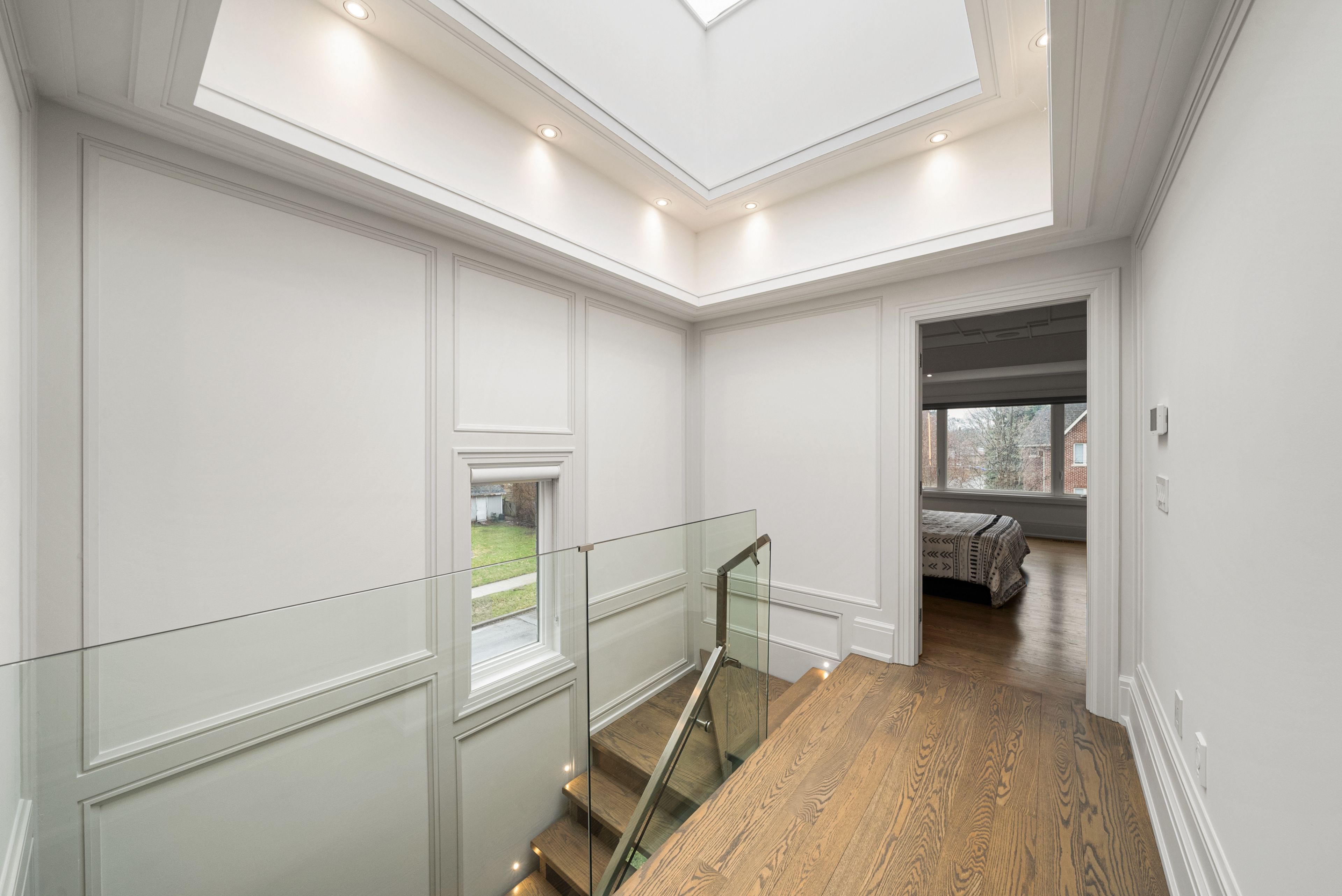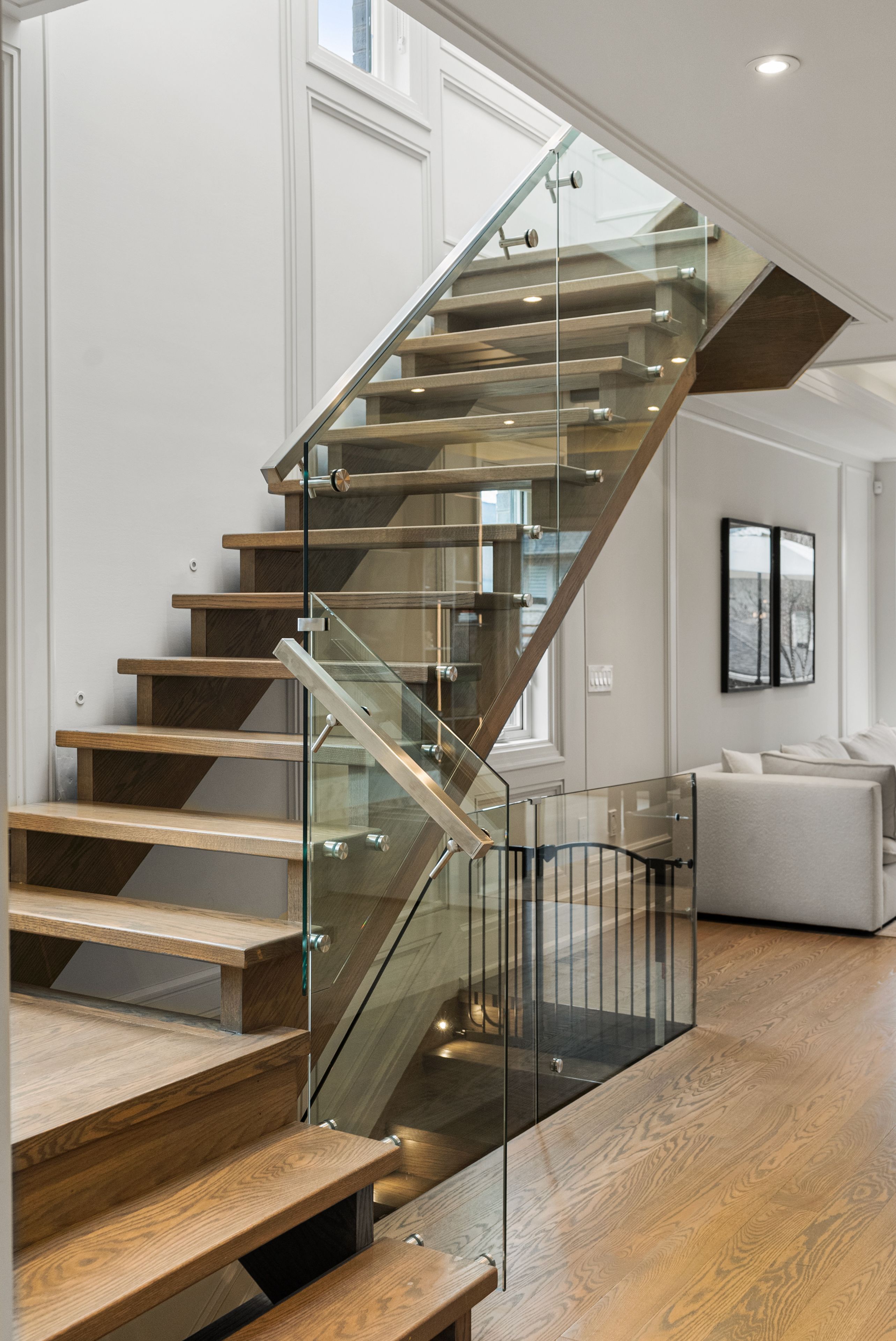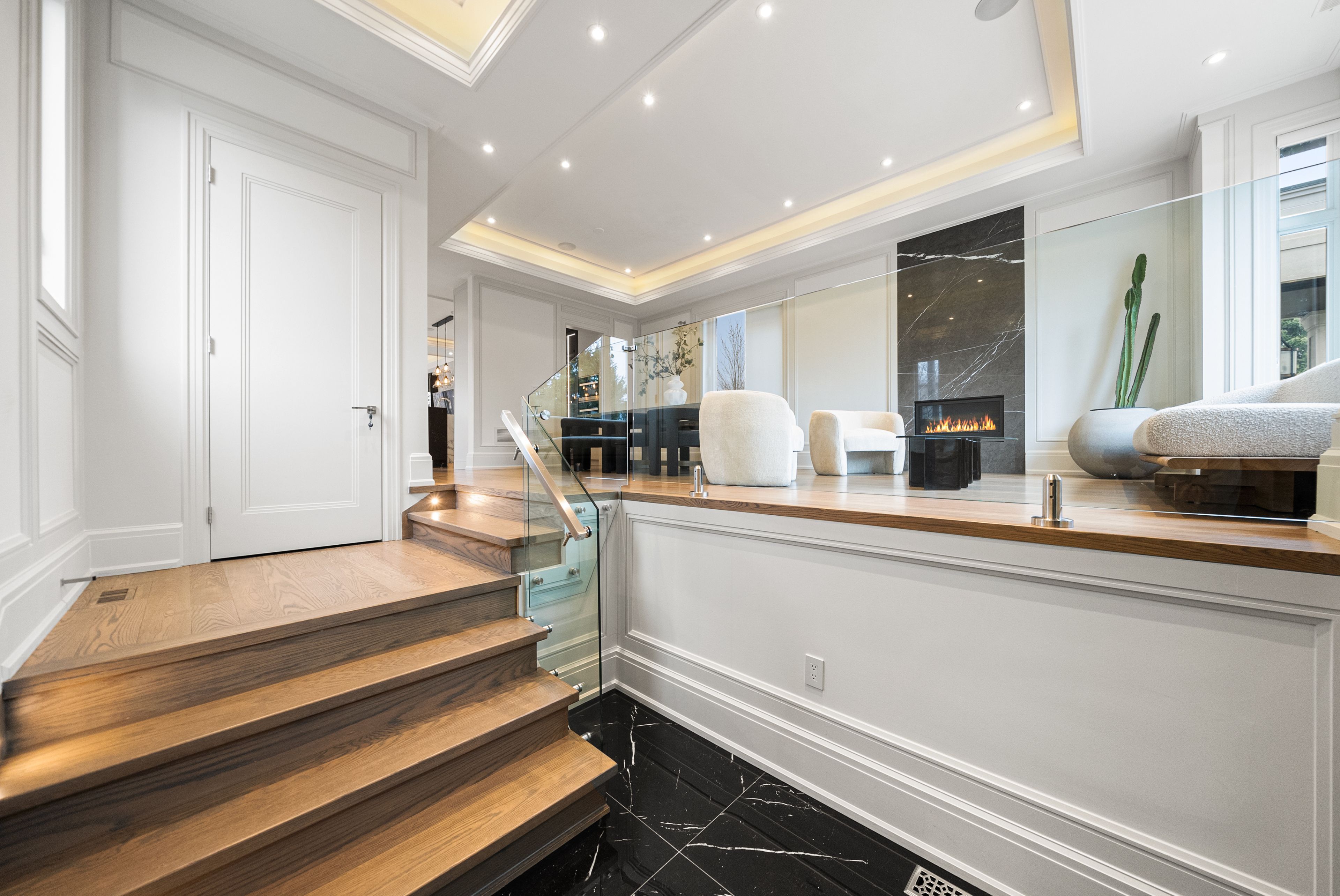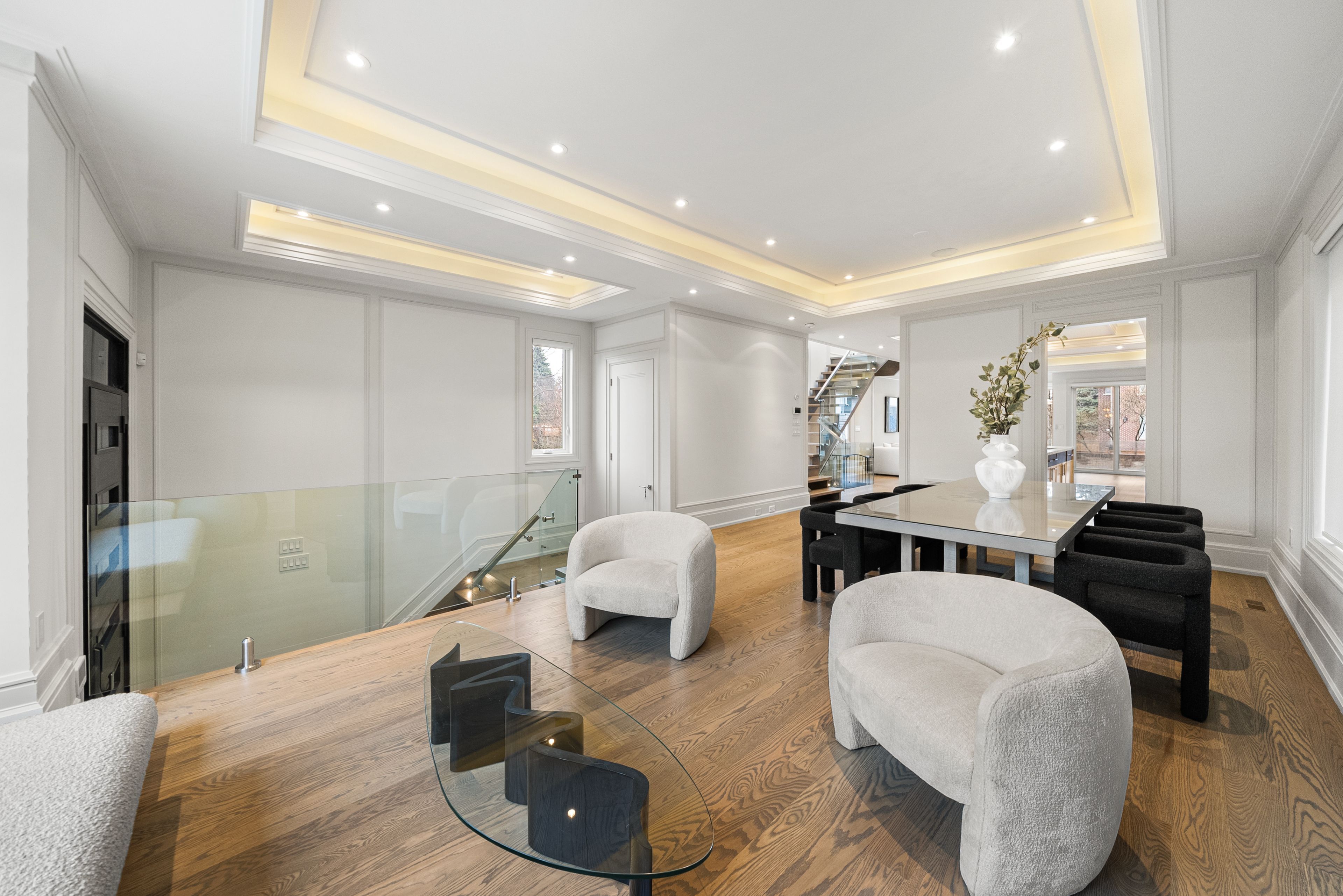 • Open-concept design with elegant oak flooring and glass railings.