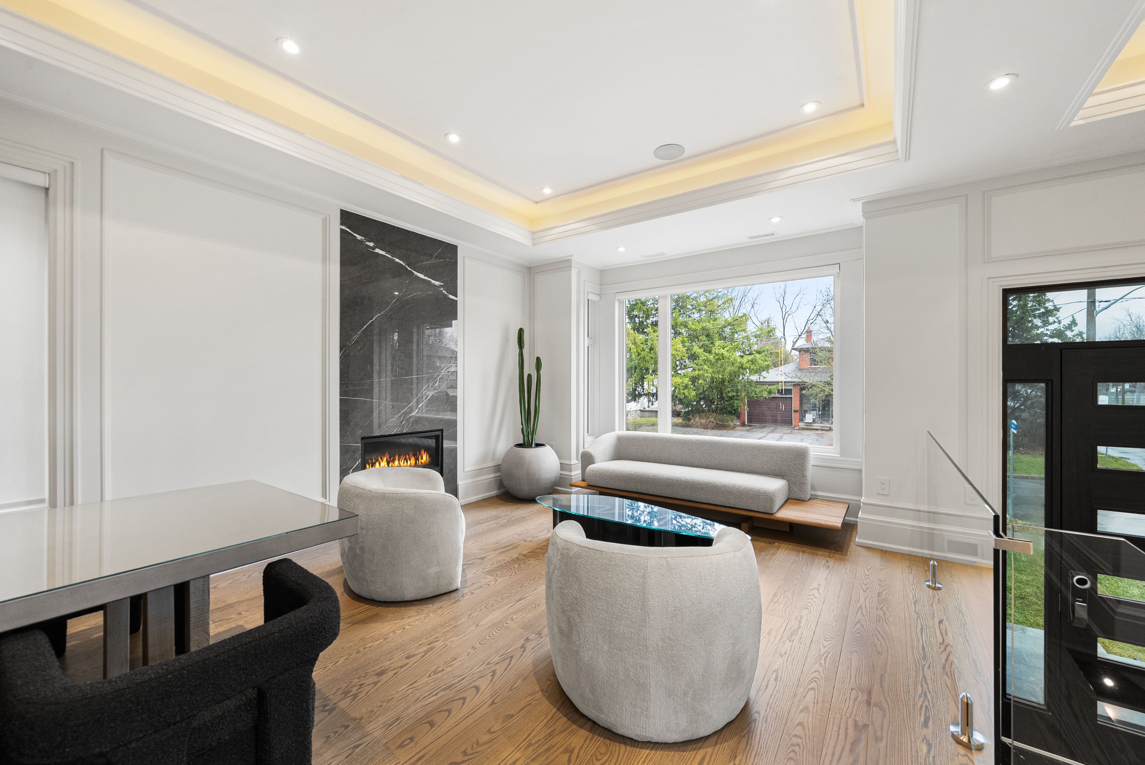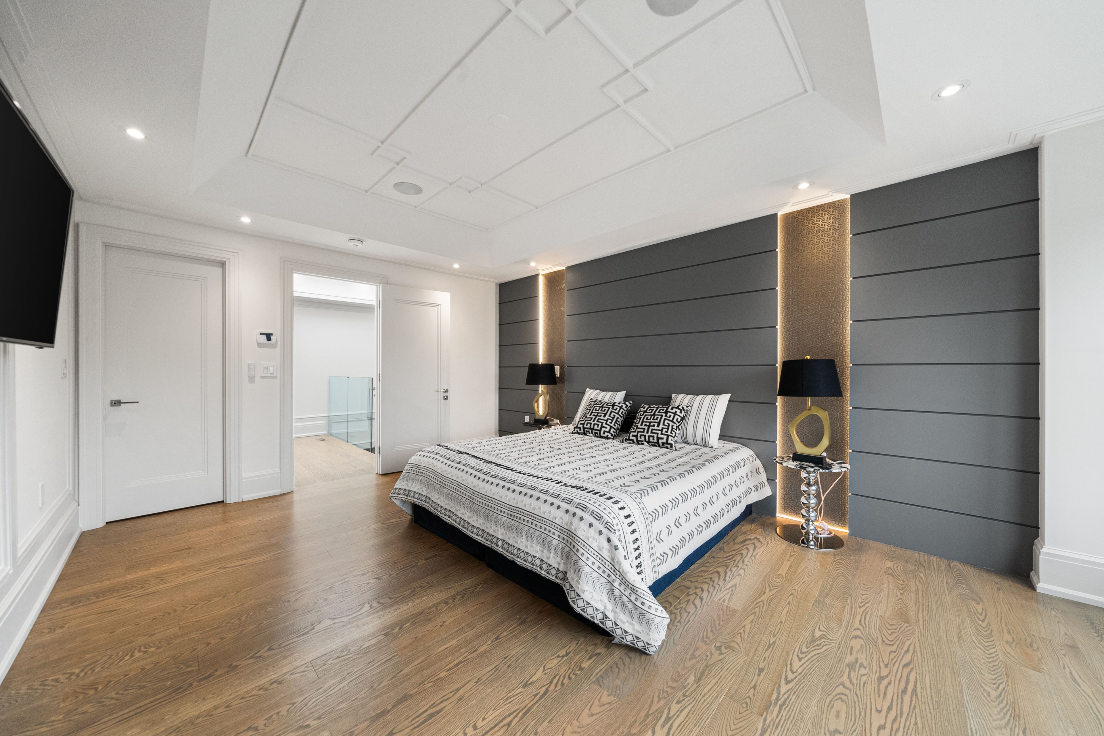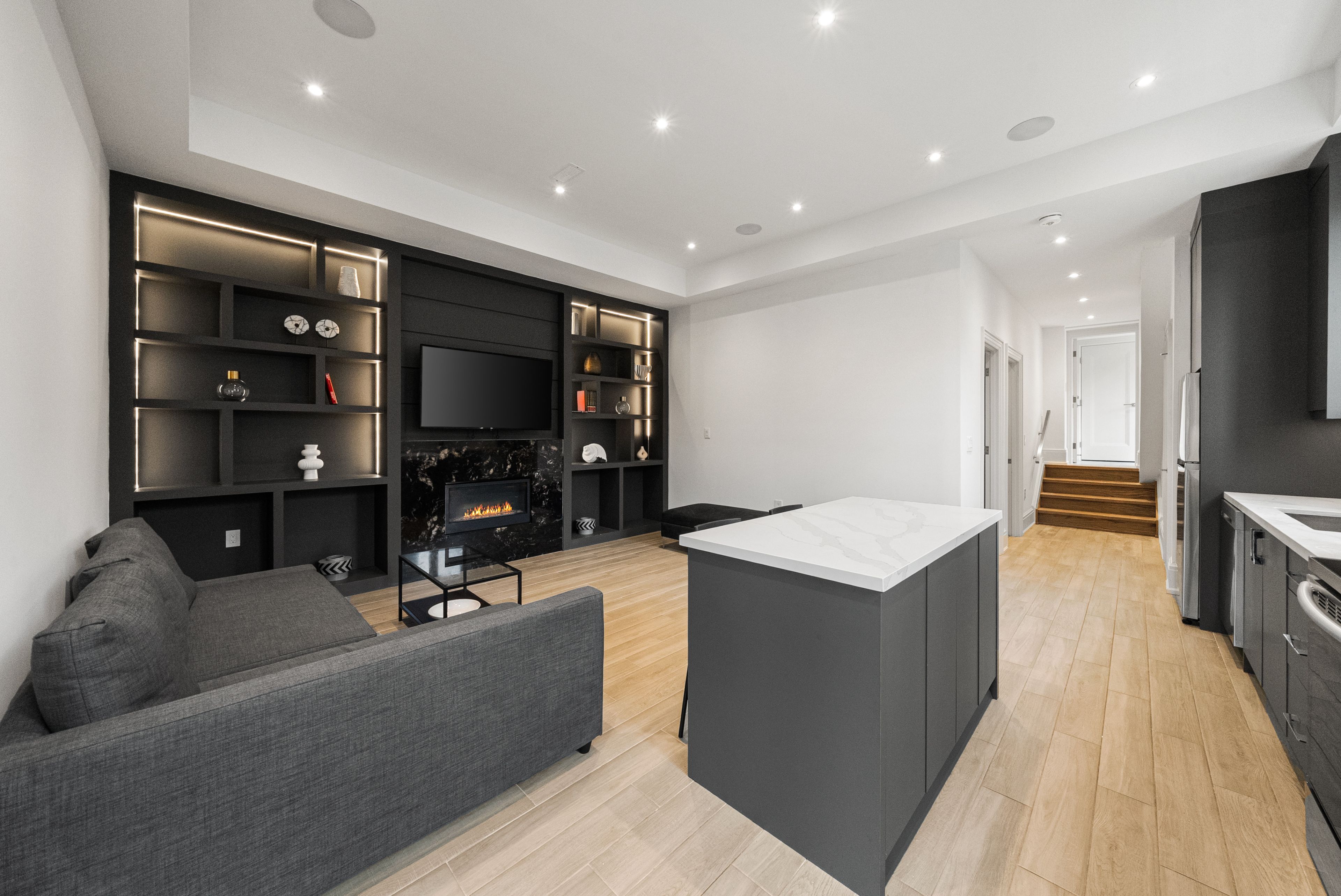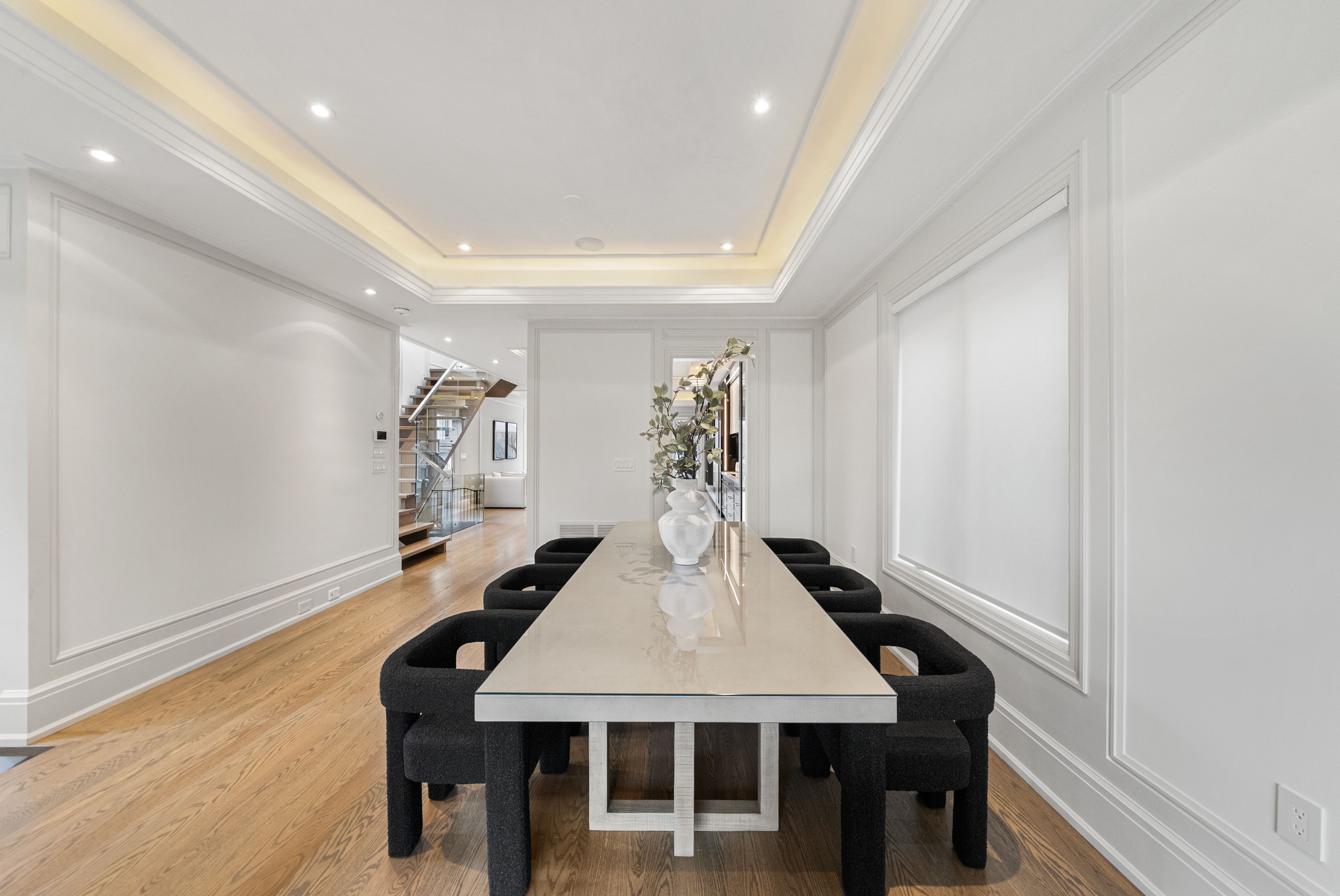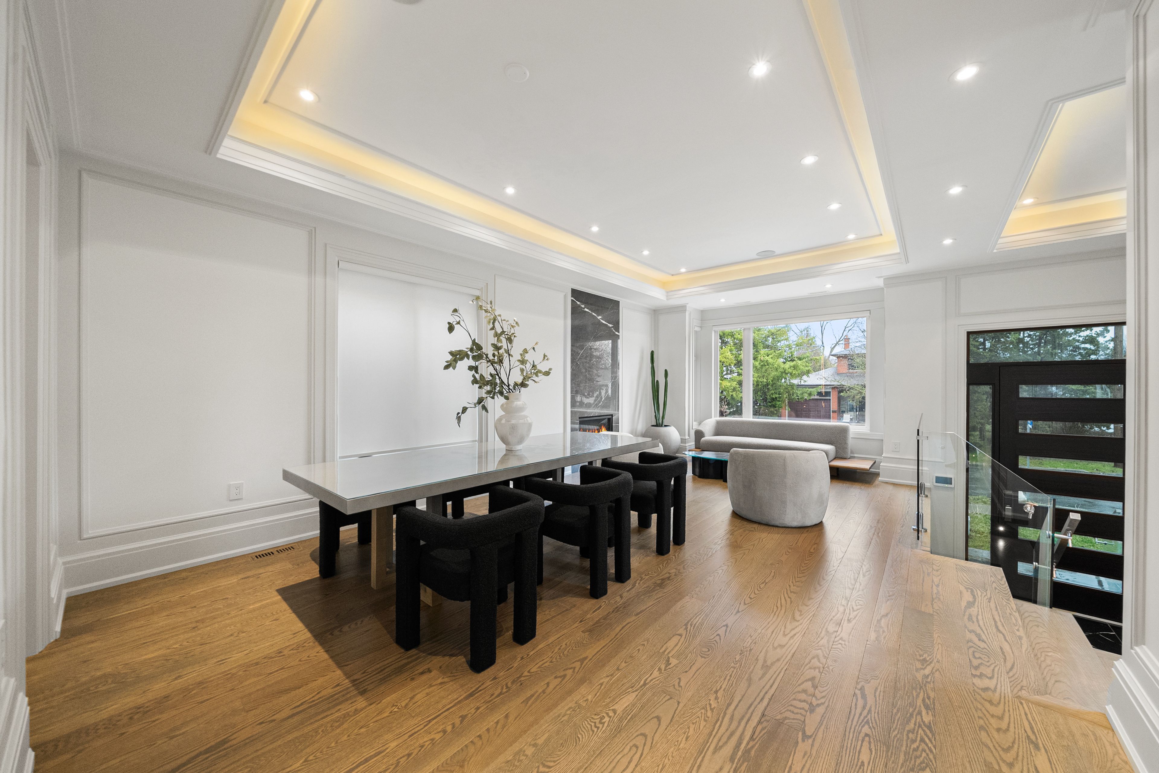 • Open-concept design with elegant oak flooring and glass railings.