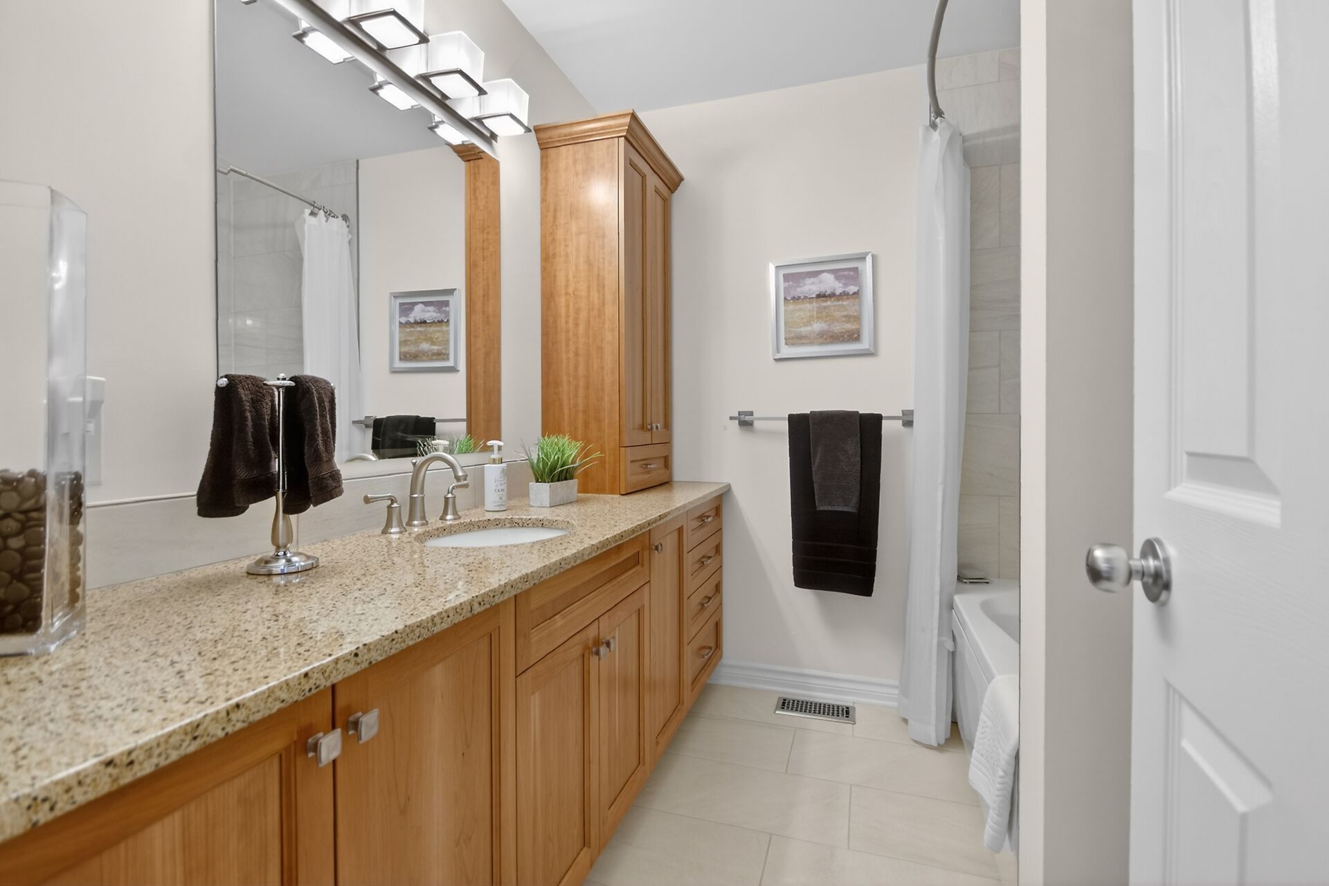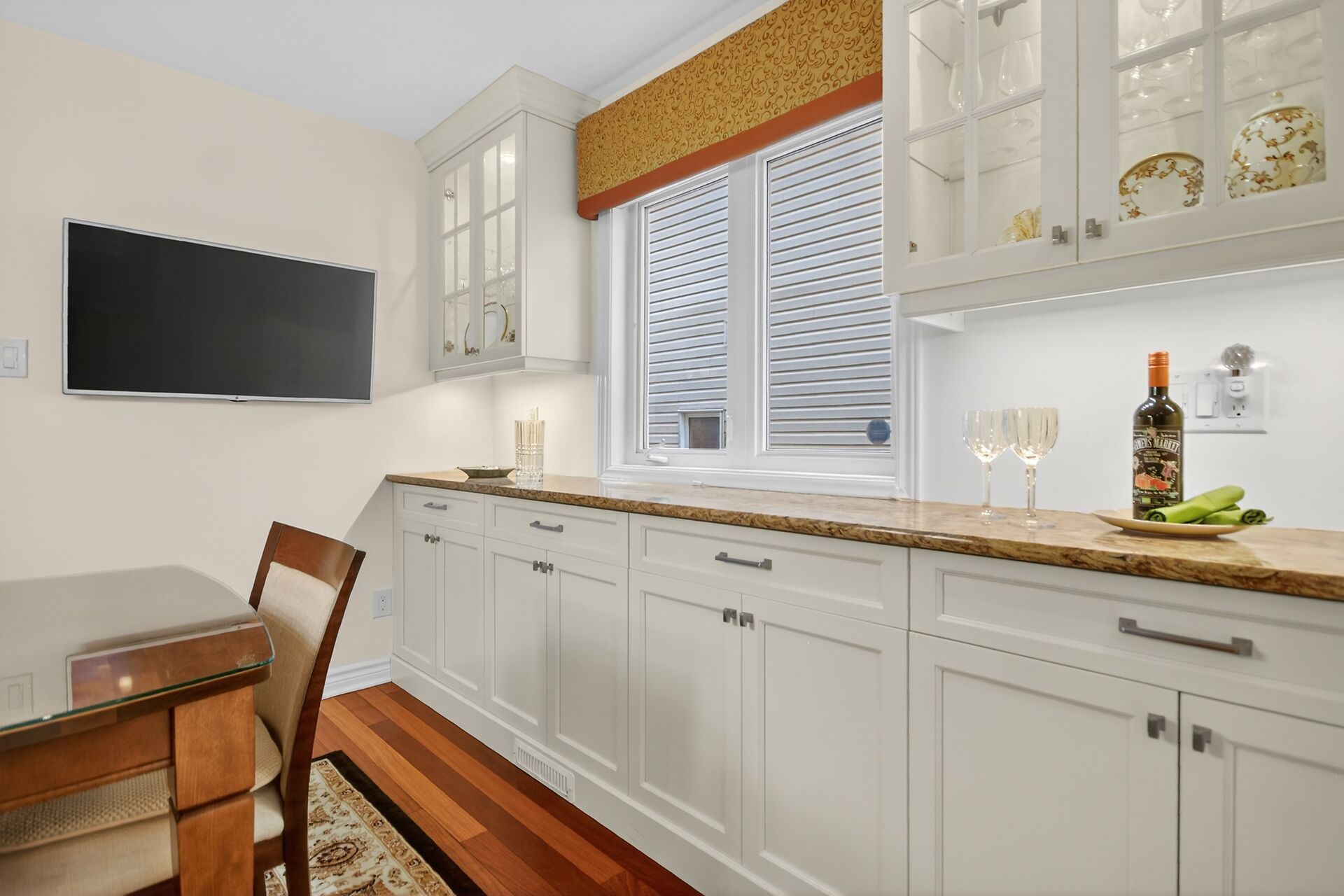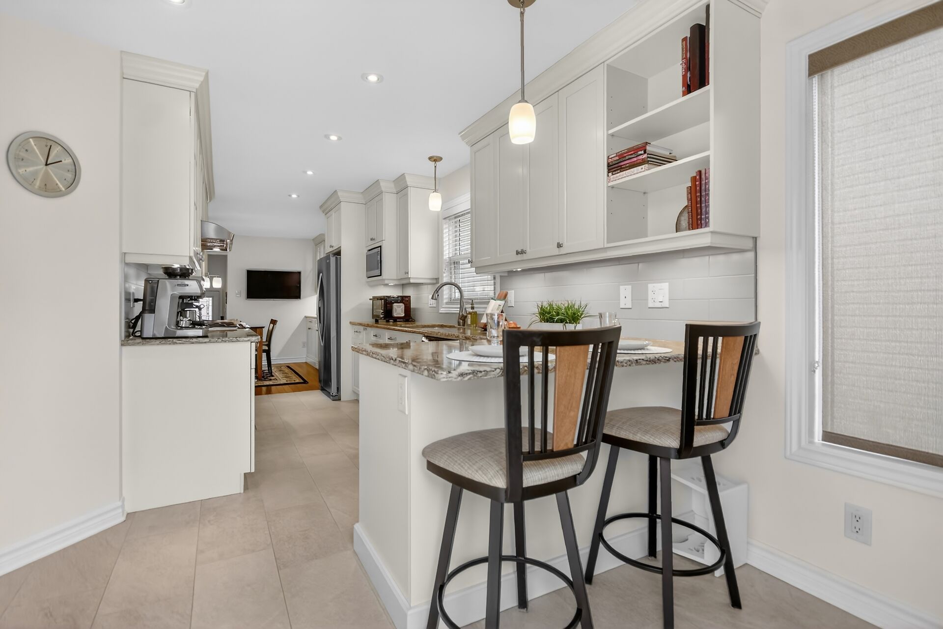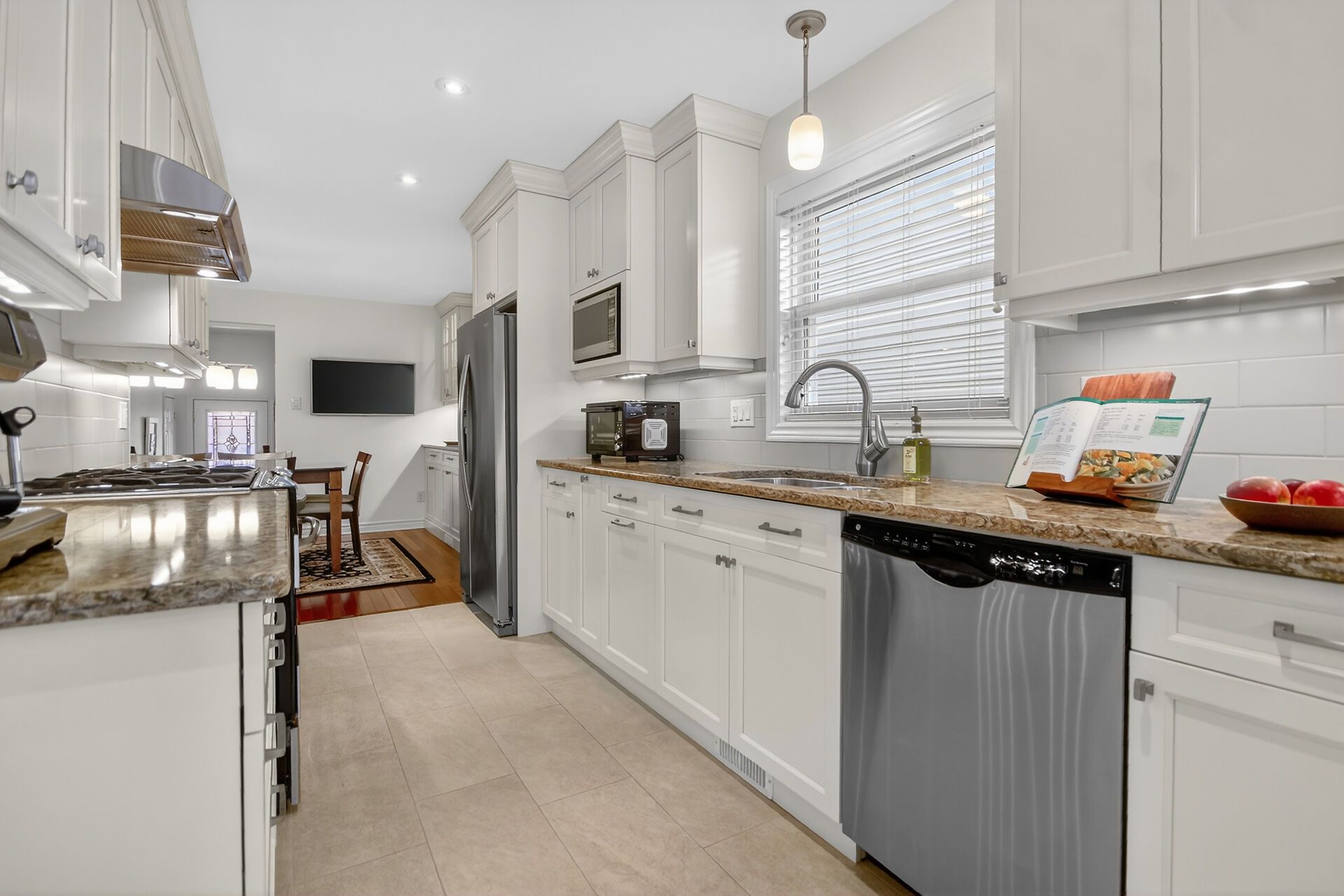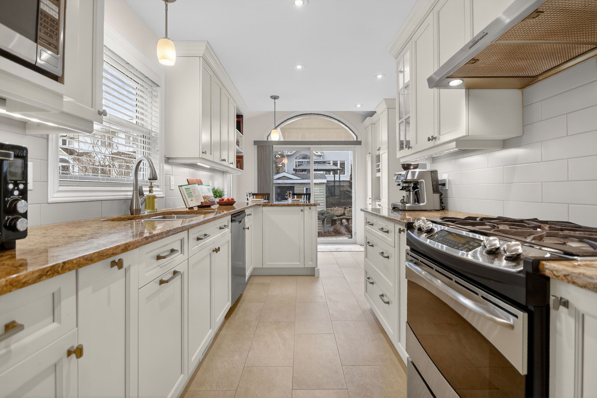 • Custom kitchen with quartz counters and soft close cabinets for functionality.