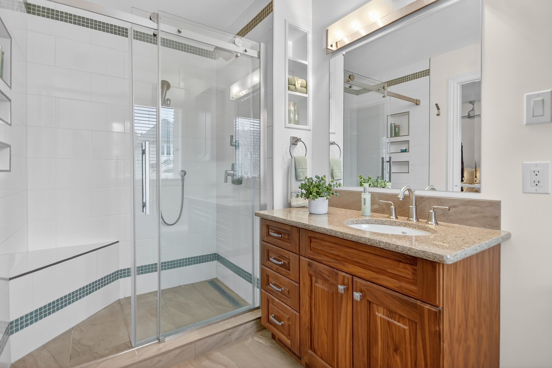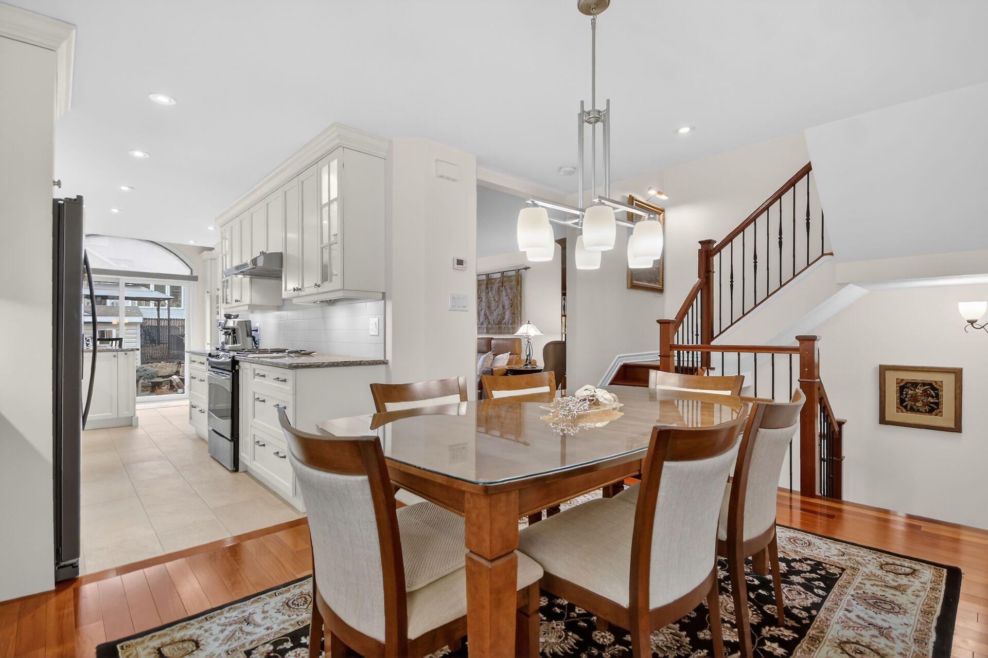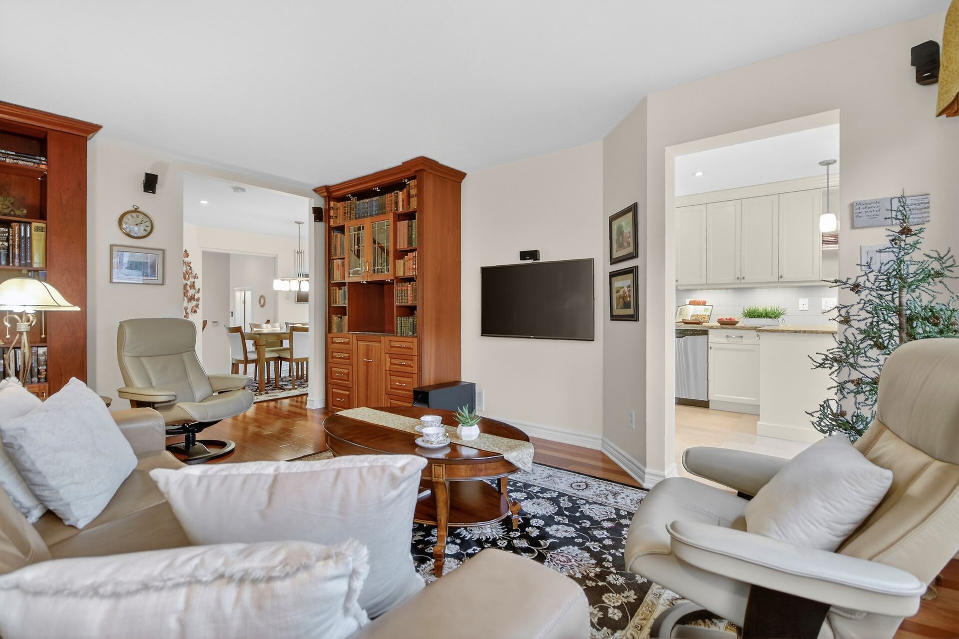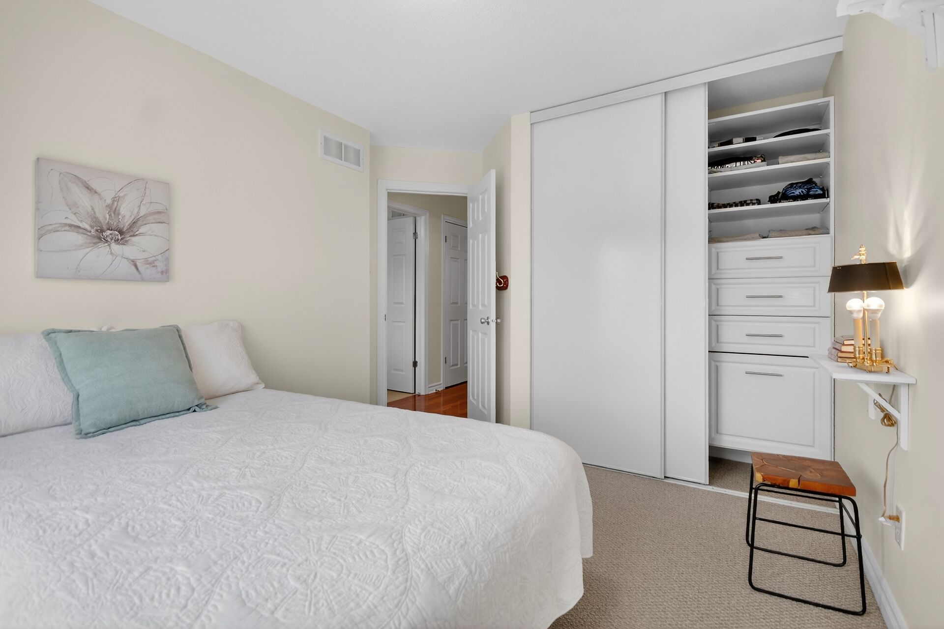 • Custom kitchen with quartz counters and soft close cabinets for functionality.