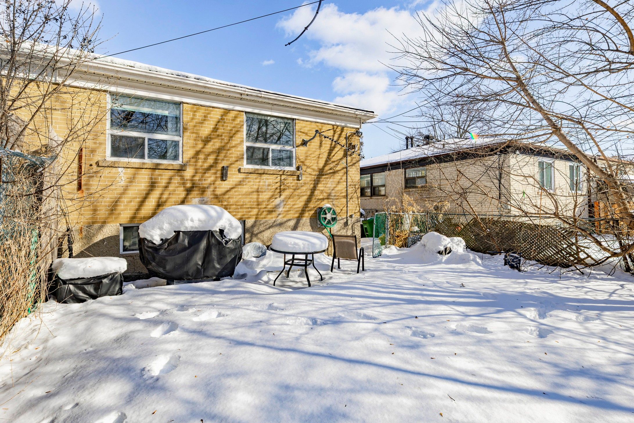• Fully fenced backyard with mature trees for privacy.