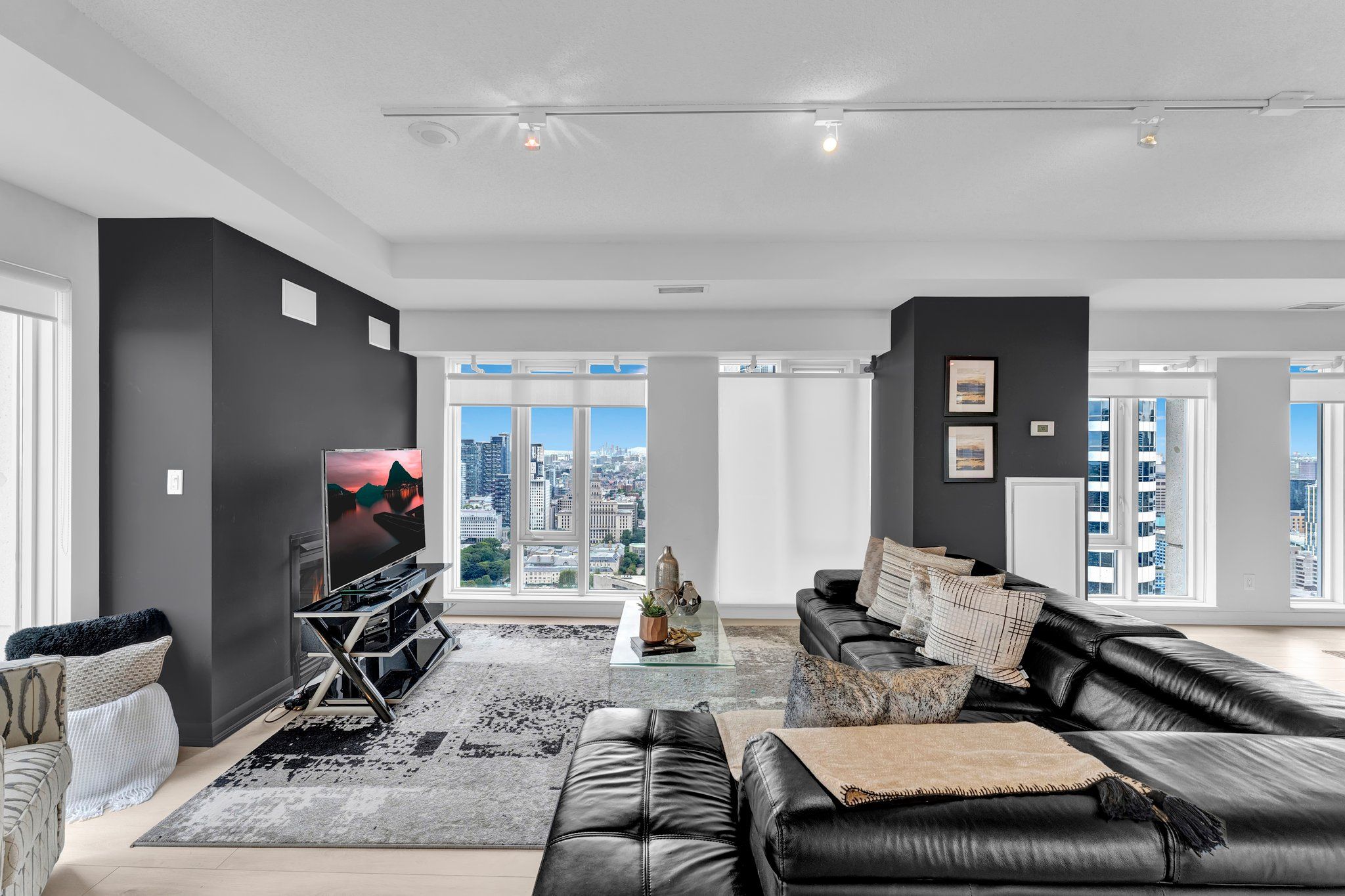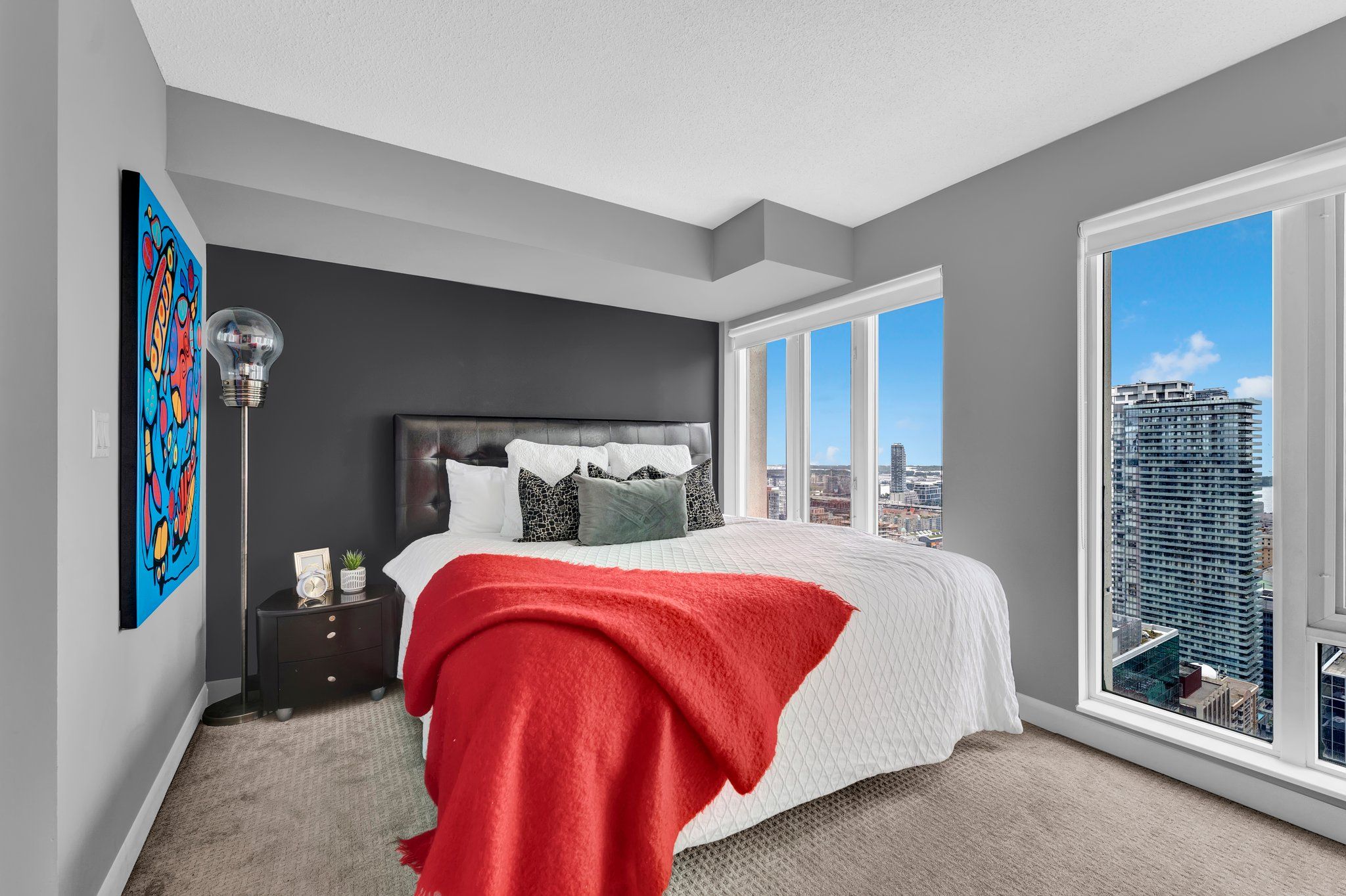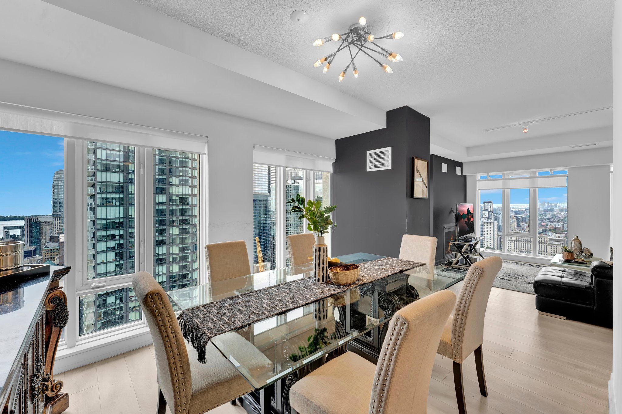 Experience downtown living in this rare 2-storey, 3-bedroom, 3-bath suite at the prestigious pantages tower. Perched on the 44th floor, it features unobstructed southwest views, abundant natural light, and spacious bedrooms with large windows. Located in the heart of the city, you're just steps to dundas square, the eaton centre, u of t, tmu, st. Michael's hospital, subway stations, and more. The building offers a 24-hour concierge and a lounge on the lower level.