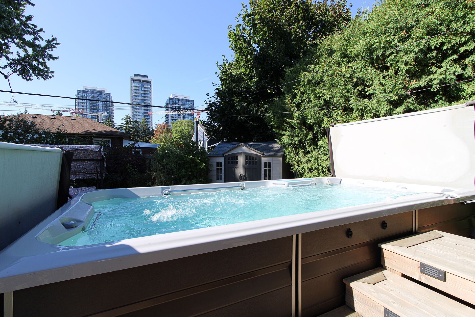 • Backyard includes a 16 Swim Spa and a gazebo for relaxation.