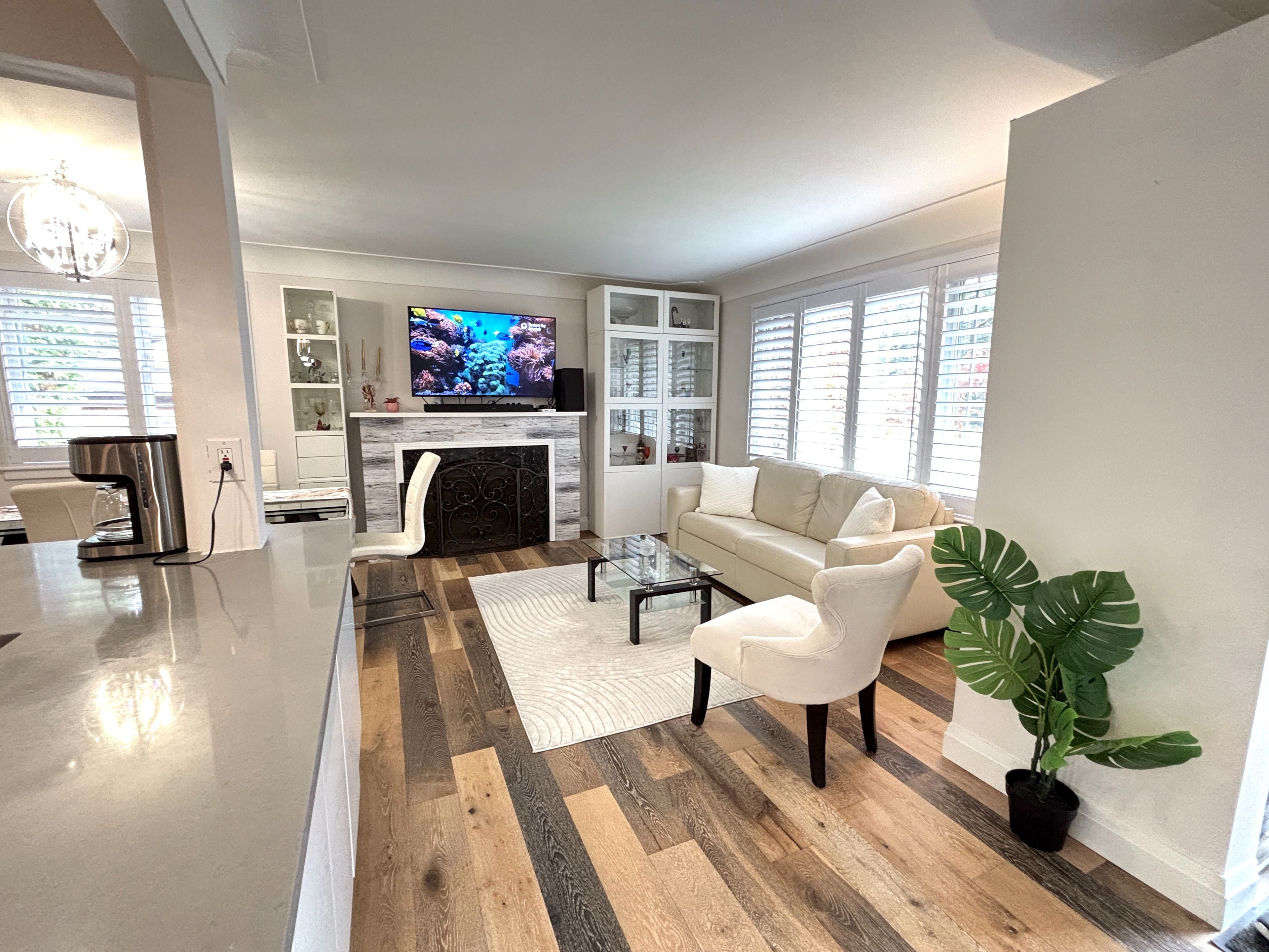 • Custom kitchen features stainless steel appliances and quartz countertops.