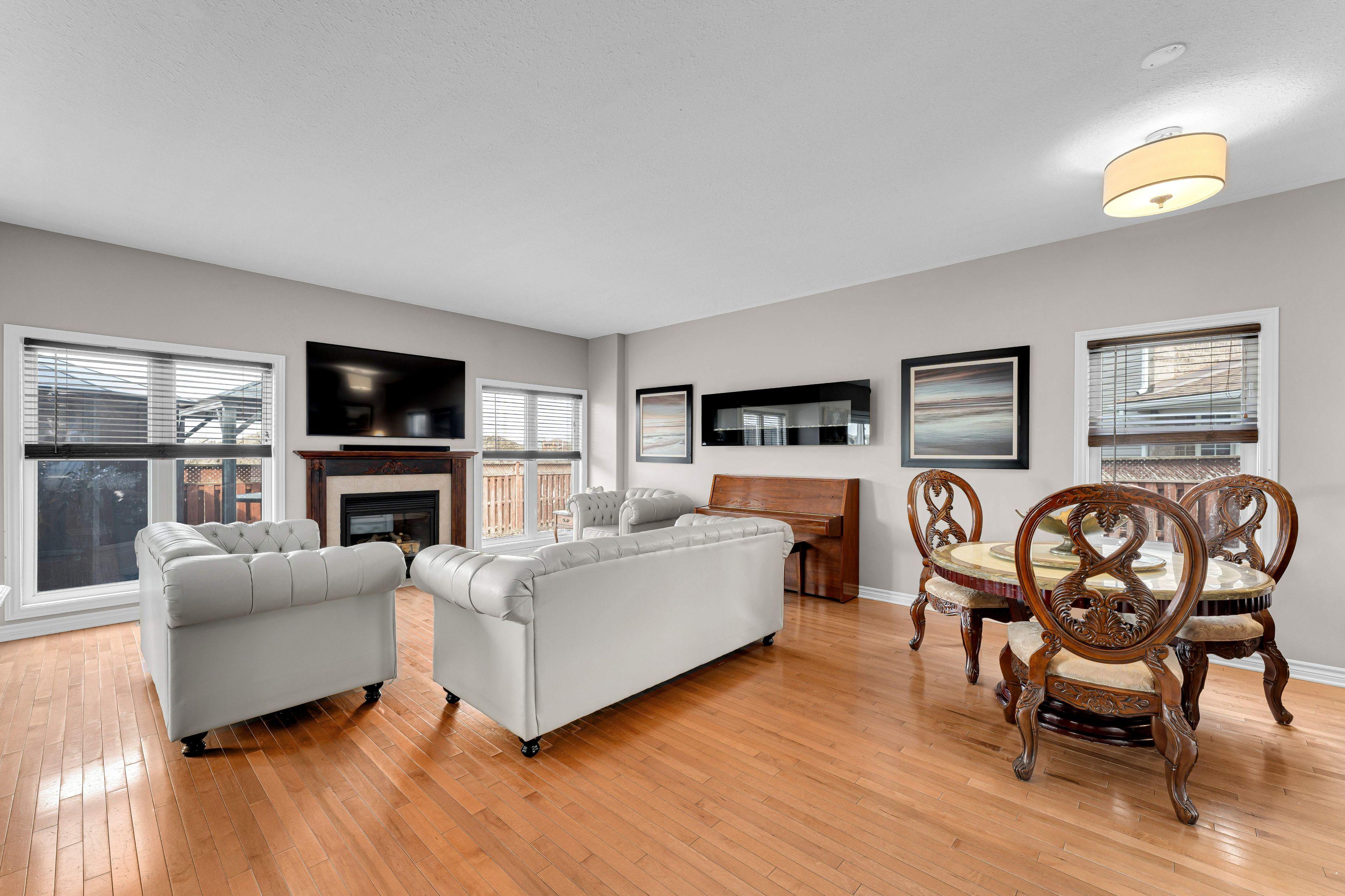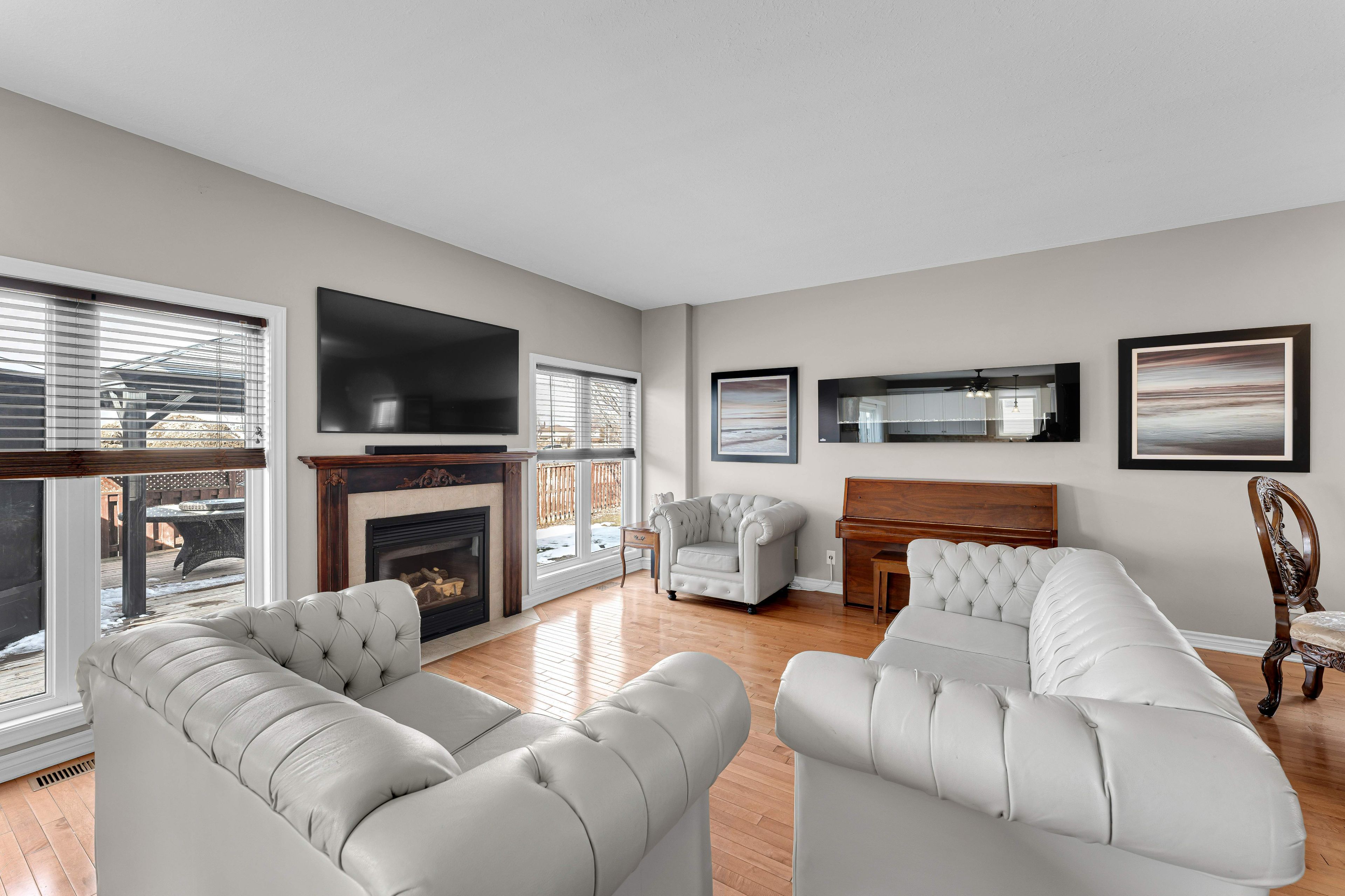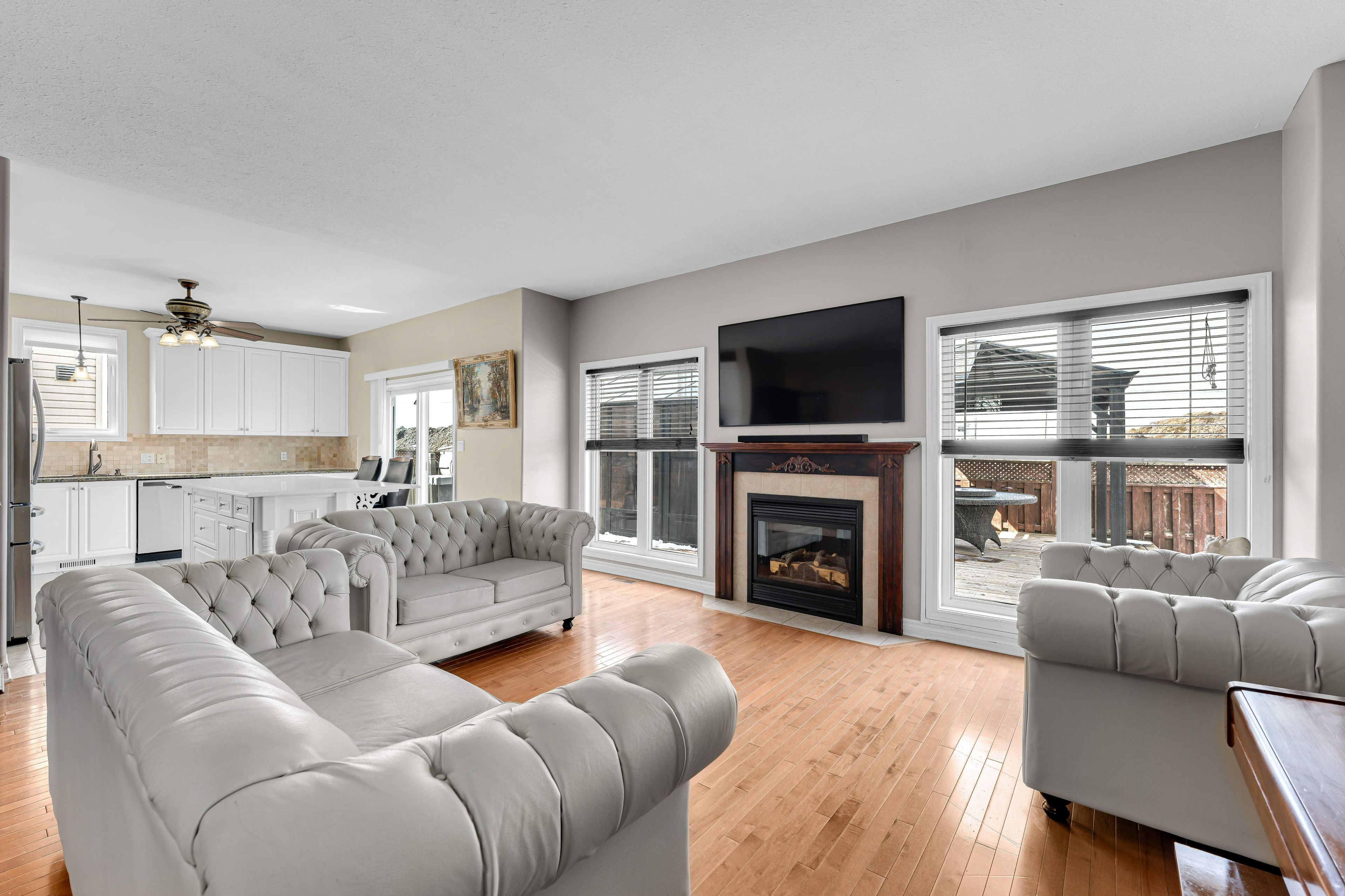 • Open-concept living area with abundant natural light and a gas fireplace.