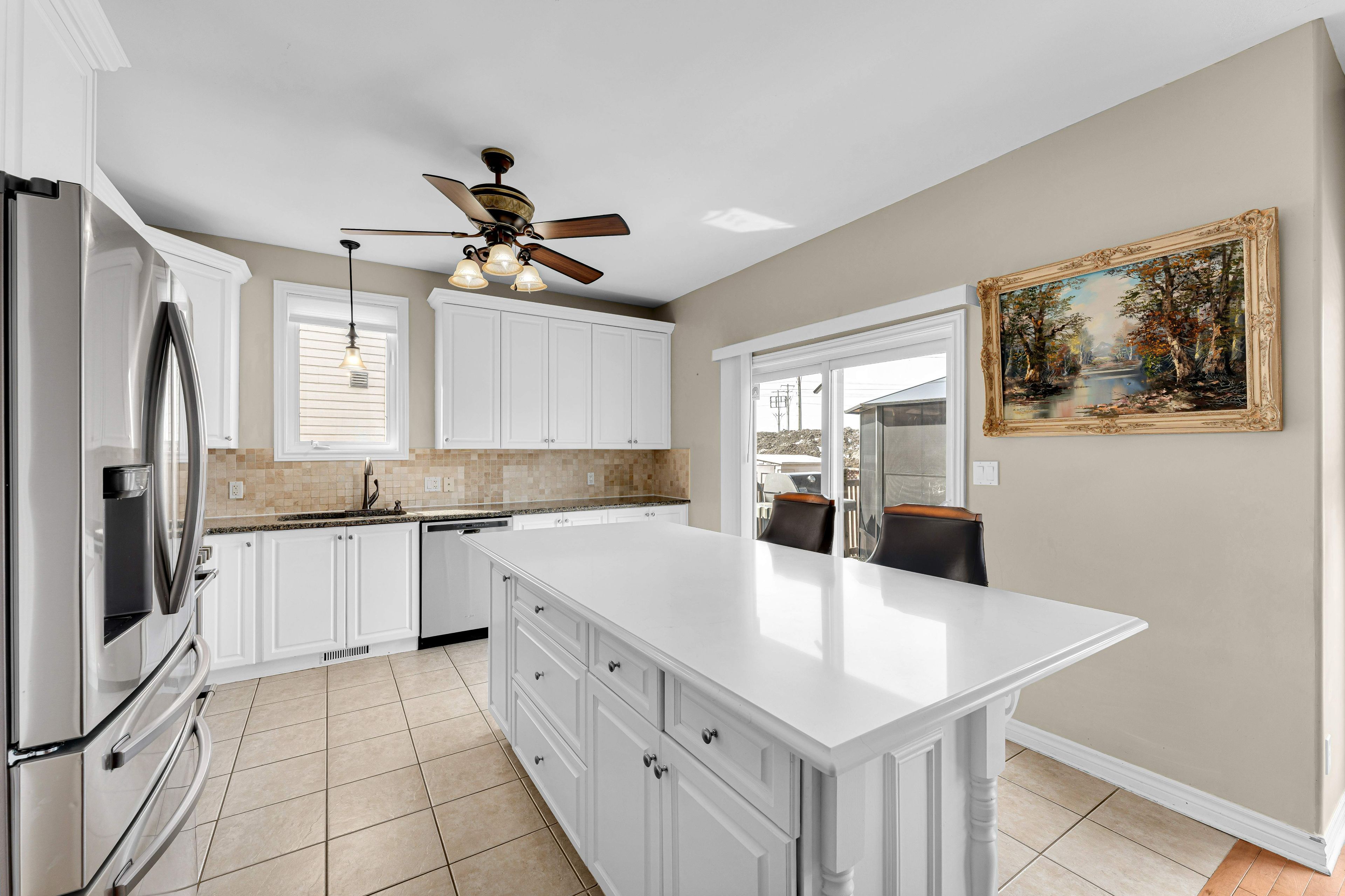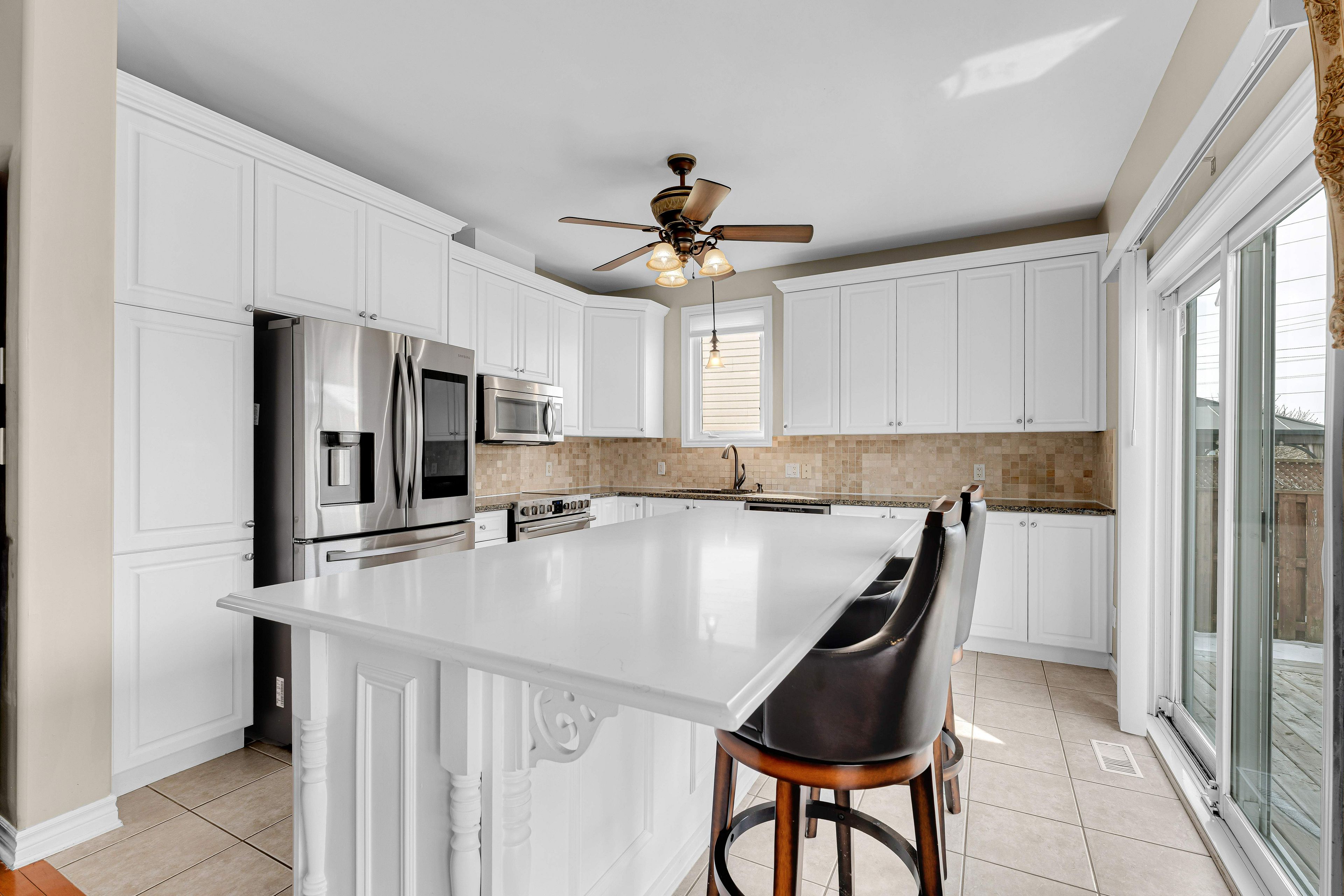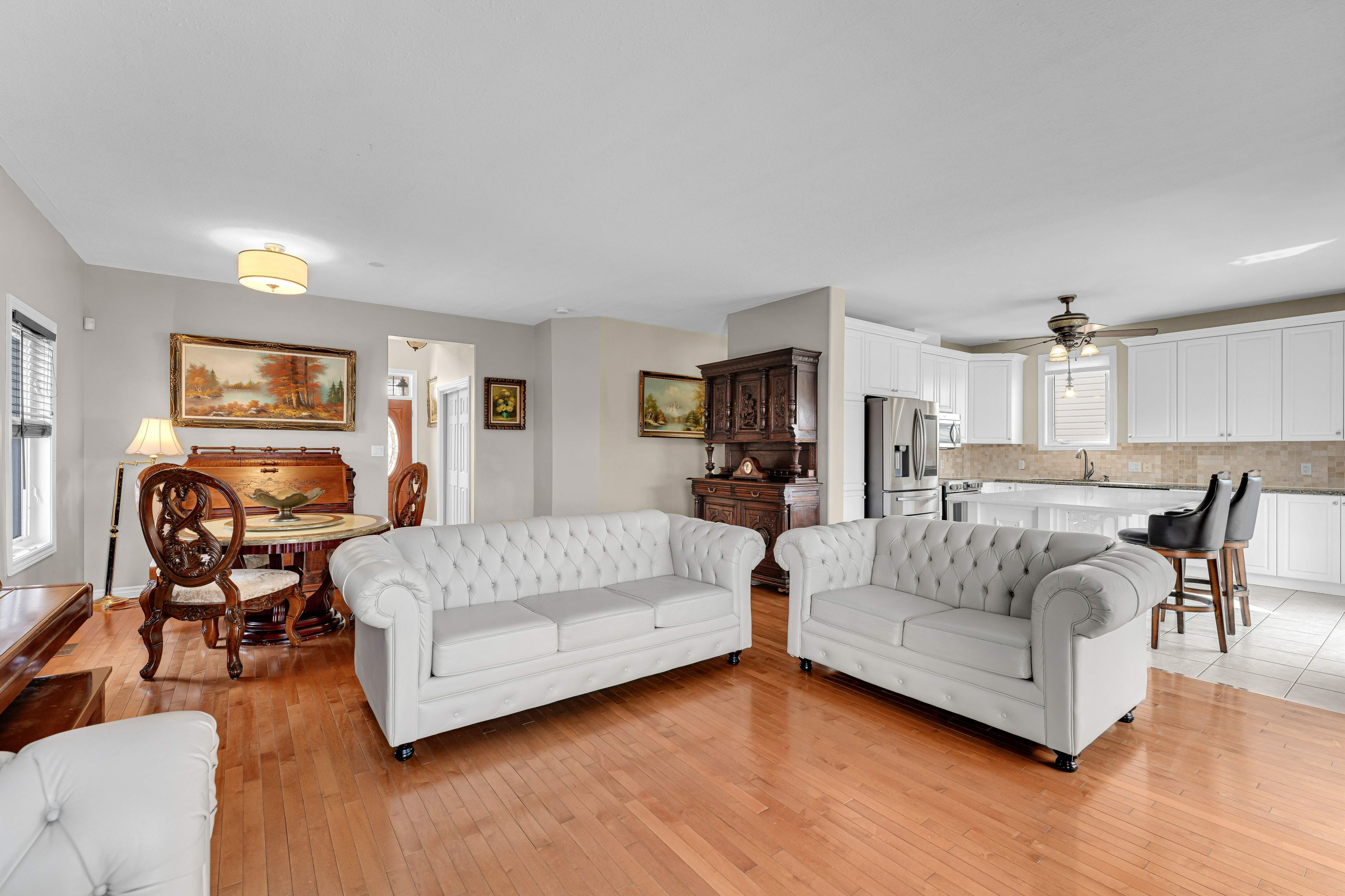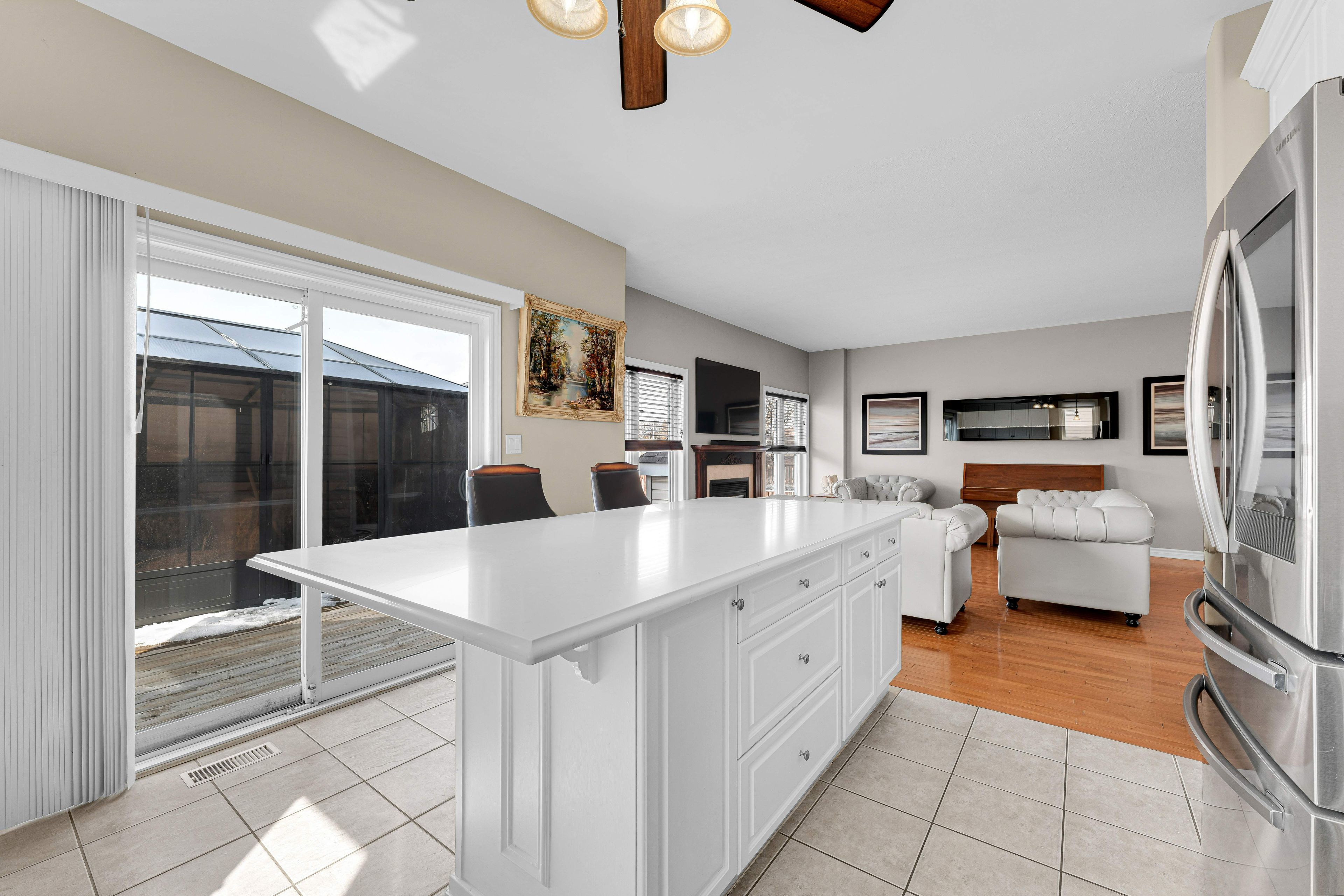 • Open-concept living area with abundant natural light and a gas fireplace.