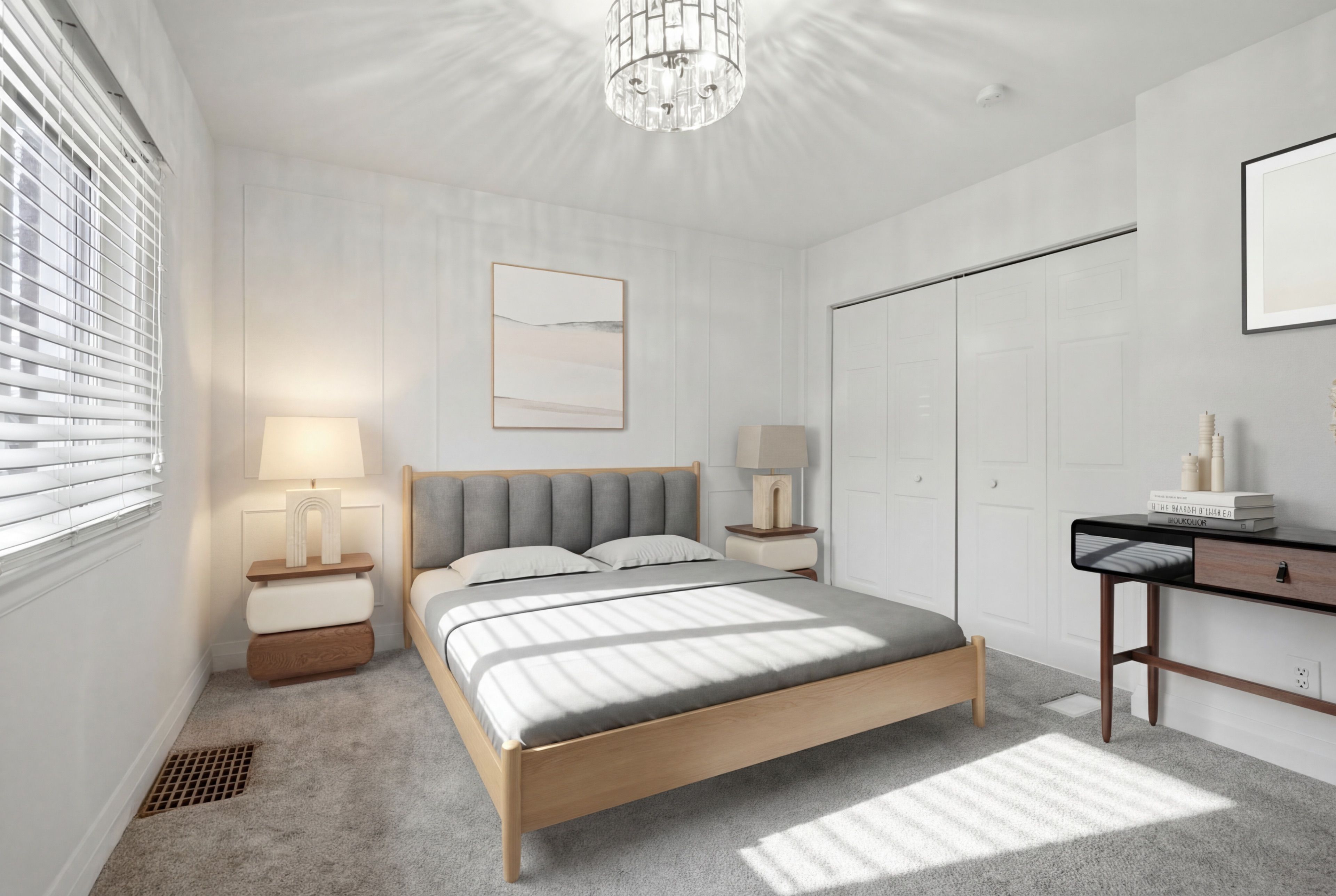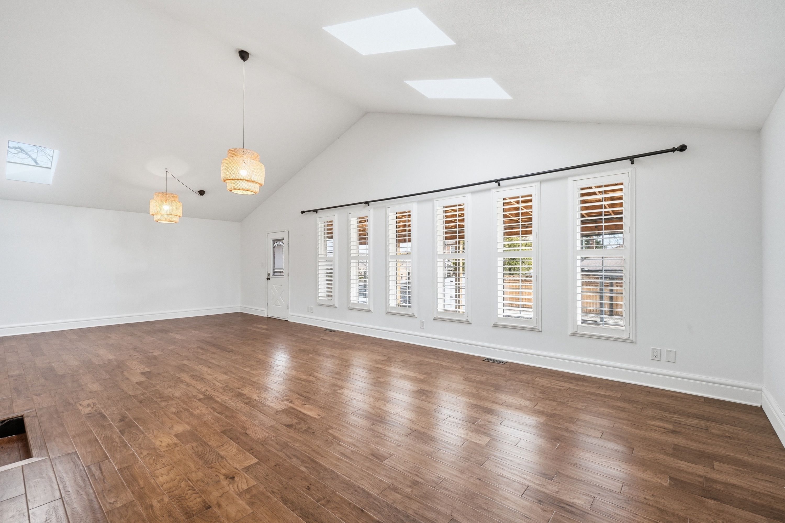 • Spacious living and dining area with natural light from skylights.
